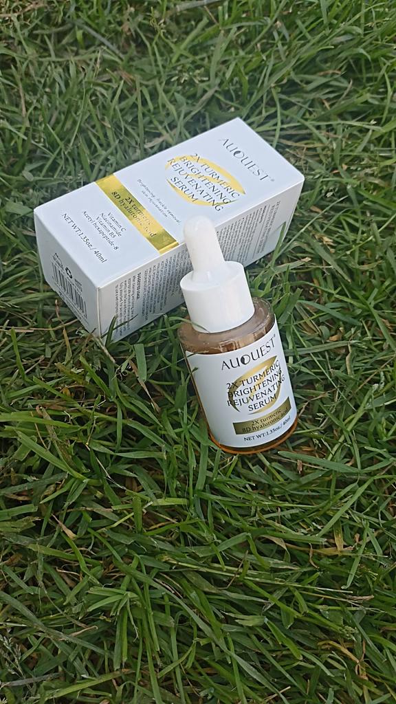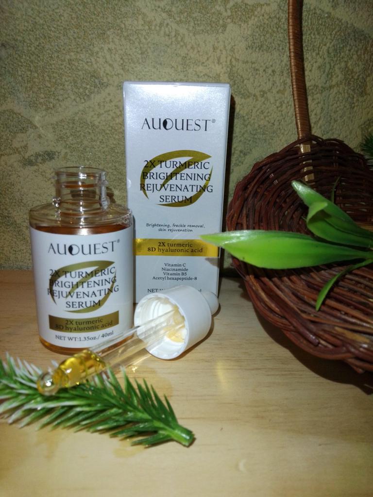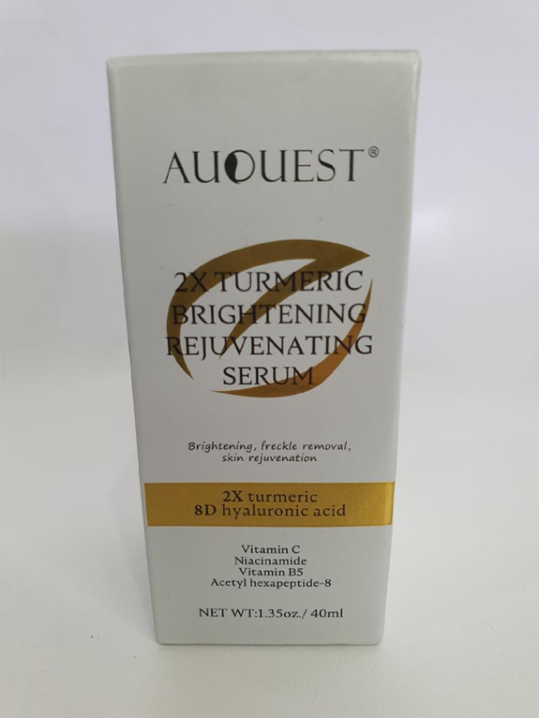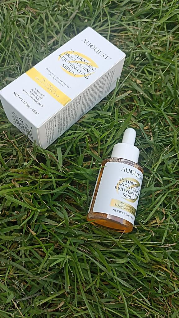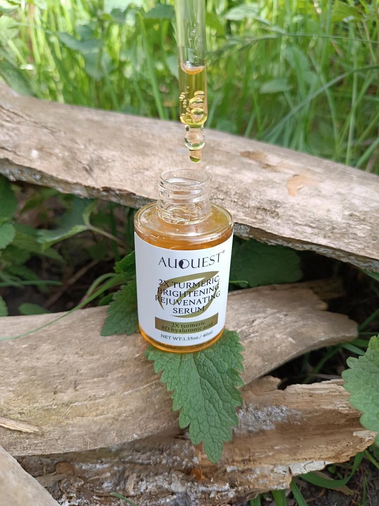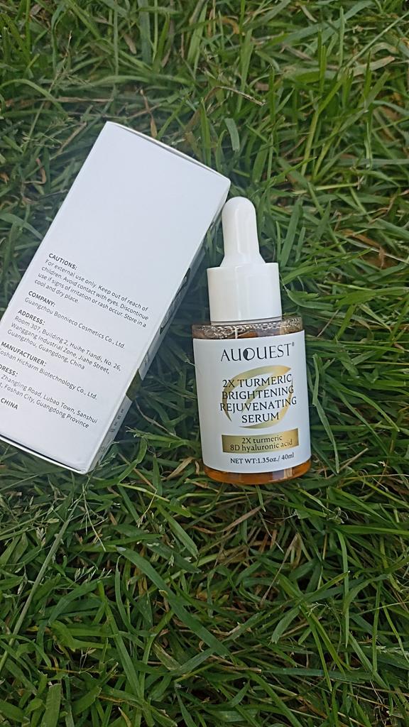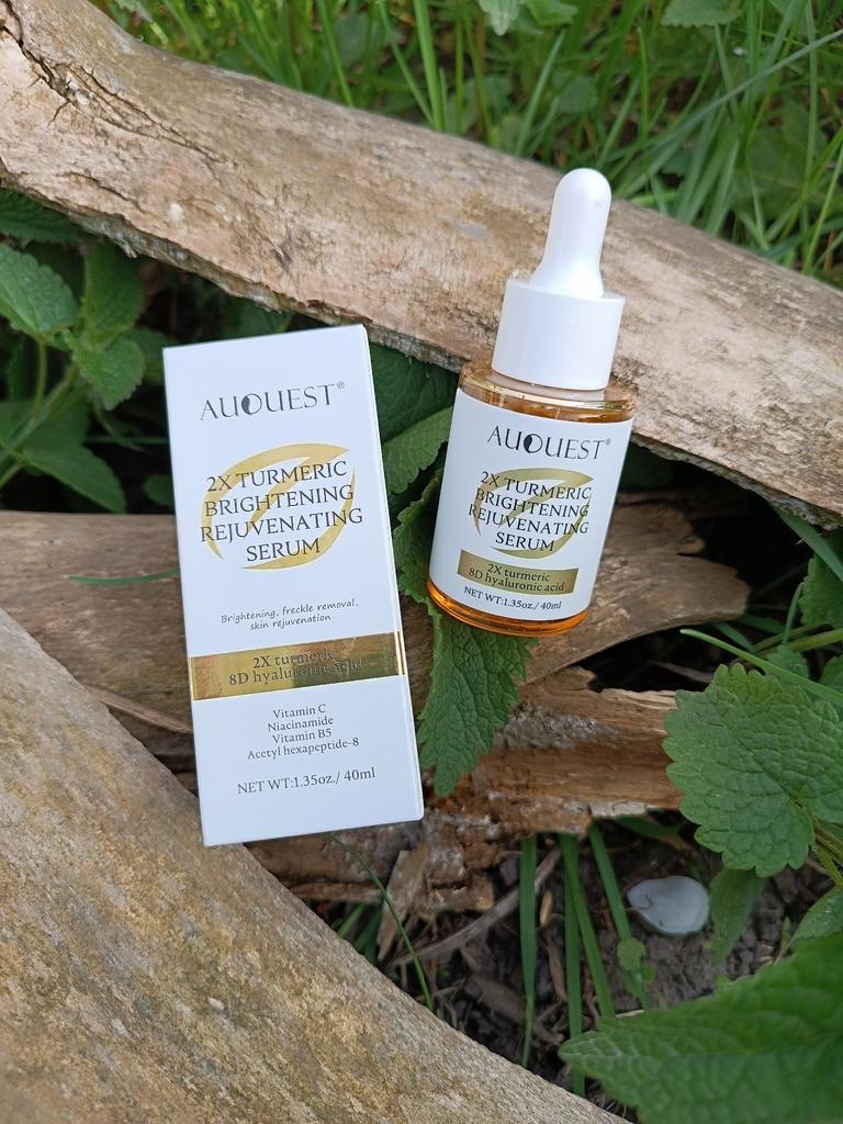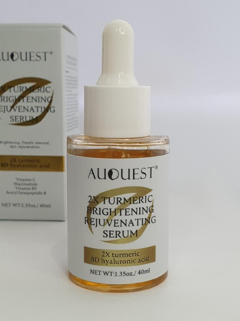 Sérum AUQUEST 2X Turmeric Brightening Rejuvenating Serum, které obsahuje kurkumu a kyselinu hyaluronovou. Název produktu: AUQUEST 2X Kurkumové rozjasňující omlazující sérum. Hlavní složky: 2X kurkuma a 8D kyselina hyaluronová Upozornění: Pouze pro vnější použití, uchovávejte mimo dosah dětí, vyhněte se kontaktu s očima.