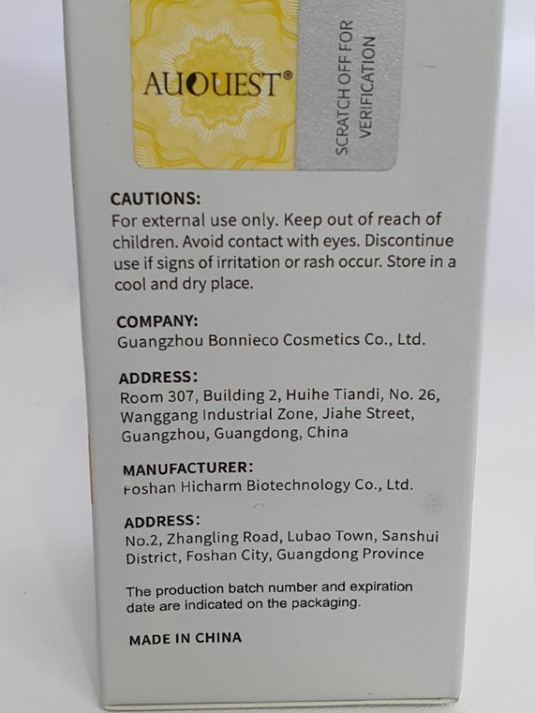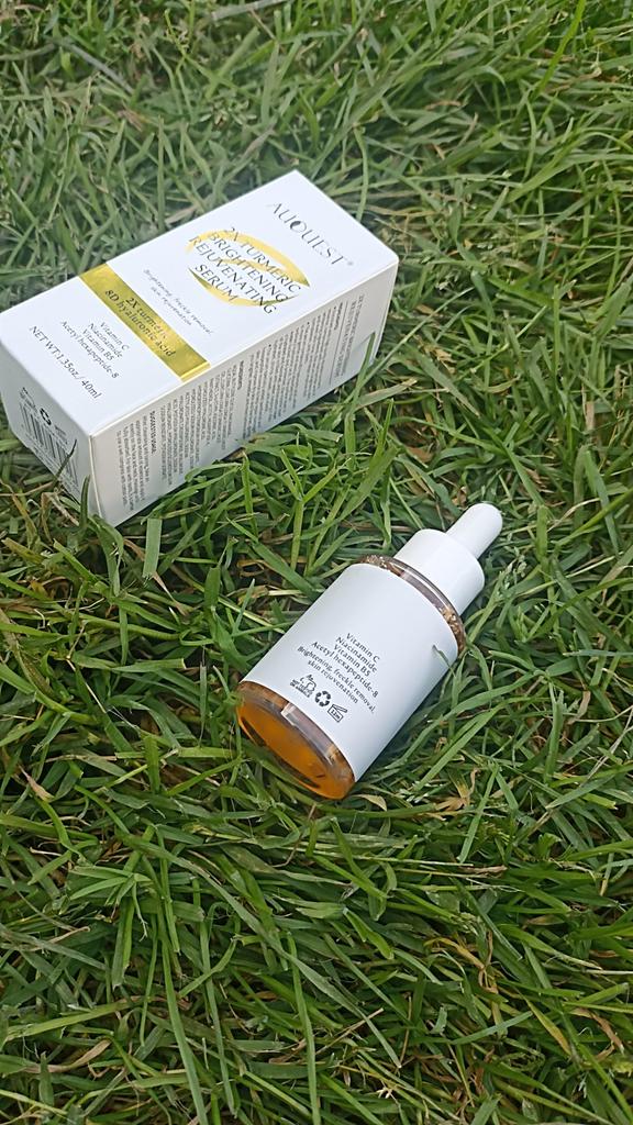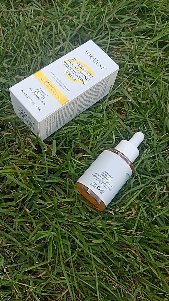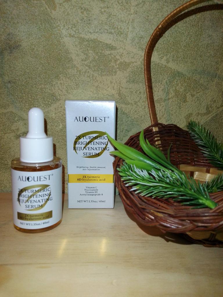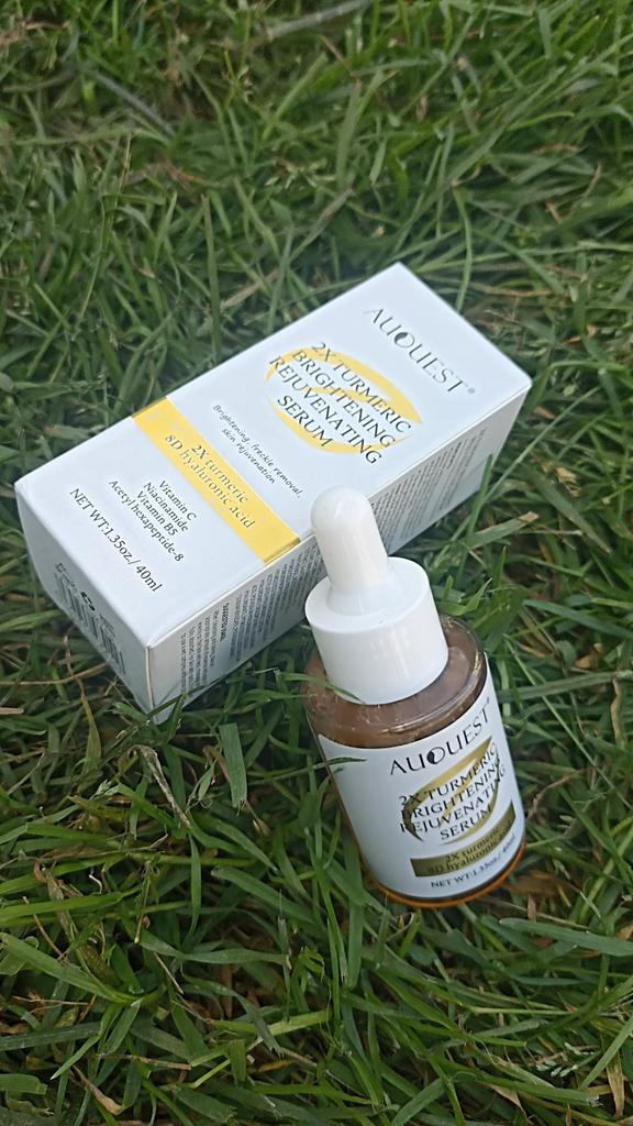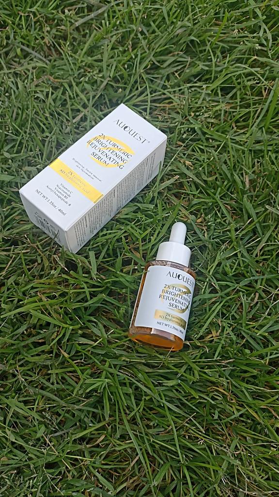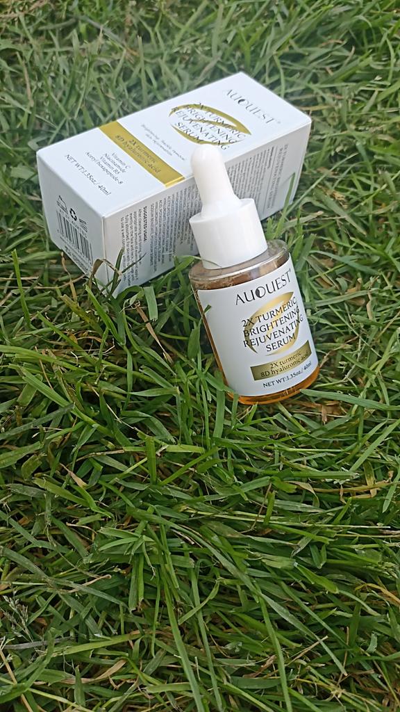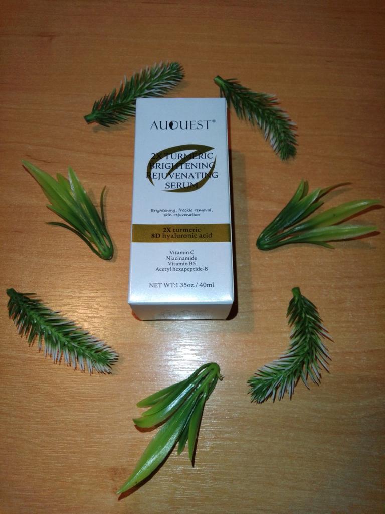 Sérum AUQUEST 2X Turmeric Brightening Rejuvenating Serum, které obsahuje kurkumu a kyselinu hyaluronovou. Název produktu: AUQUEST 2X Kurkumové rozjasňující omlazující sérum. Hlavní složky: 2X kurkuma a 8D kyselina hyaluronová Upozornění: Pouze pro vnější použití, uchovávejte mimo dosah dětí, vyhněte se kontaktu s očima.