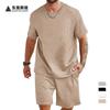 The men's two-piece set features a short-sleeved top and elastic-waisted shorts, designed for a casual and comfortable fit that complements various body shapes.