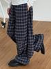 Retro Navy Blue Plaid Wide-leg Pants for Women In Spring and Summer Contrast Loose and Lazy Style Draped Straight-leg Casual Pants