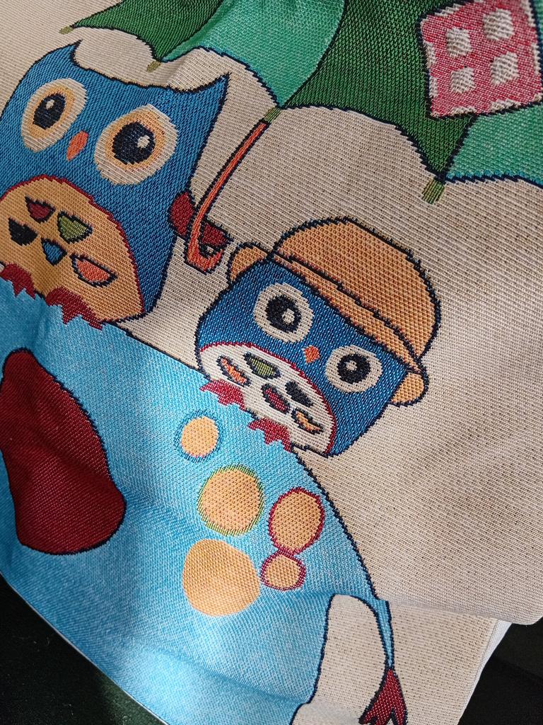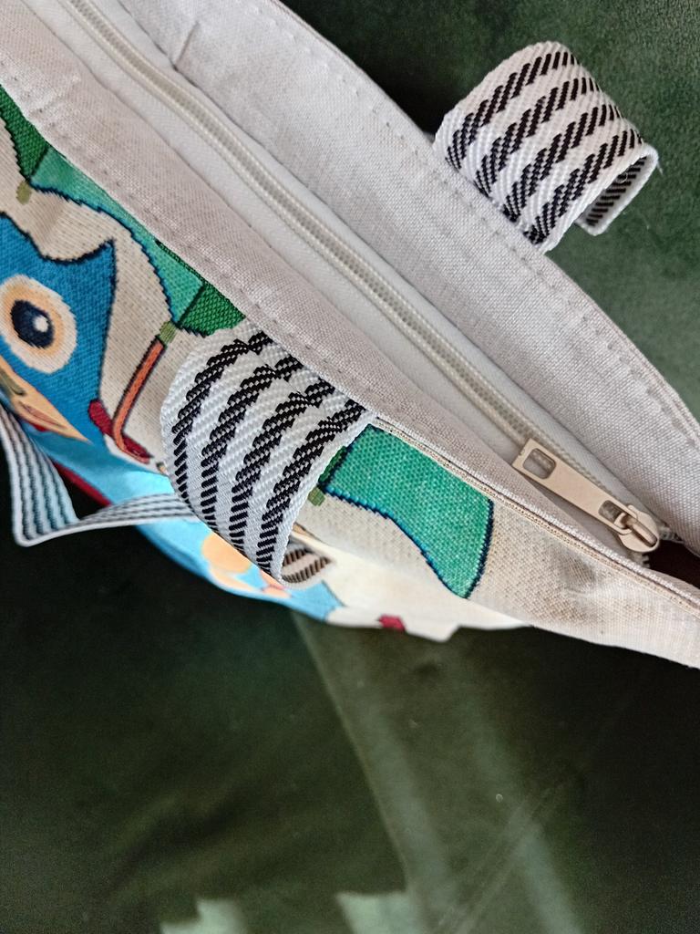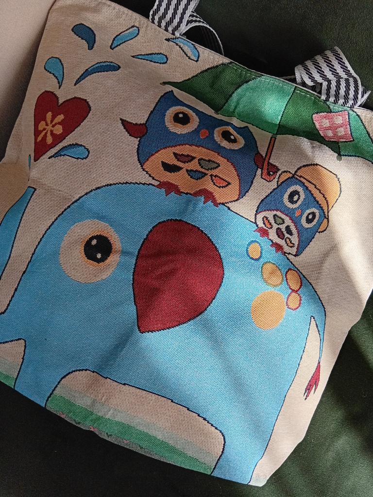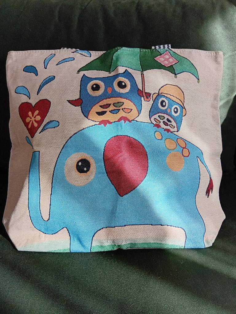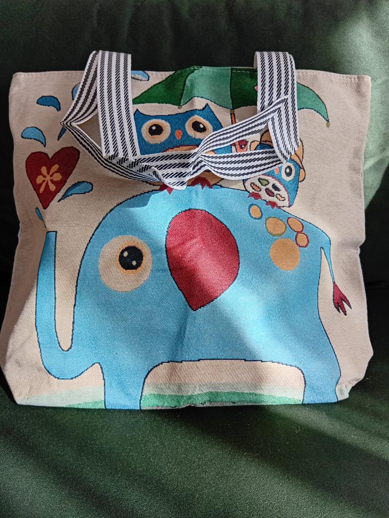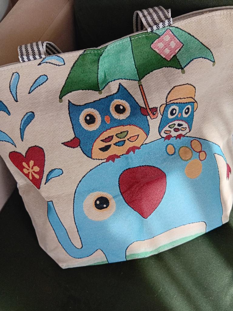 Nákupní taška s roztomilými obrázky 🐘🦉 Lze použít jako plážovou. Komfortní. Kvalita je výborná, šitá velmi pečlivě. Plátěná látka, uvnitř balonová. Velikost 44*40*9 ю Výborné, doporučuji!