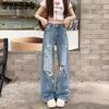 Comfortable Blue Vintage Broken Holes Wide Leg Jeans Women High Waist Thin Drapey Straight Trailing Floor Trousers Jeans for Women Long Denim Pants