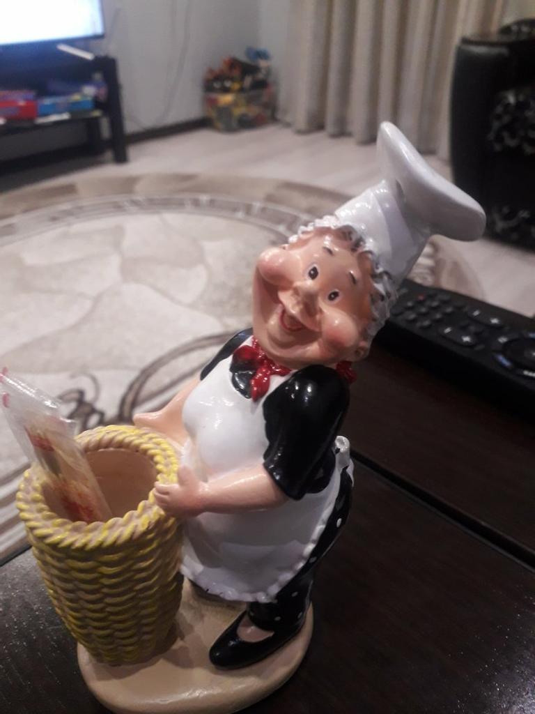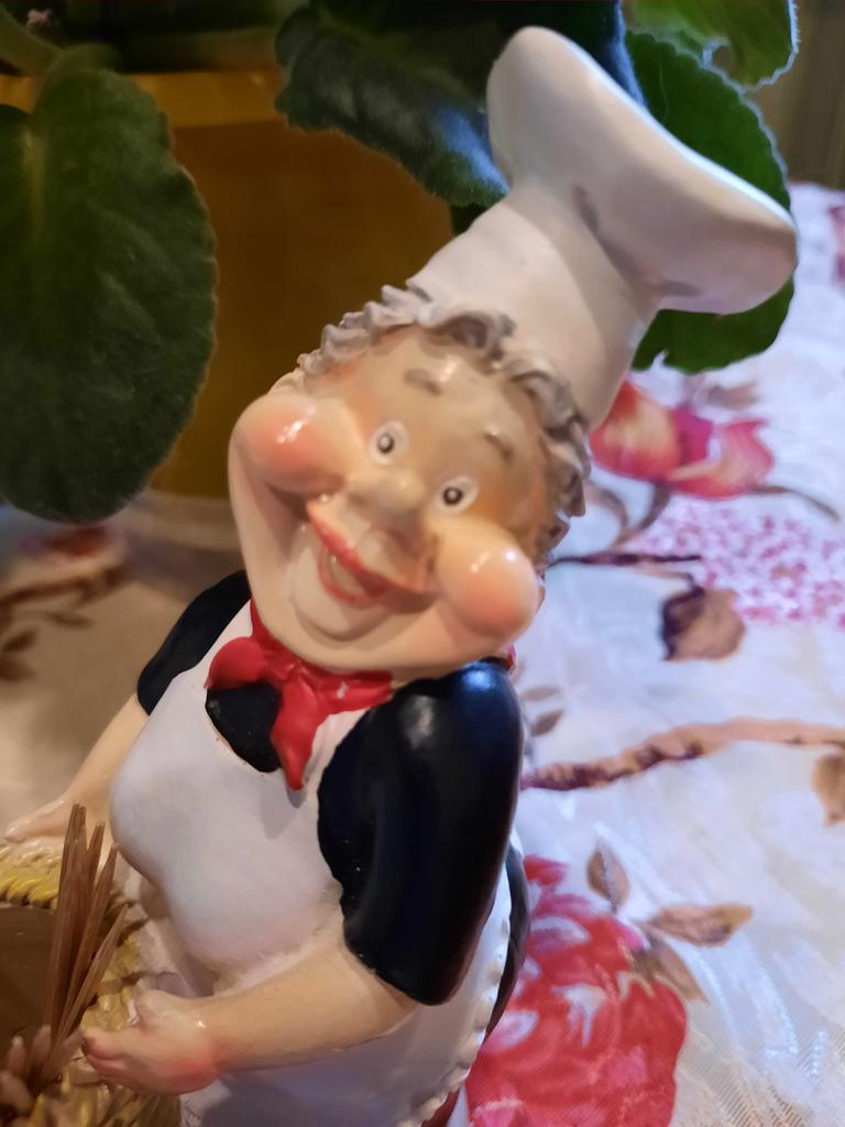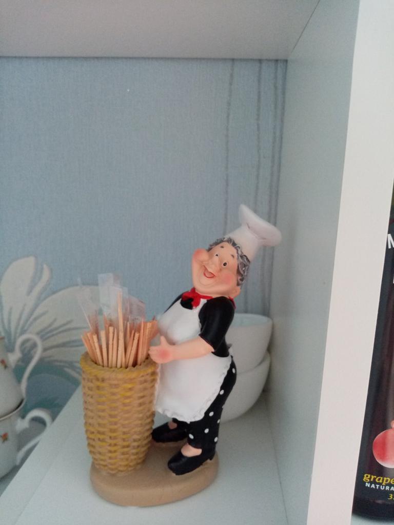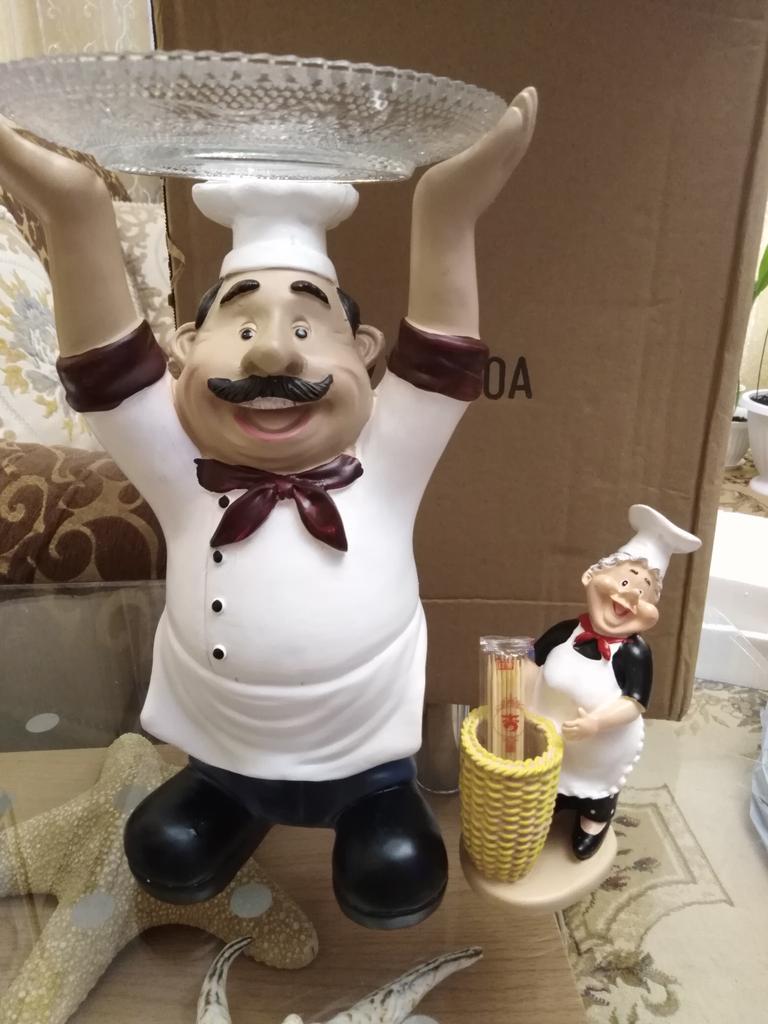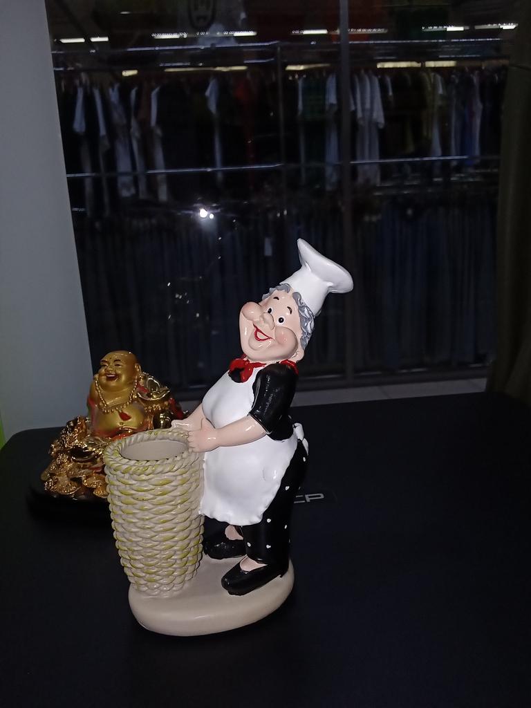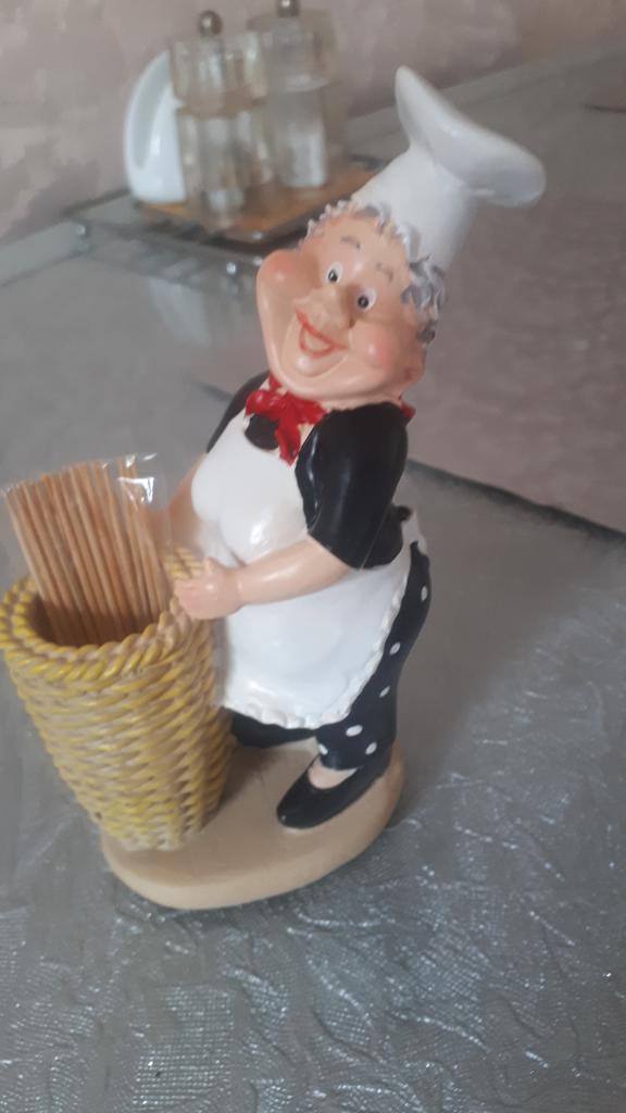 Cute cook! She fits into the ensemble with the chef holding a bottle cart. I recommend to buy!