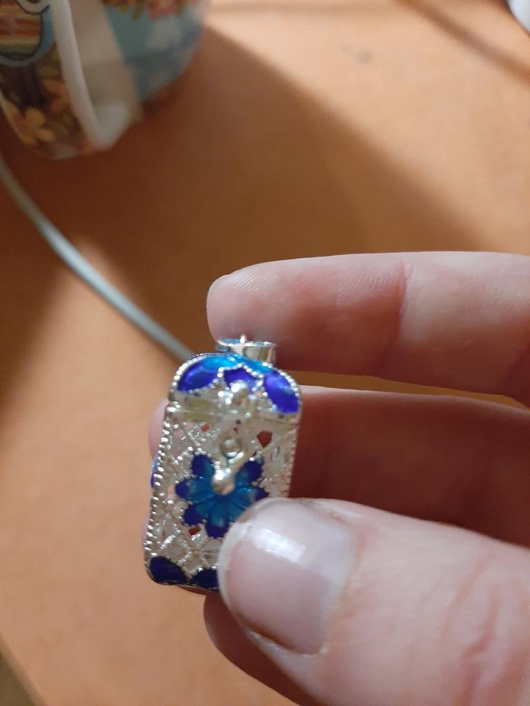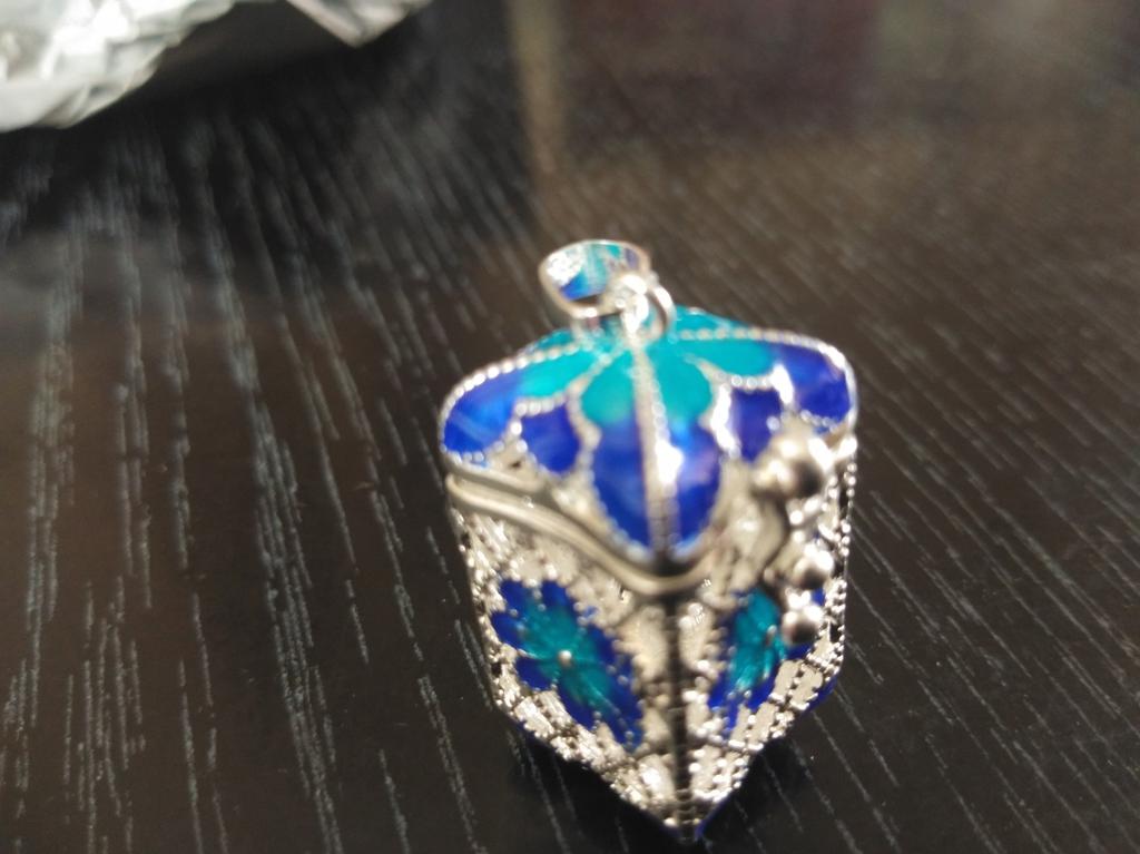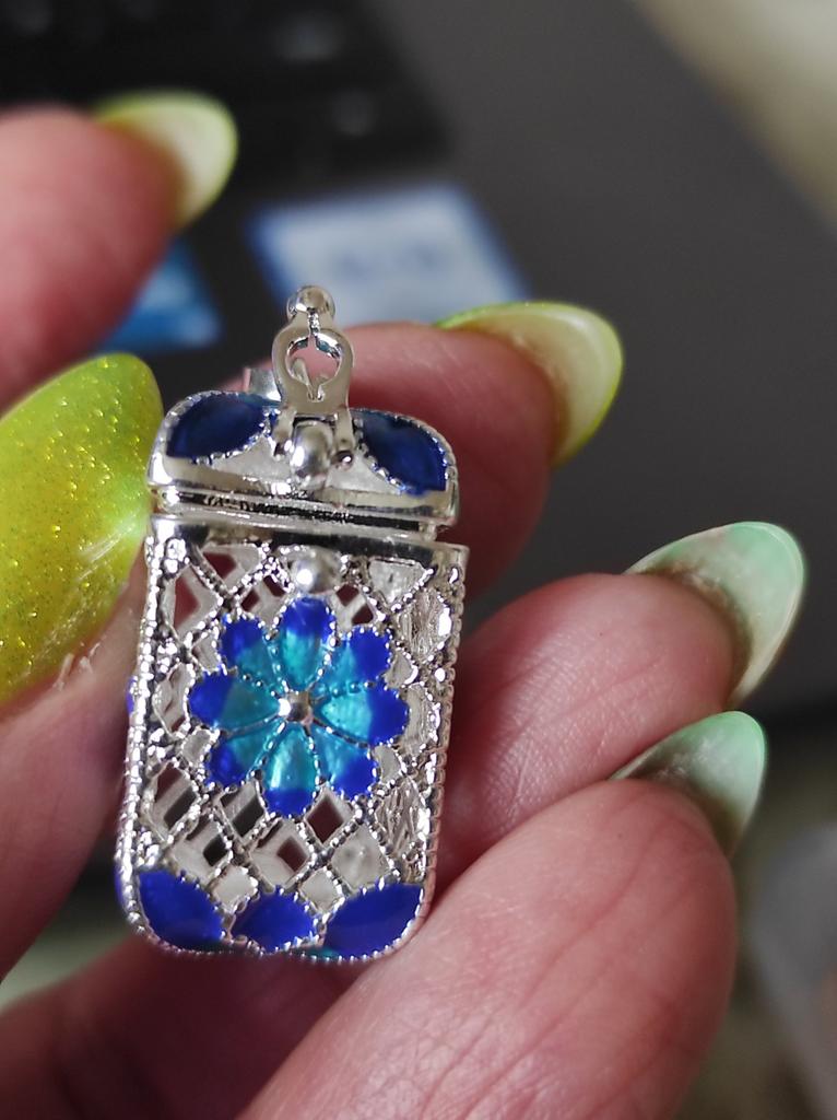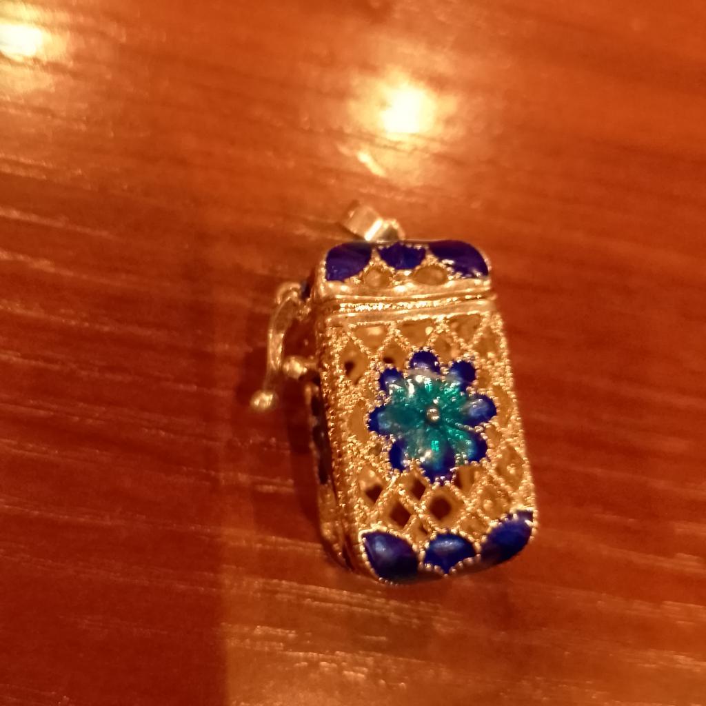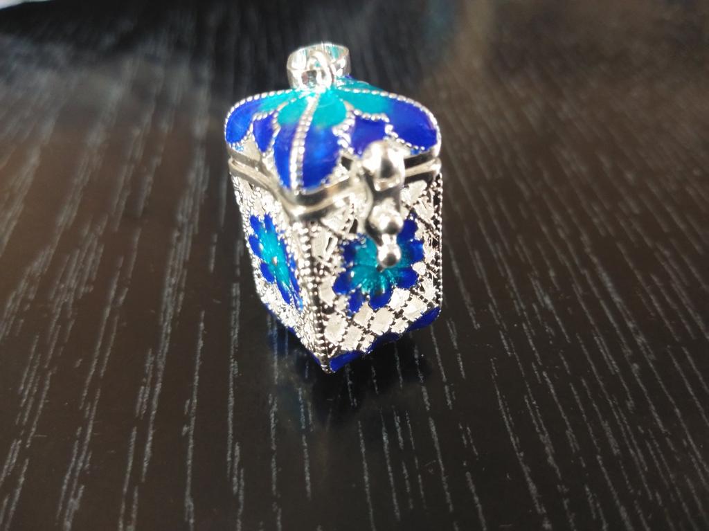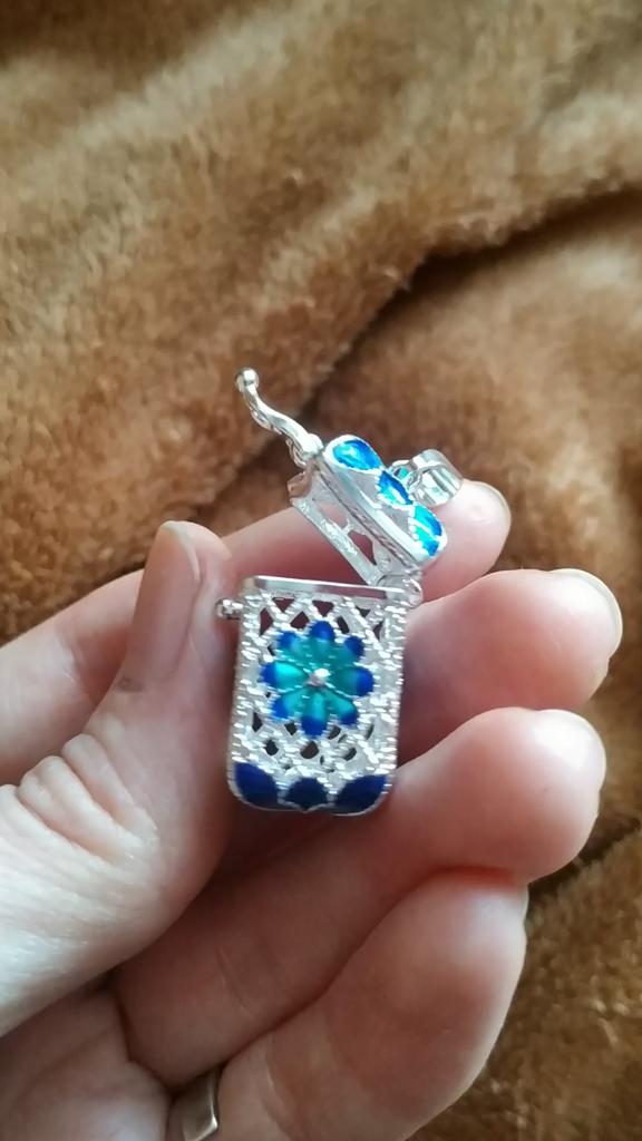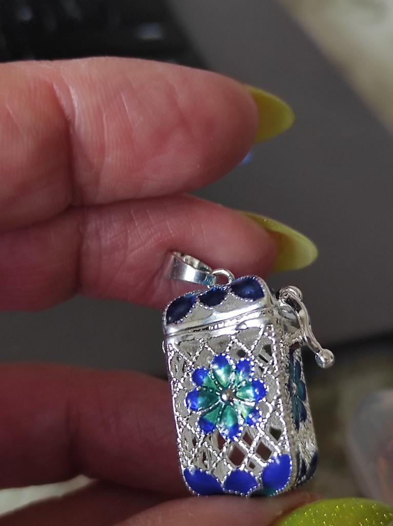 Pretty aroma pendant, quite roomy. The lid works. Silver color. I like.