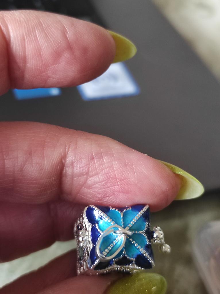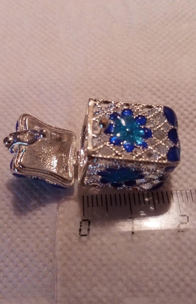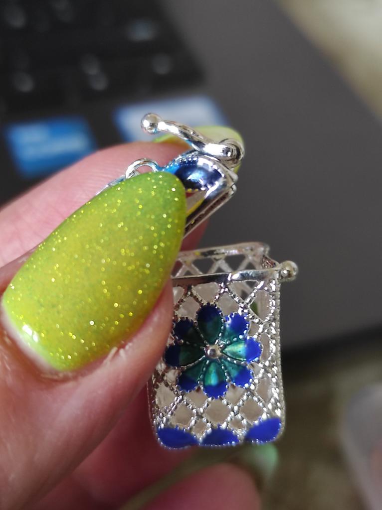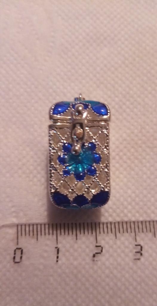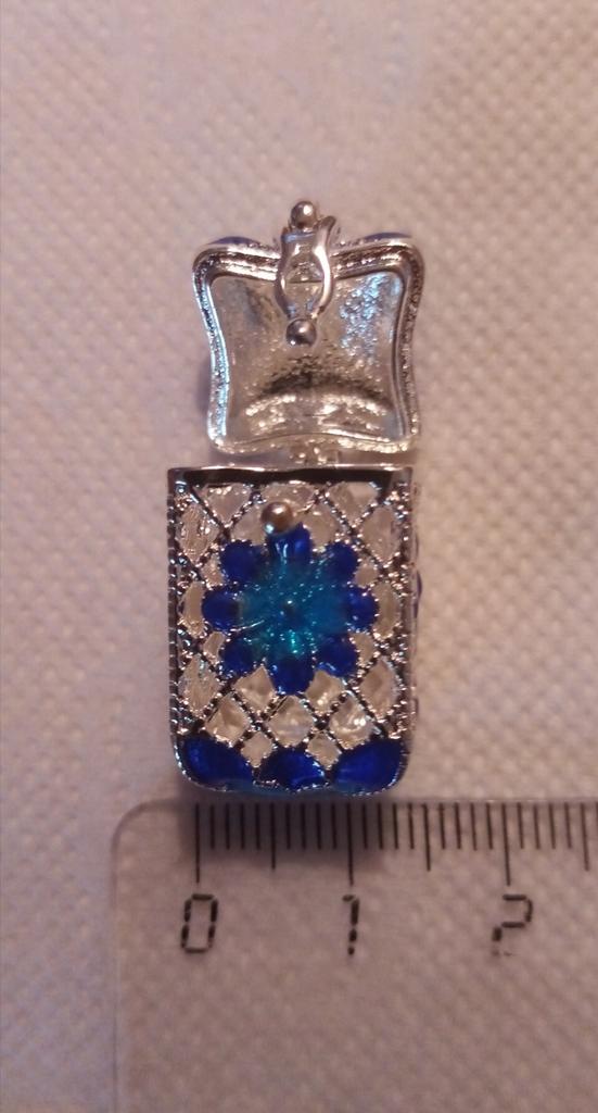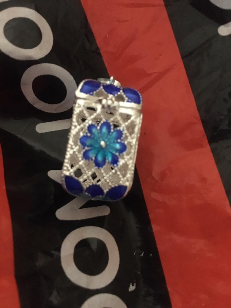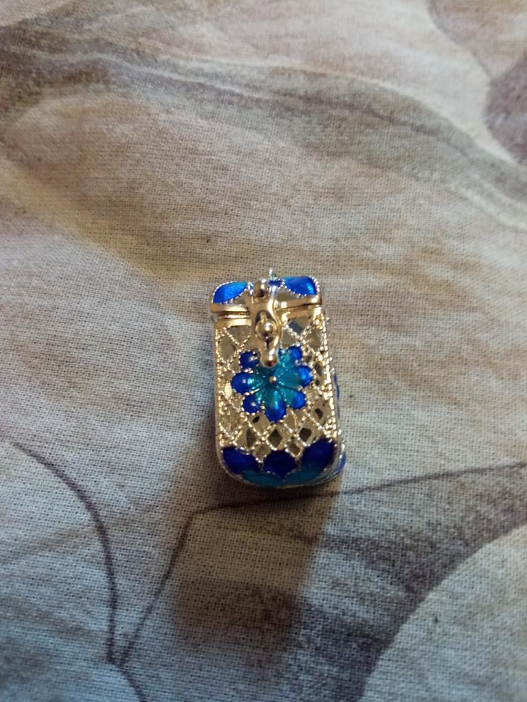 Pretty aroma pendant, quite roomy. The lid works. Silver color. I like.