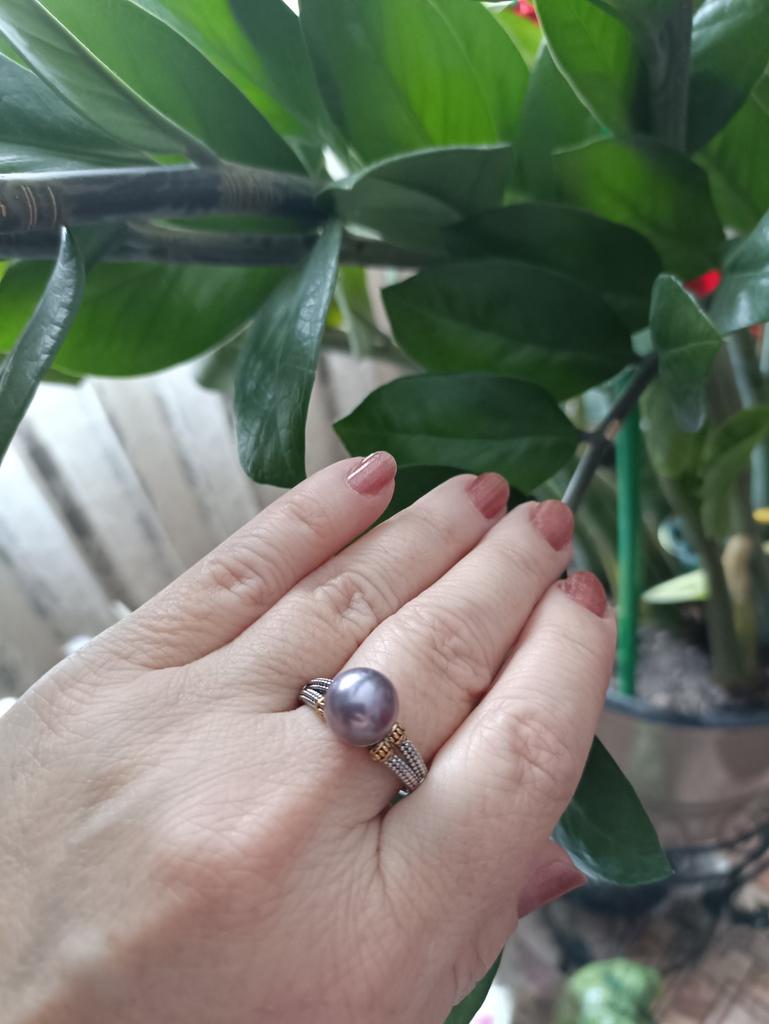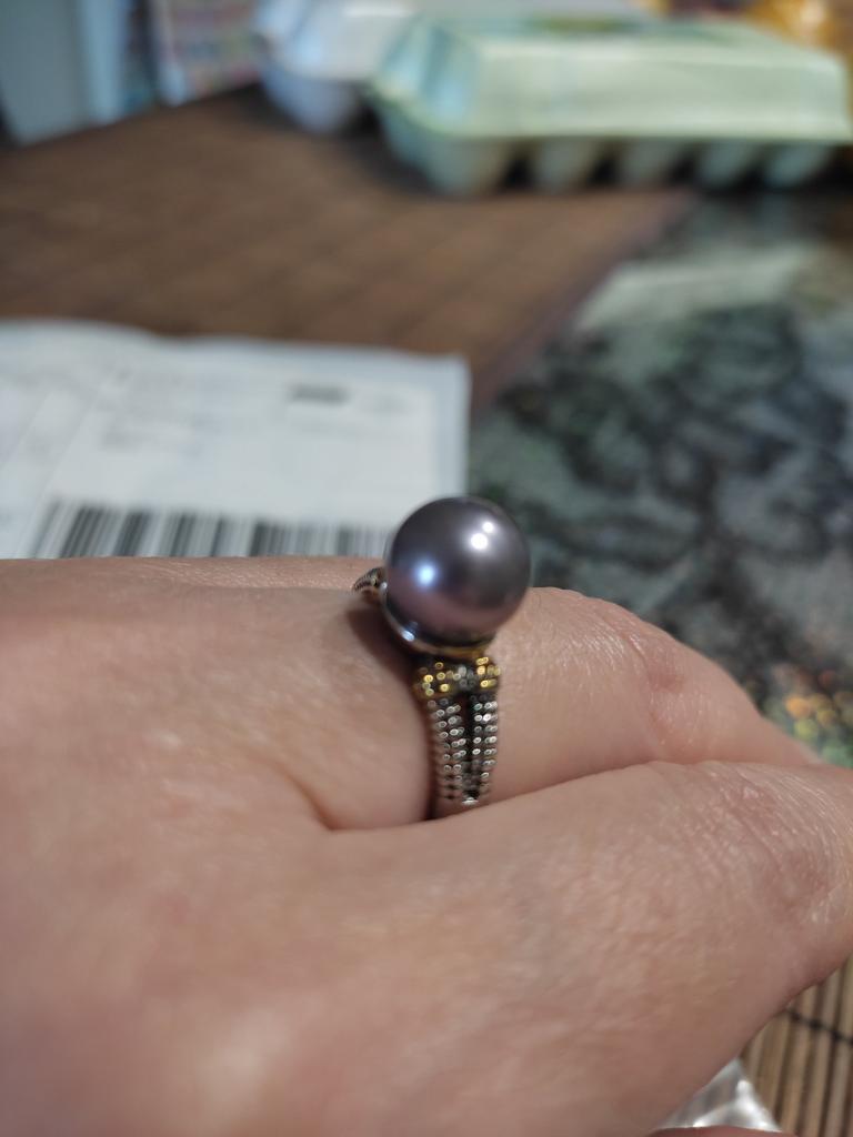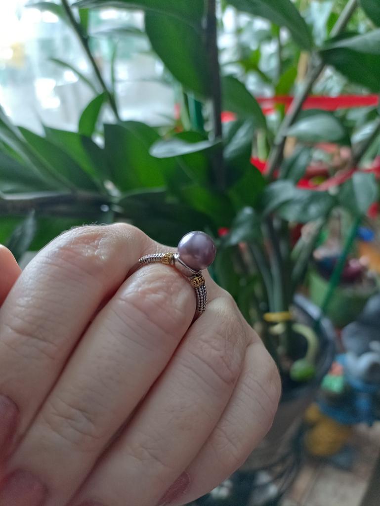 A wonderful ring, the right size. The shank is two colors, so it harmonizes well with both gold and silver. BUT: the pearl fell off on the very first day ((((
