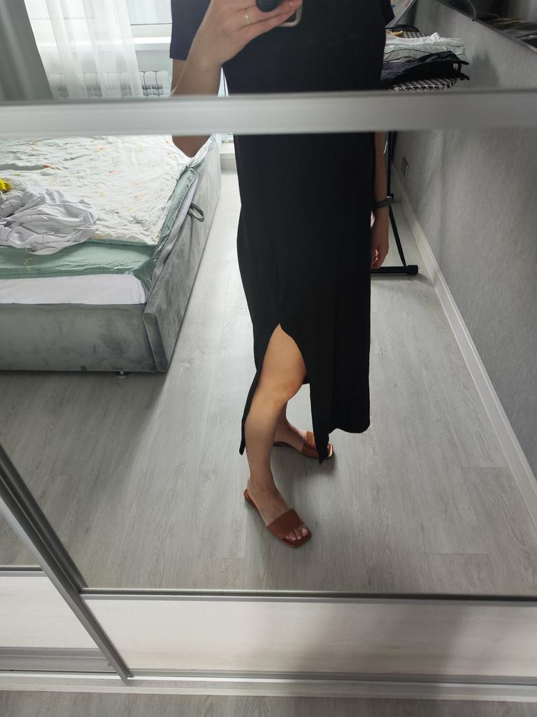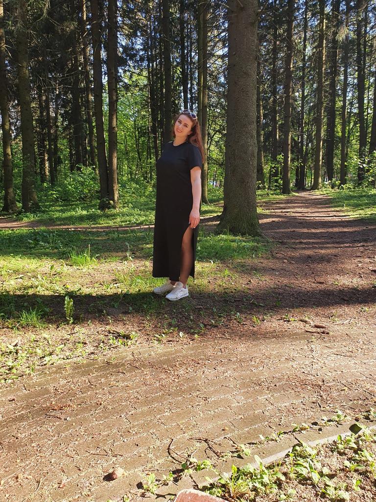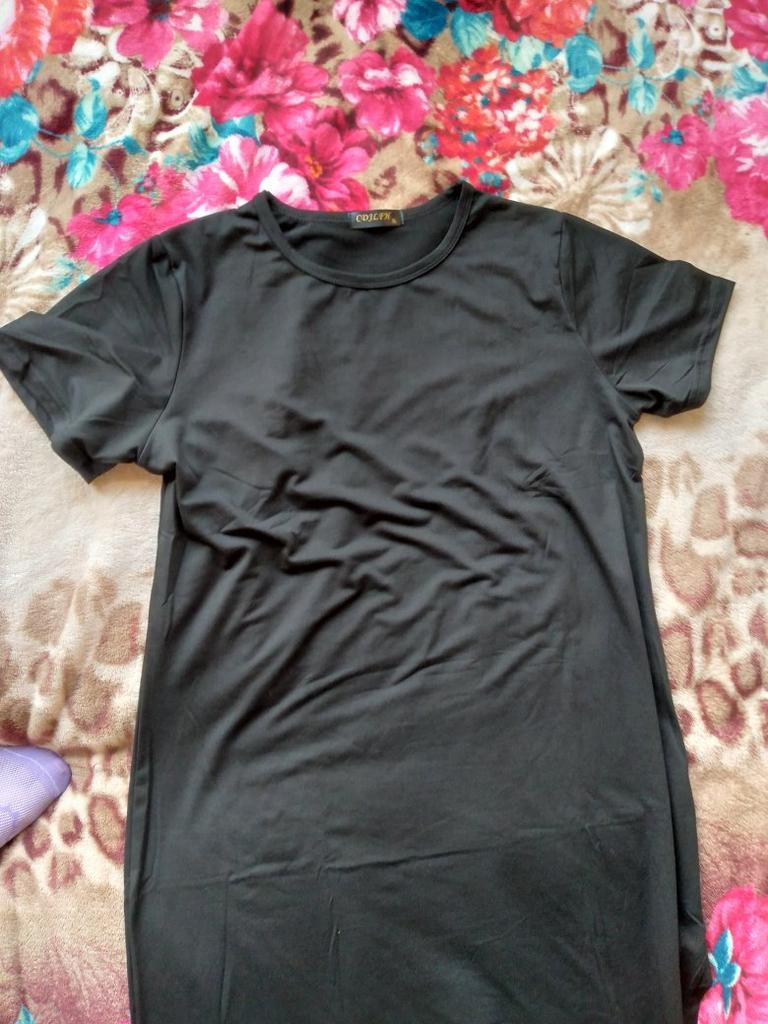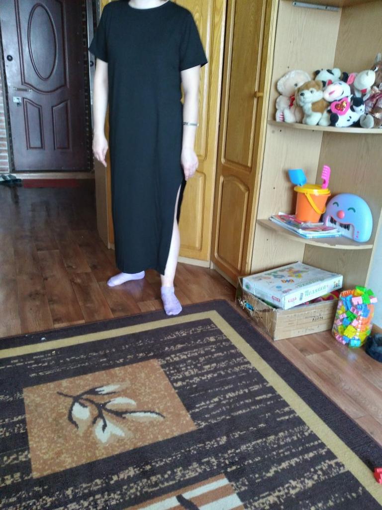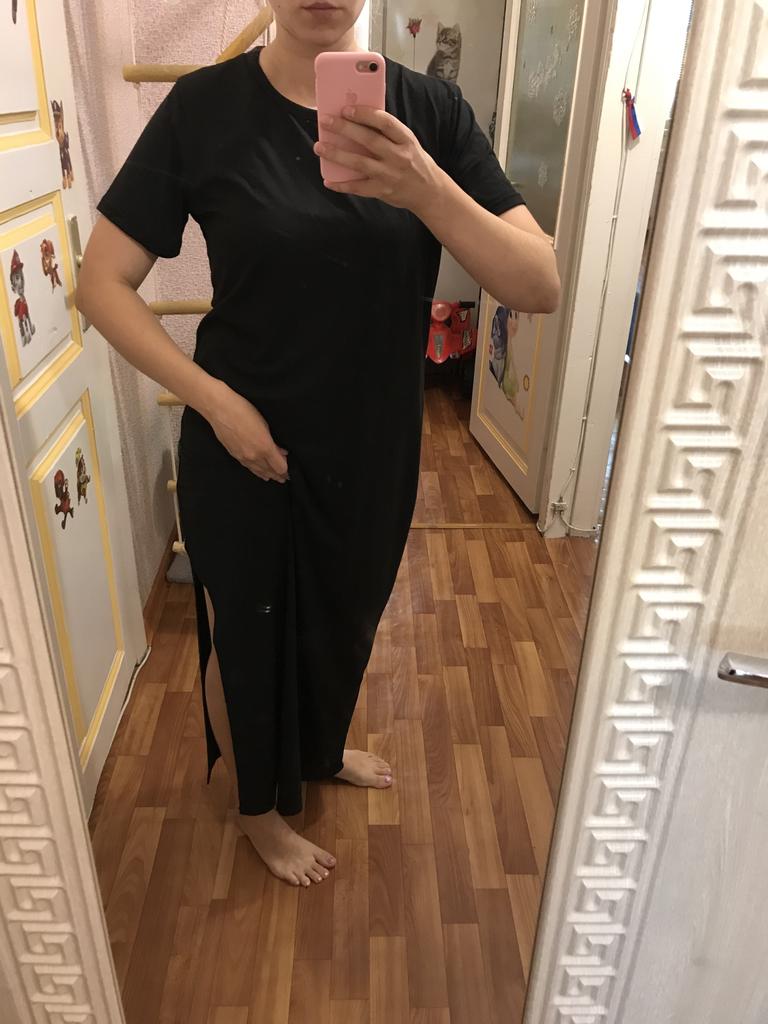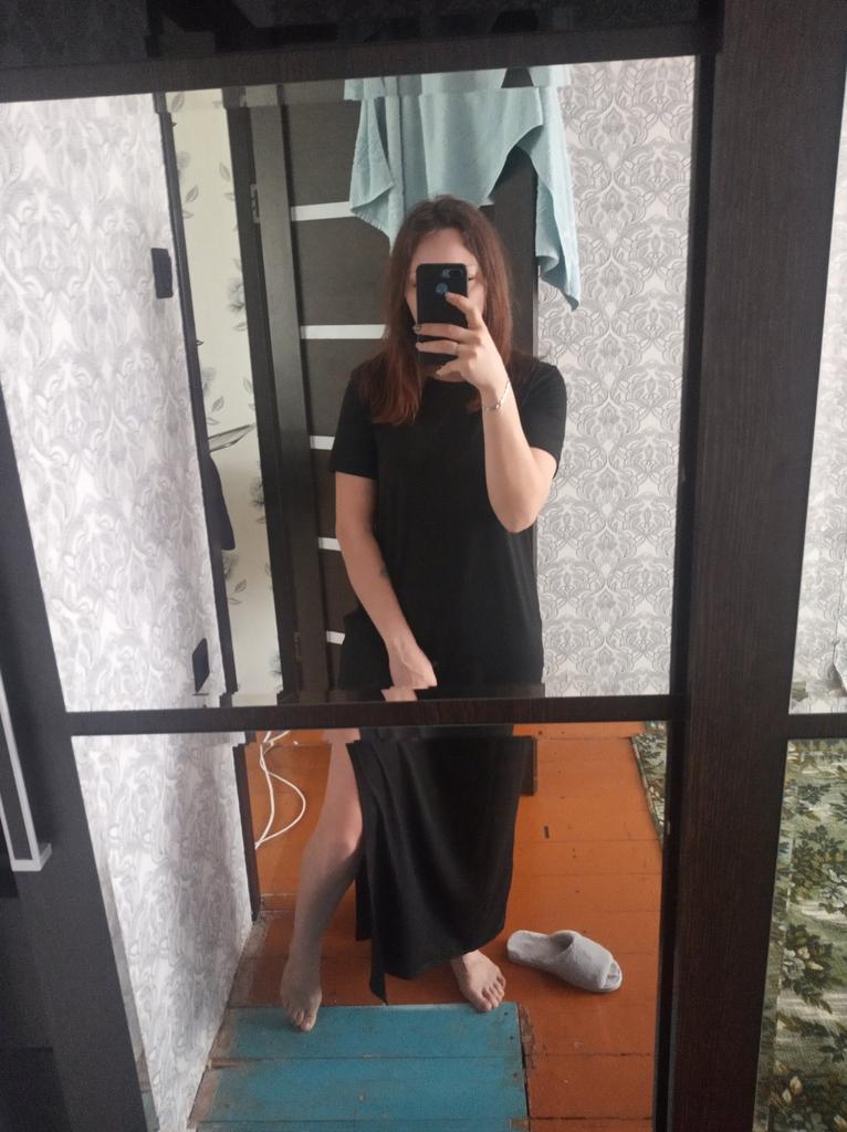 🖤Black T-Shirt Dress🖤 The dress is perfect for summer! It is light and breathable.😍 The fabric is very pleasant on the skin, very soft. The neckline is on the left side of the dress, looks very sexy🔥 The seams are processed very neatly. You can combine this dress with different clothes 👍 The parameters match the size table 100% There was no tag on the dress stating the material, so I can't say for sure that the dress is cotton☝️ I am happy to recommend the dress and the seller 😍 Mary✌️
