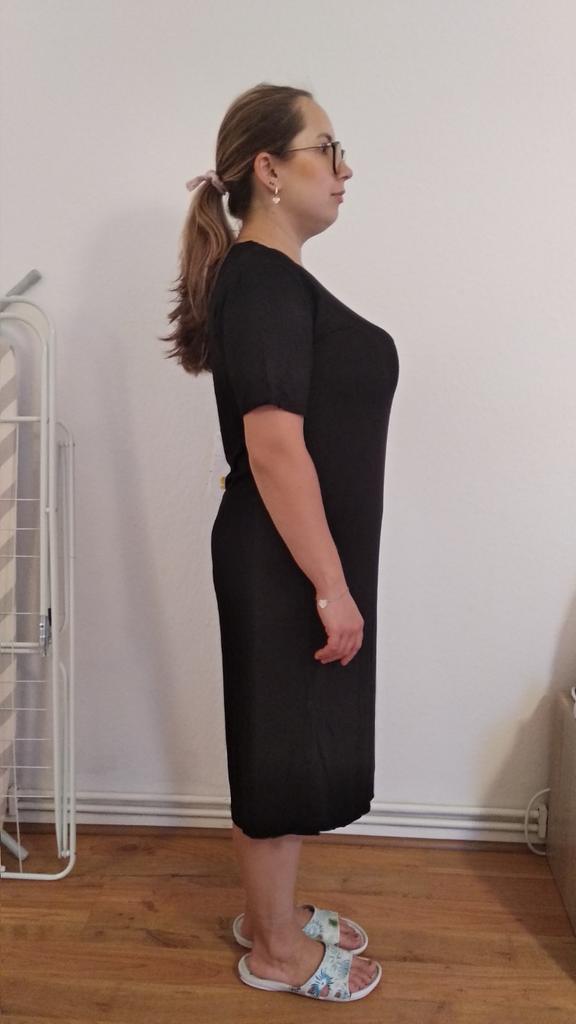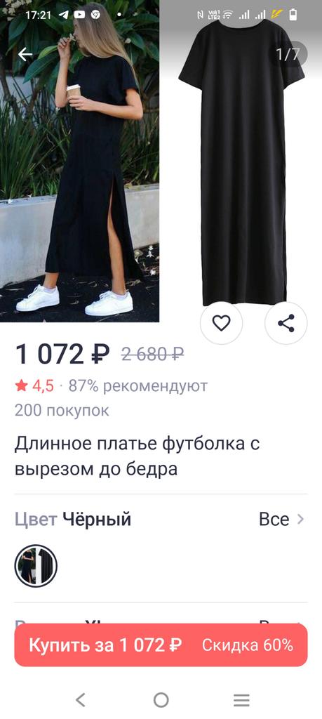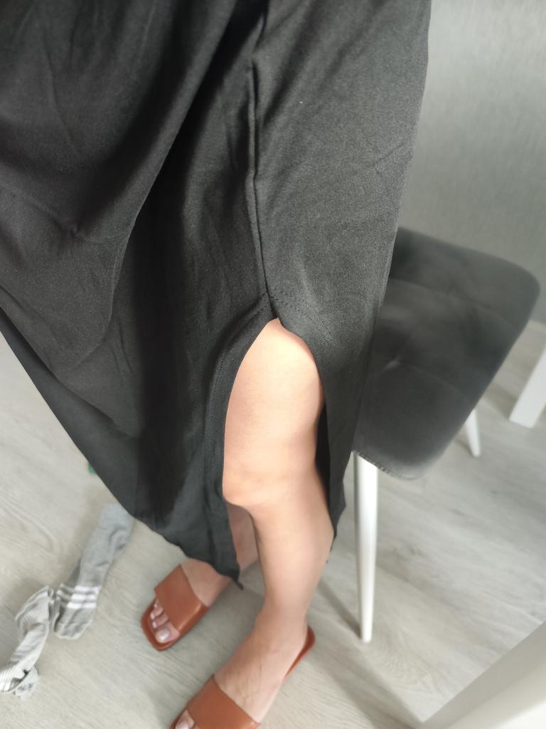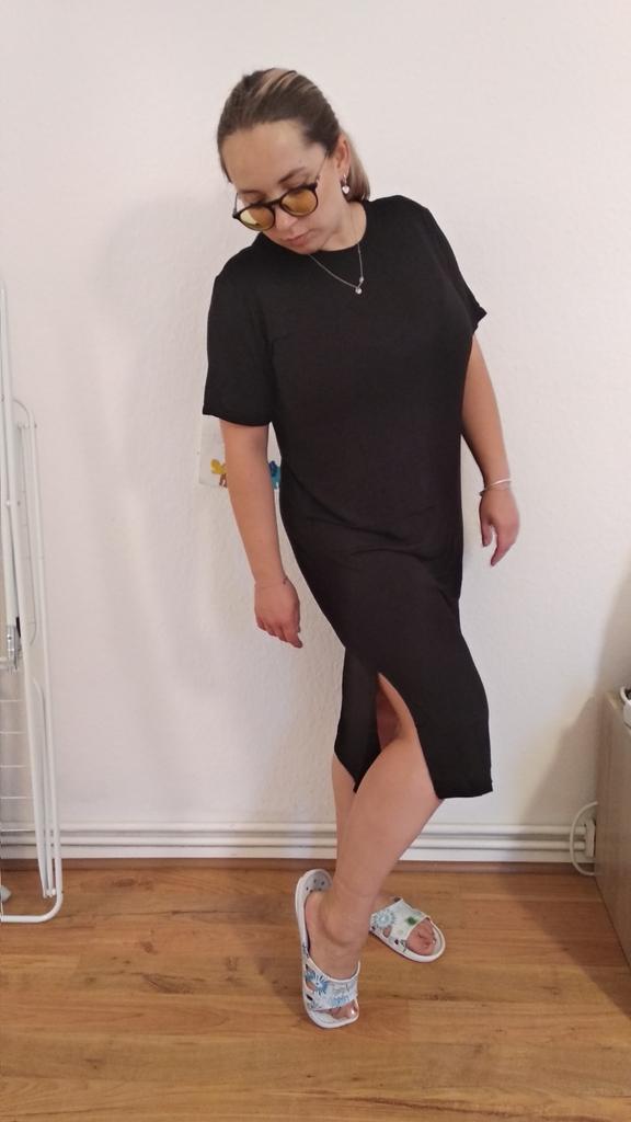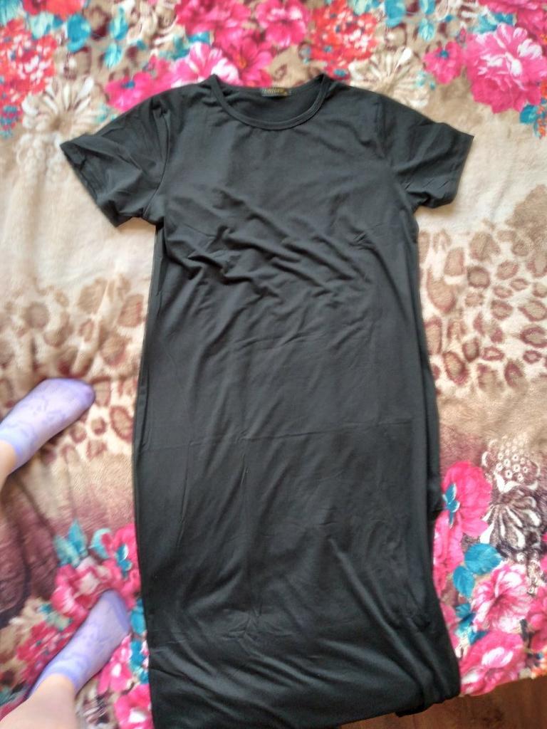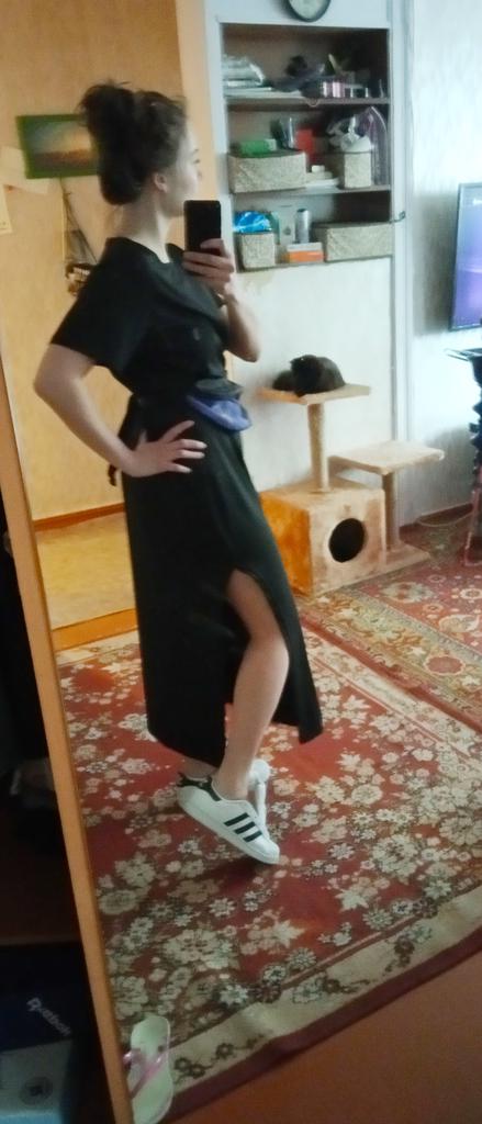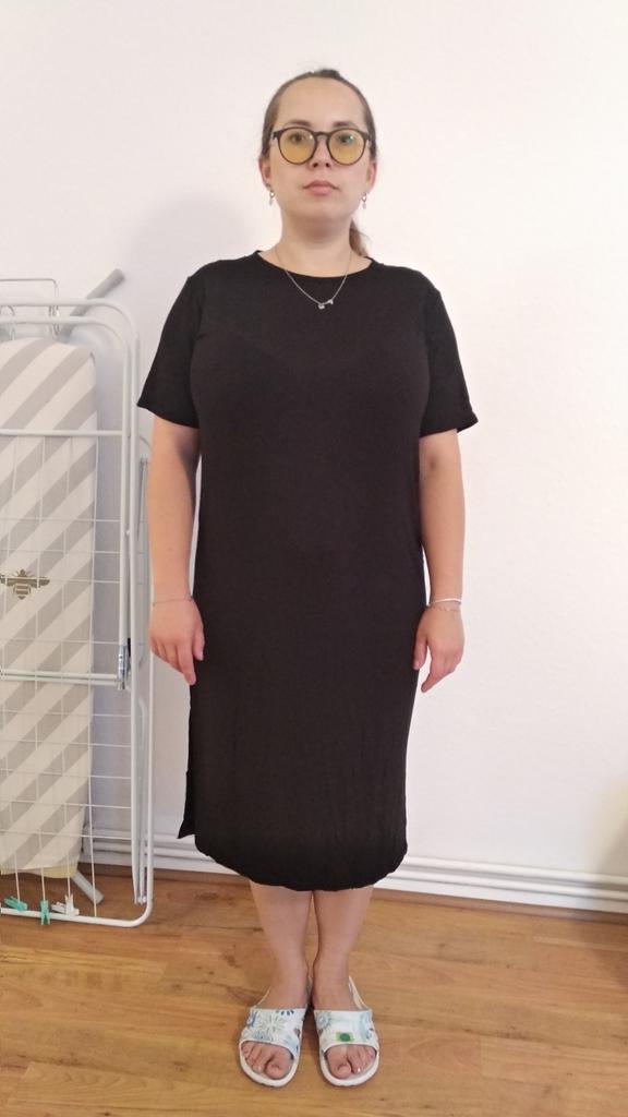 🖤Black T-Shirt Dress🖤 The dress is perfect for summer! It is light and breathable.😍 The fabric is very pleasant on the skin, very soft. The neckline is on the left side of the dress, looks very sexy🔥 The seams are processed very neatly. You can combine this dress with different clothes 👍 The parameters match the size table 100% There was no tag on the dress stating the material, so I can't say for sure that the dress is cotton☝️ I am happy to recommend the dress and the seller 😍 Mary✌️