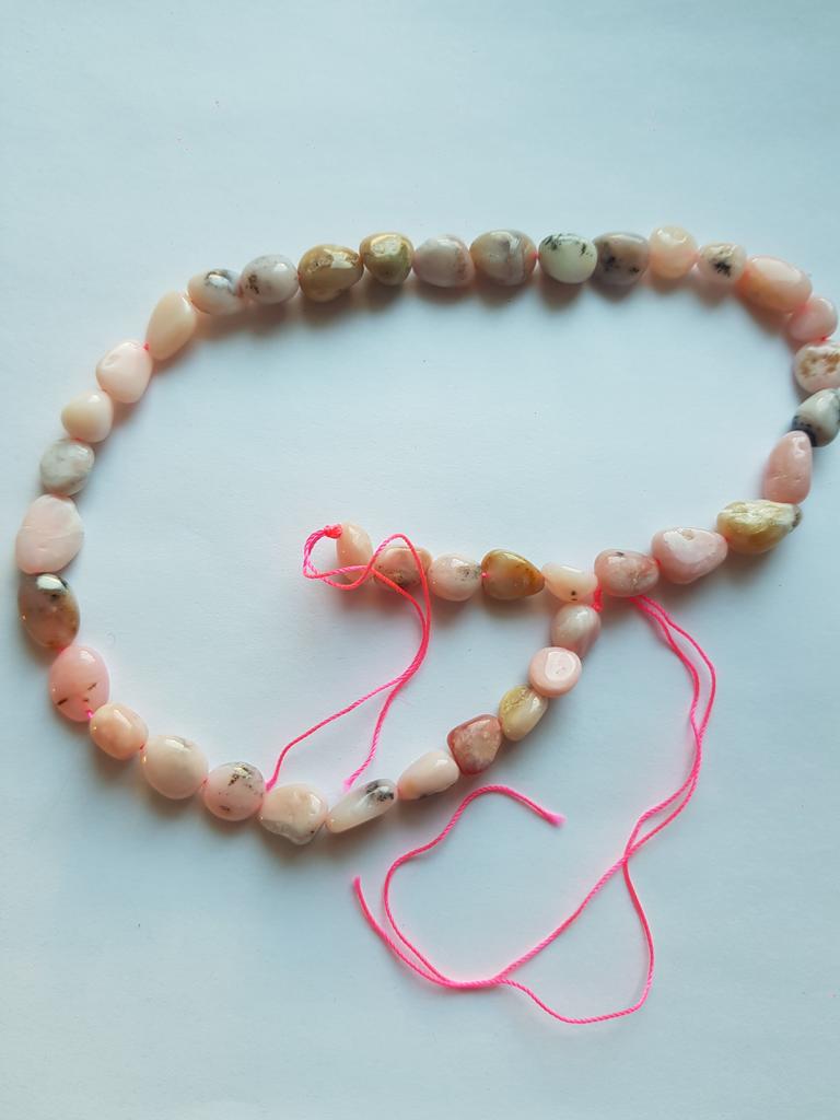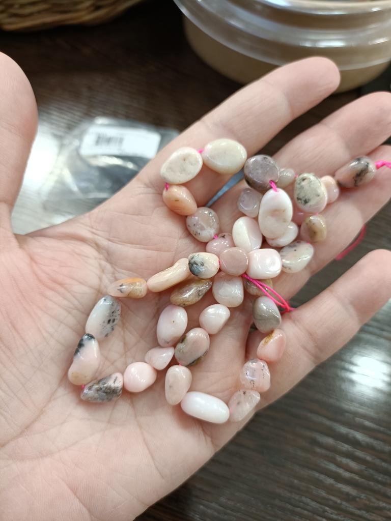Delivered intact. Pink opal. I hope it's natural stone. I read on the Internet that this pink opal from the photo looks like stones in Peru. If you assemble a thread for the neck, you want to add a few more stones. Thank you.