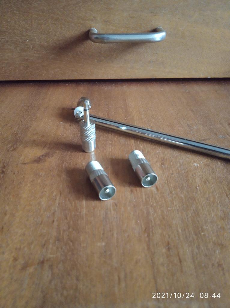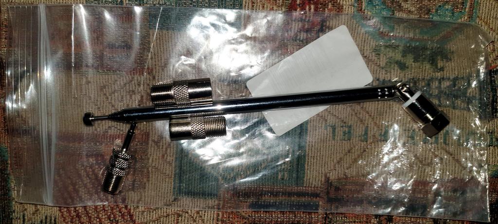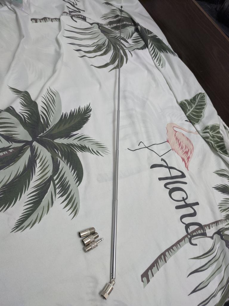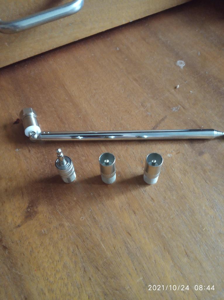 Antenna supplied with several adapters. Its length of approximately 55cm when deployed picks up signals without any problem.