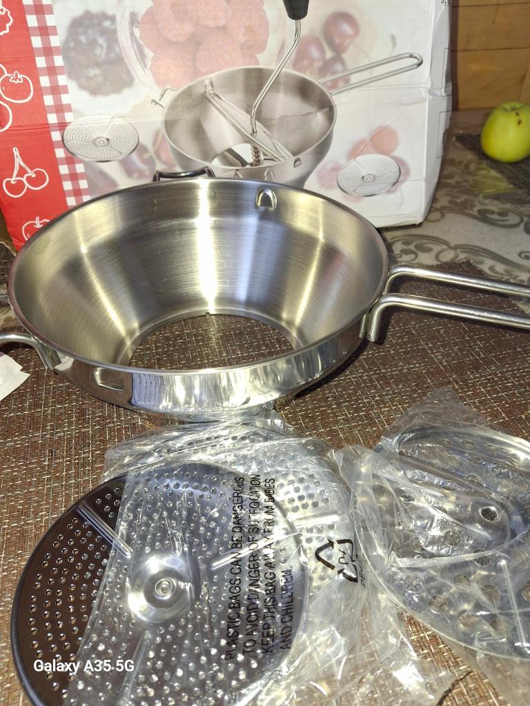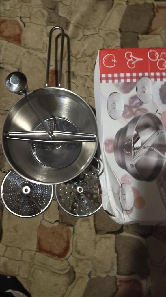 Tried it on tomatoes, got tired of turning the handle. The effect is small. In the photo, you can see a container under the grater, but in reality, there isn't one.