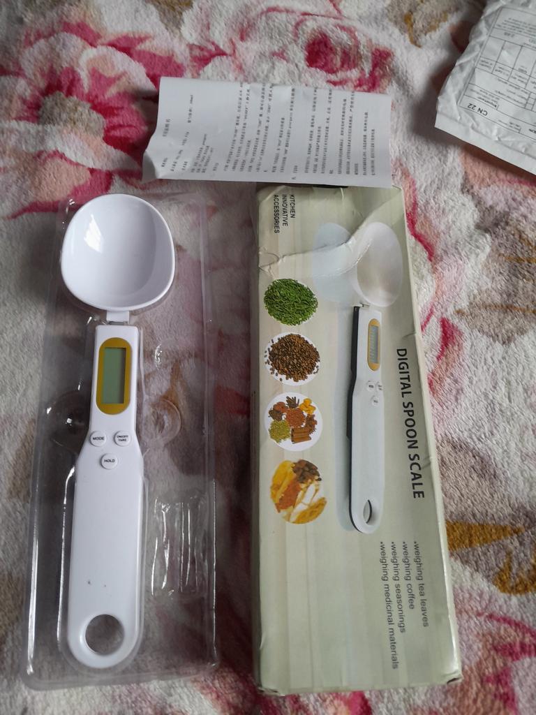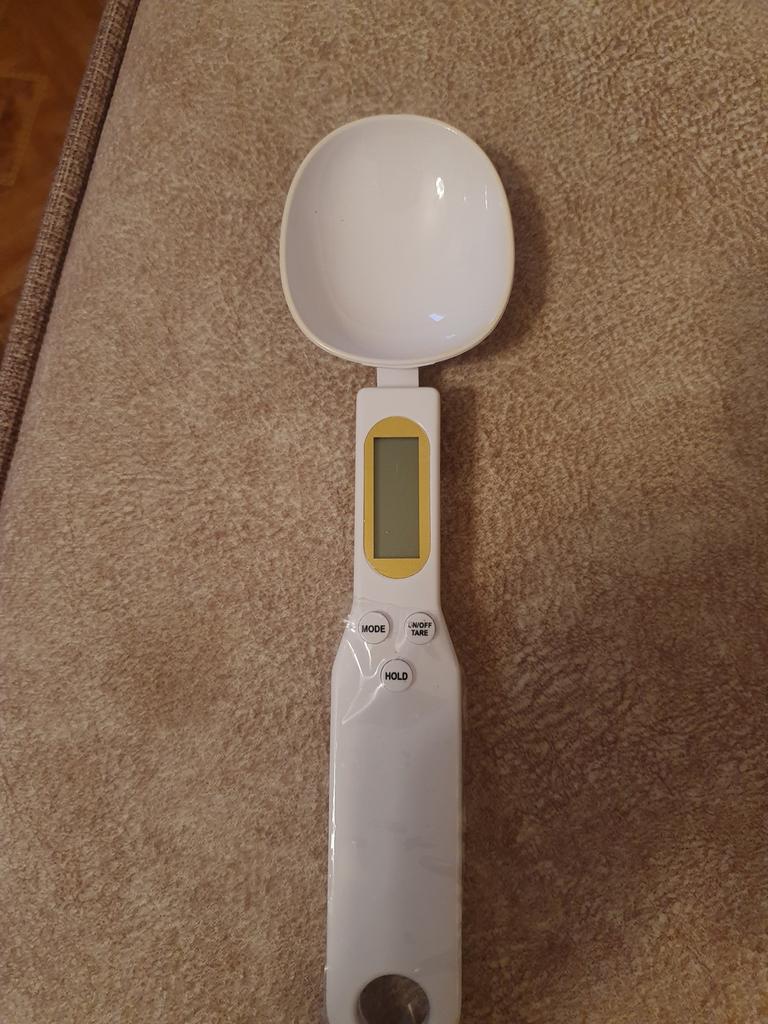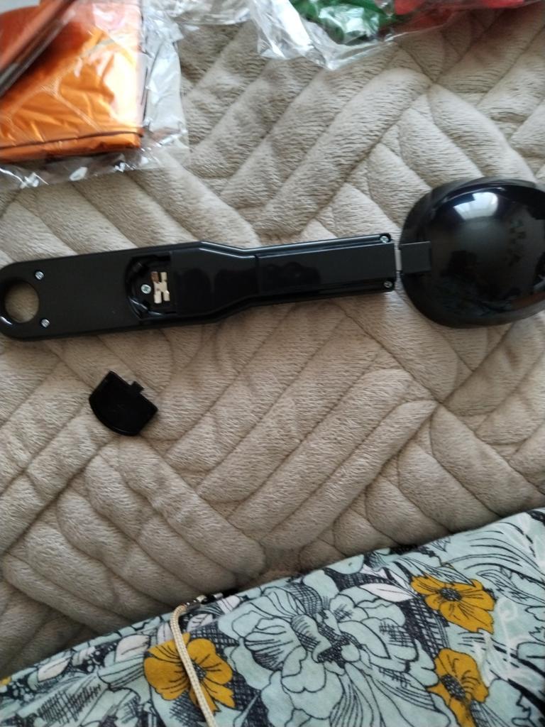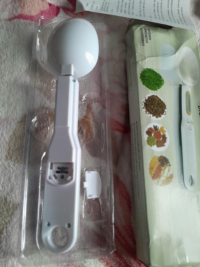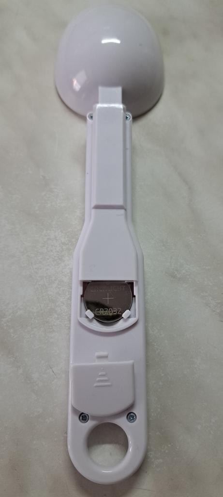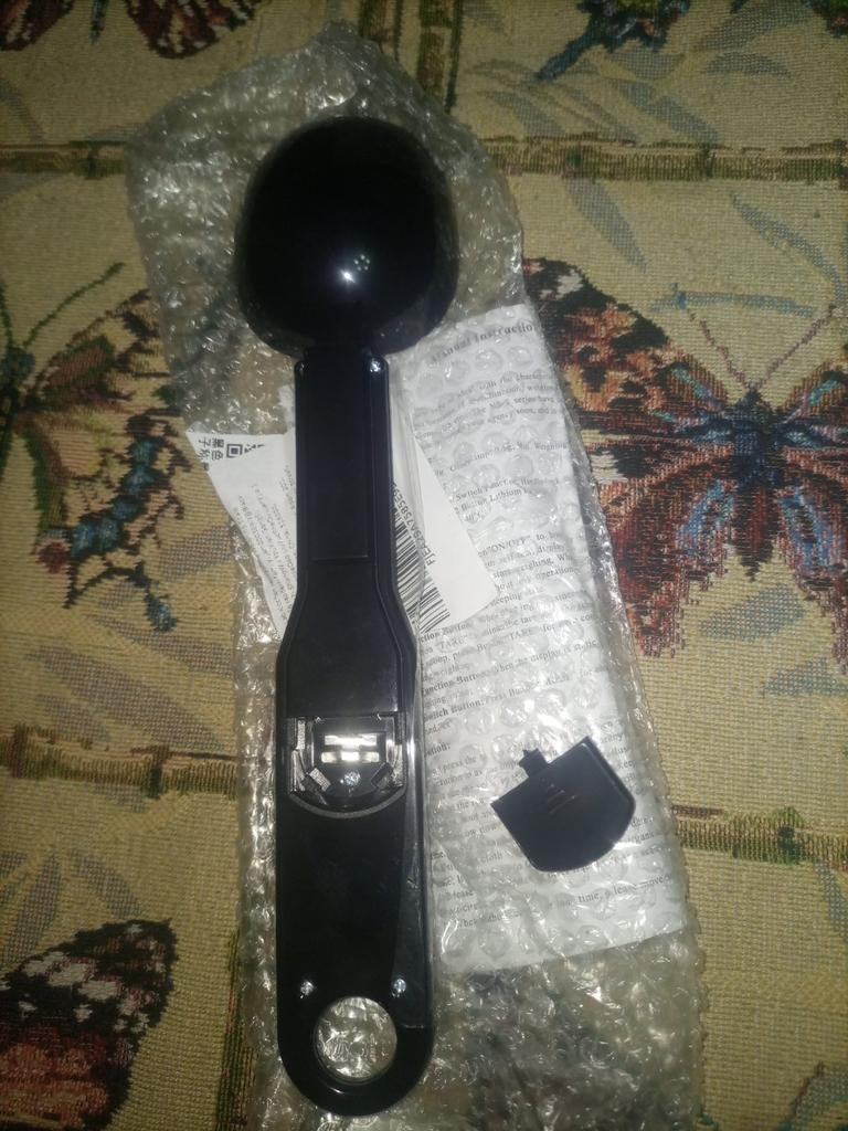 The spoon is good, holds 500 grams, works. It's unpleasant that the packaging was torn open and the battery was removed. Something else should have been included, visible from the plastic insert. Oh well. A round 32 size battery is needed.
