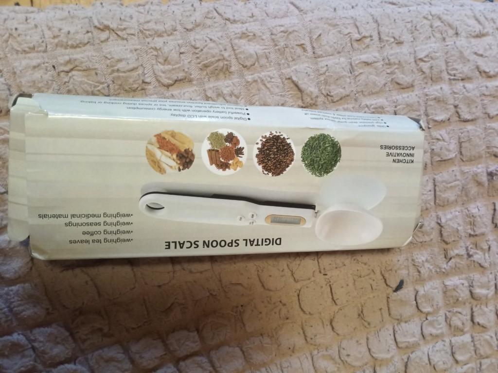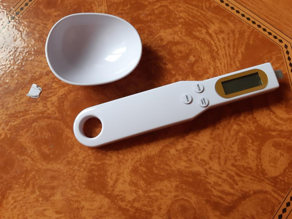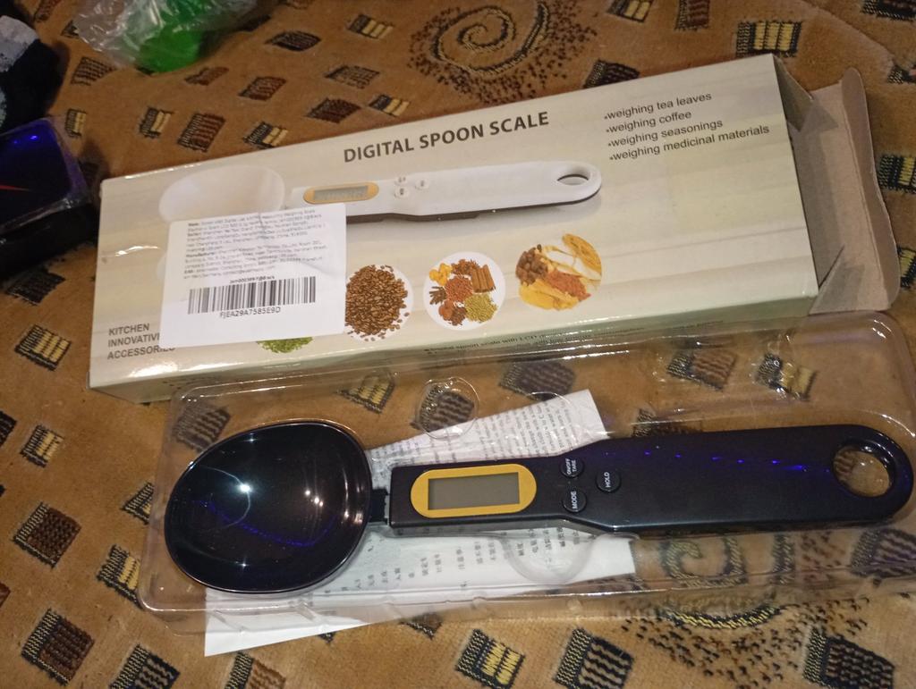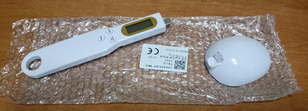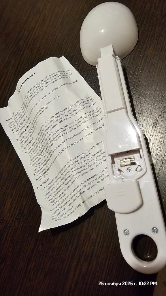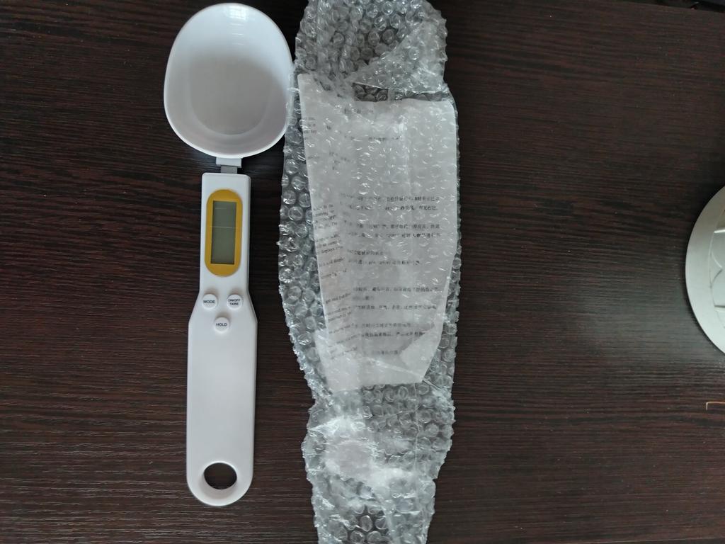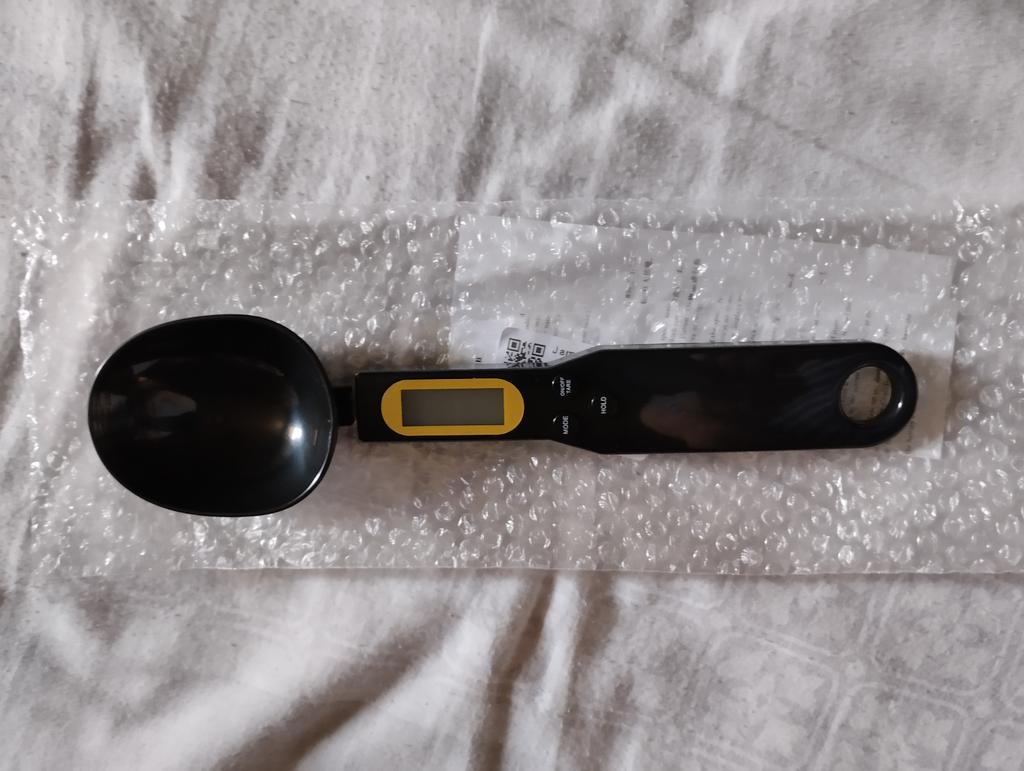 The spoon is good, holds 500 grams, works. It's unpleasant that the packaging was torn open and the battery was removed. Something else should have been included, visible from the plastic insert. Oh well. A round 32 size battery is needed.