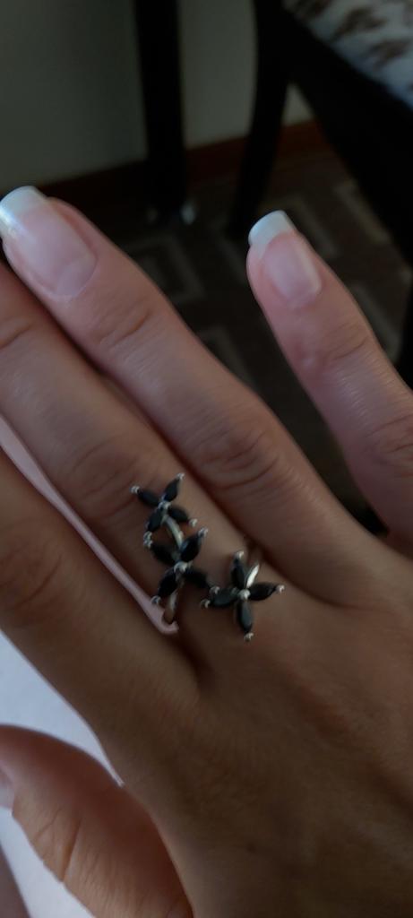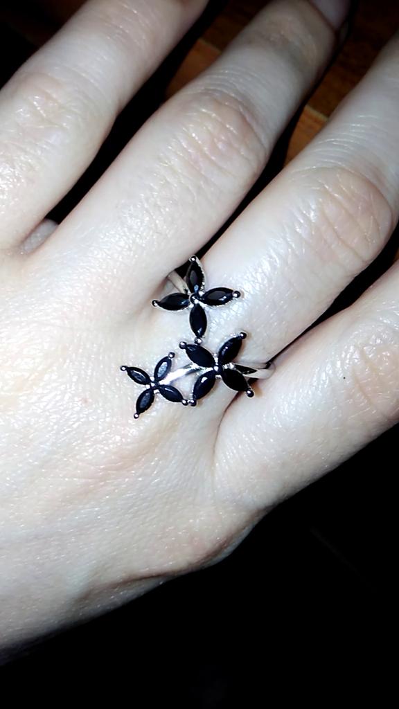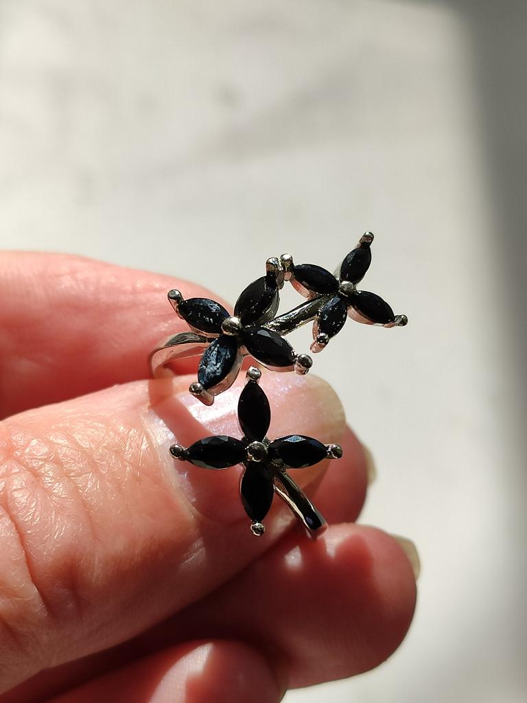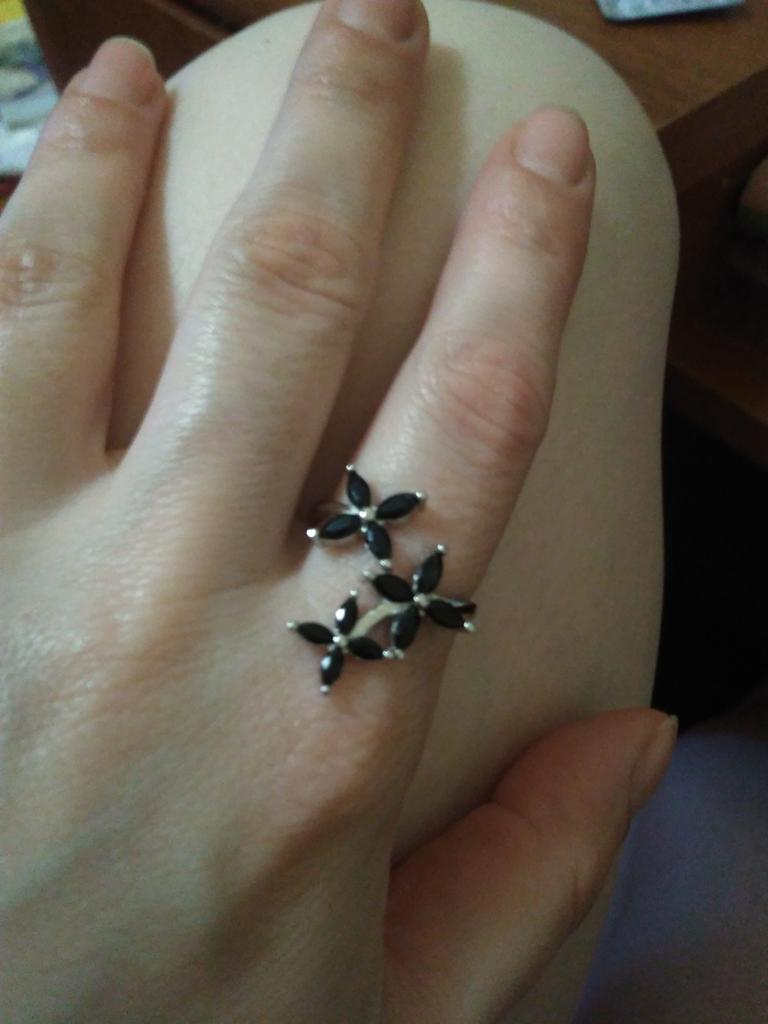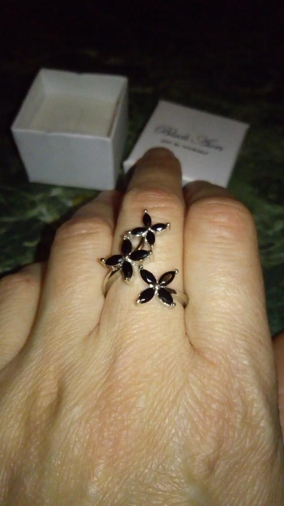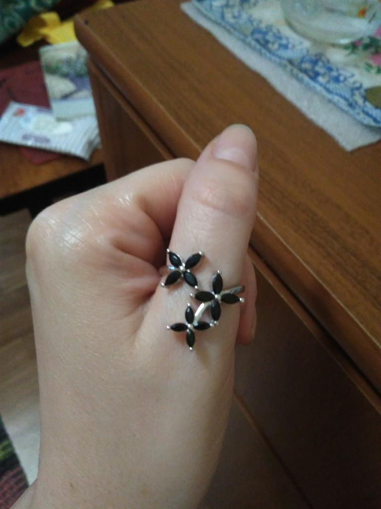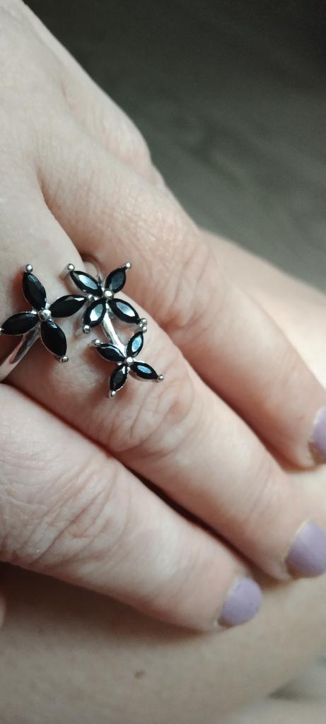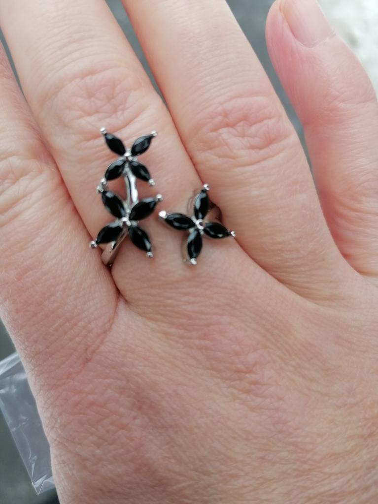 Very pretty ring with 3 small black flowers. It is also suitable for thicker fingers because it is open. It can be easily pulled apart but is still very stable, but it becomes more difficult for very slender fingers, you can also tighten it, but then it loses its current shape, because to tighten it you have to push the single flower behind the double flower. I think it's really great, it looks just as great in the original as it does on sale.❤ I can really recommend the ring and the seller.👍👍👍 It came in a bulk shipment in 18 days