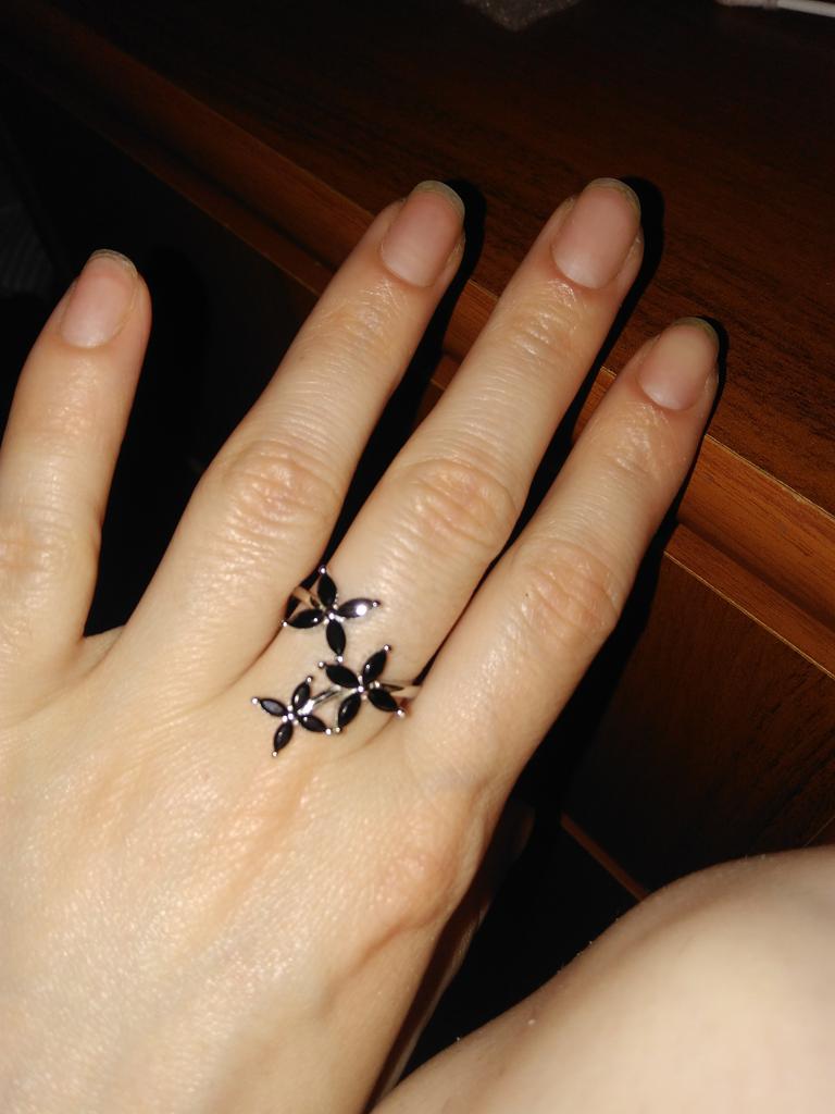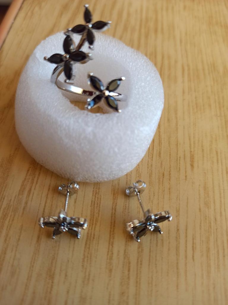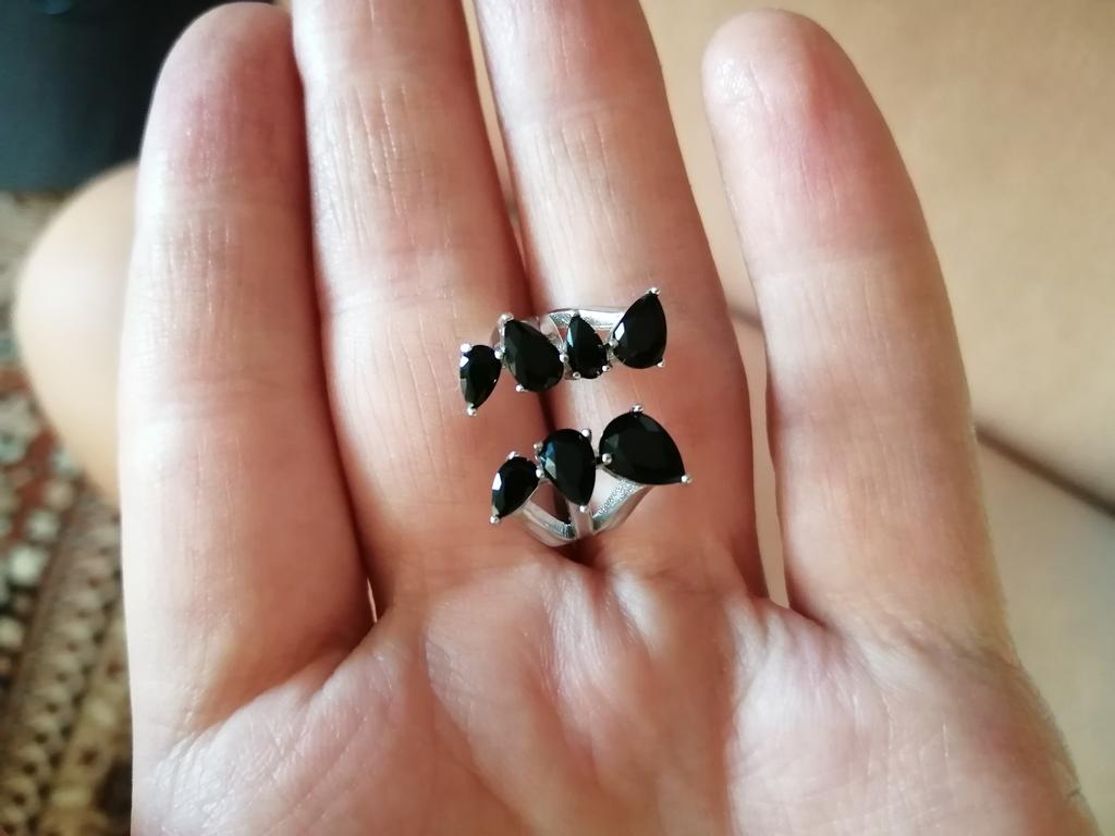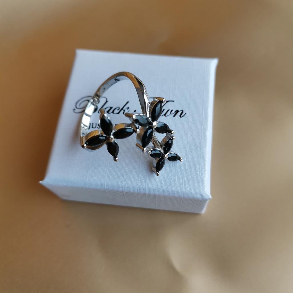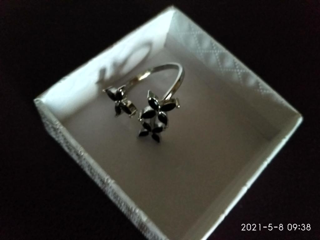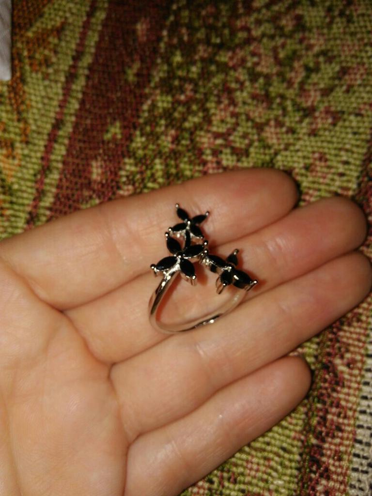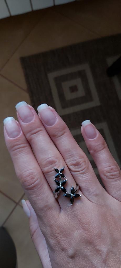 Very pretty ring with 3 small black flowers. It is also suitable for thicker fingers because it is open. It can be easily pulled apart but is still very stable, but it becomes more difficult for very slender fingers, you can also tighten it, but then it loses its current shape, because to tighten it you have to push the single flower behind the double flower. I think it's really great, it looks just as great in the original as it does on sale.❤ I can really recommend the ring and the seller.👍👍👍 It came in a bulk shipment in 18 days