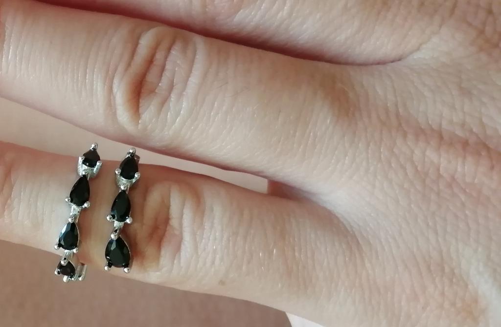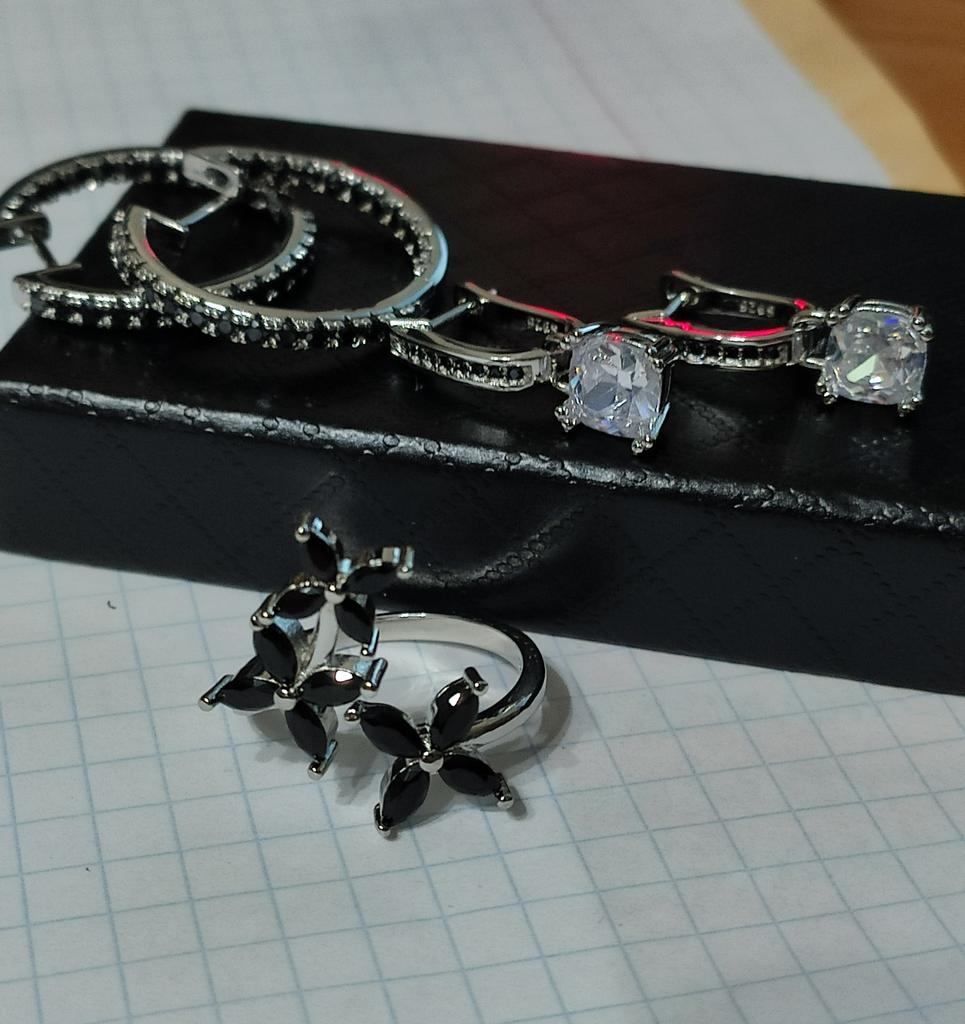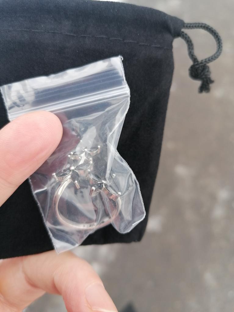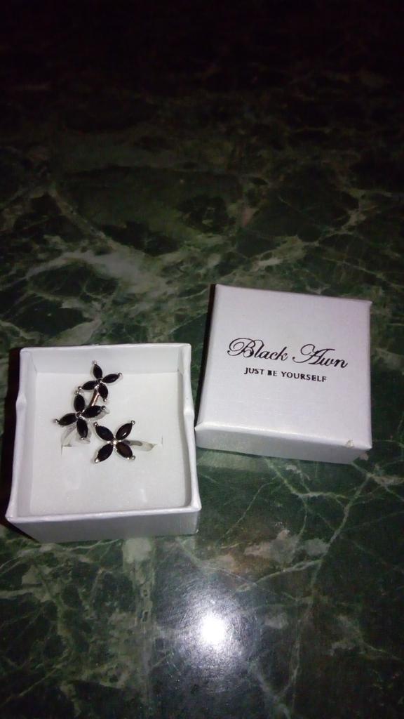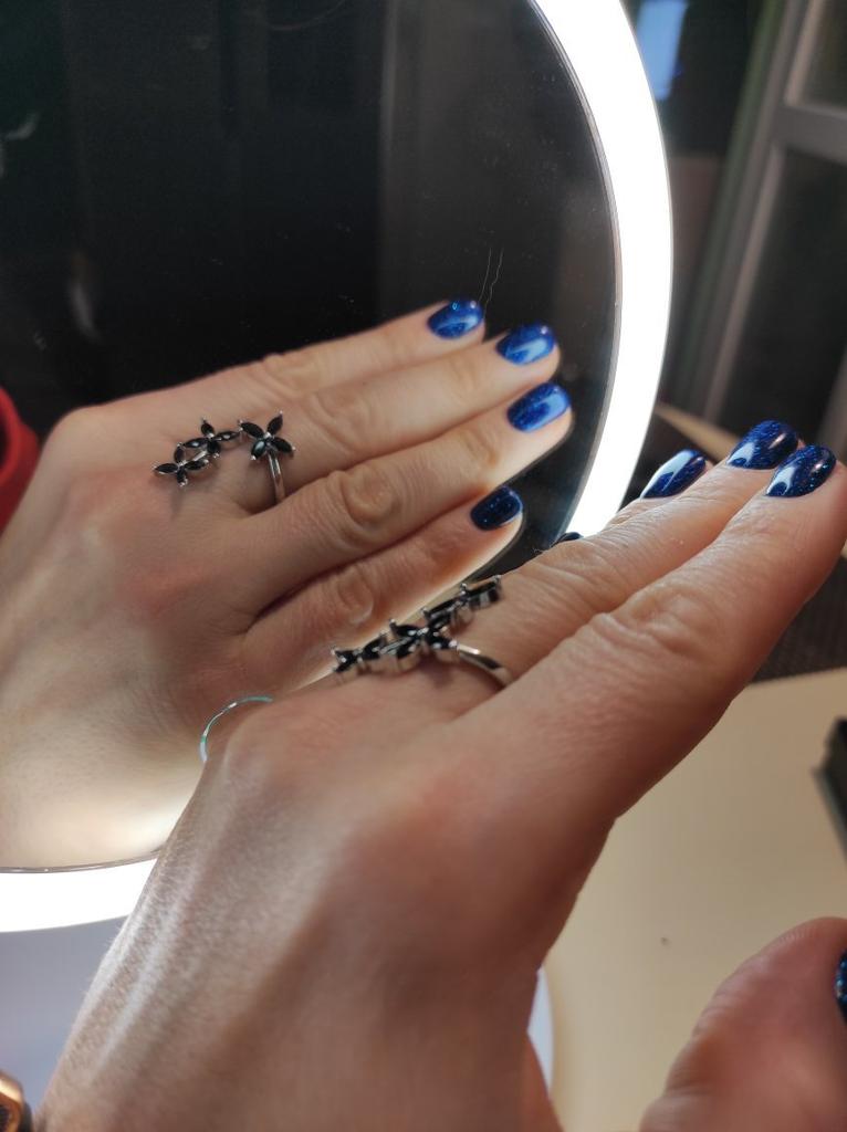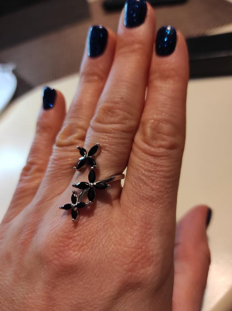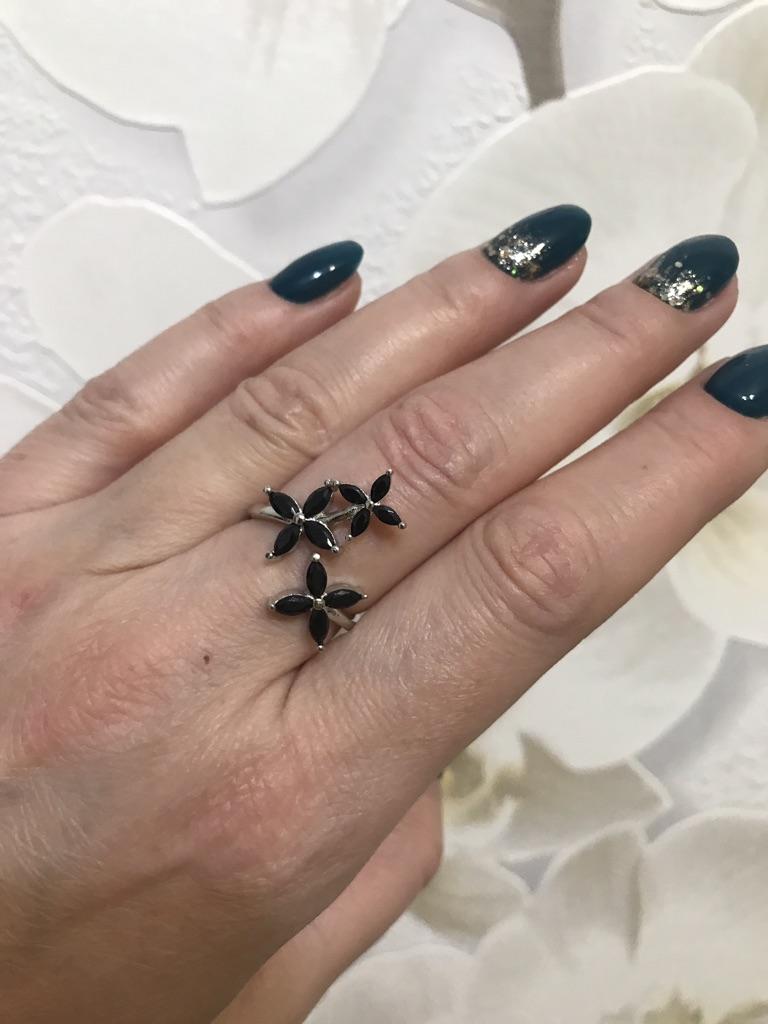 Very pretty ring with 3 small black flowers. It is also suitable for thicker fingers because it is open. It can be easily pulled apart but is still very stable, but it becomes more difficult for very slender fingers, you can also tighten it, but then it loses its current shape, because to tighten it you have to push the single flower behind the double flower. I think it's really great, it looks just as great in the original as it does on sale.❤ I can really recommend the ring and the seller.👍👍👍 It came in a bulk shipment in 18 days