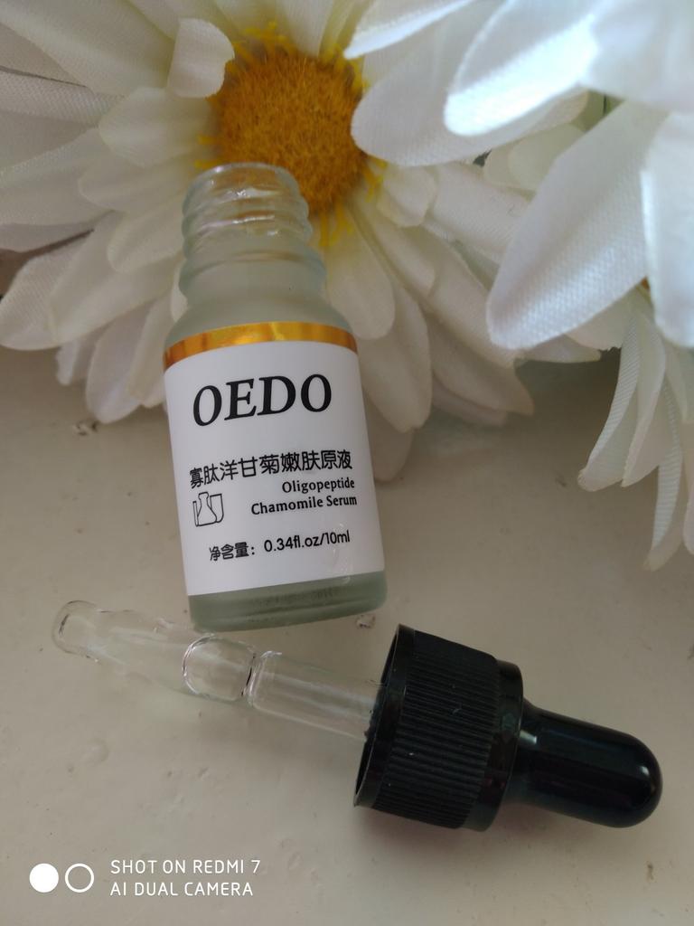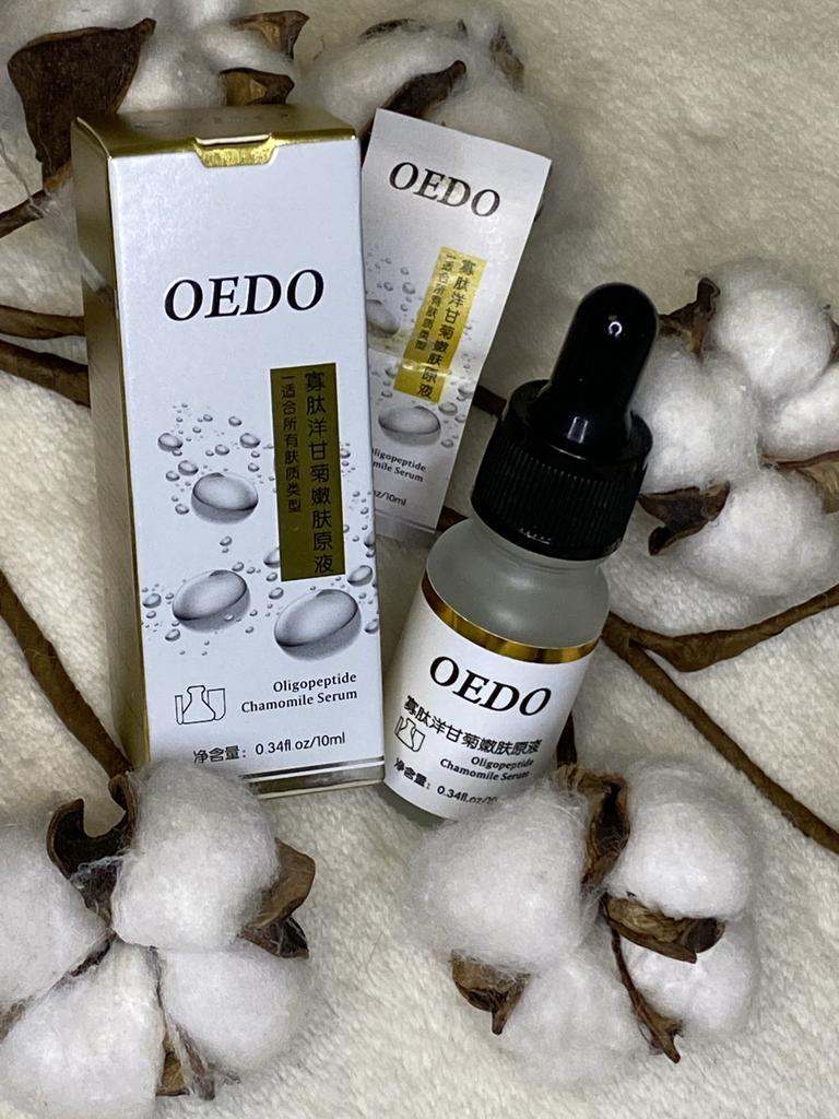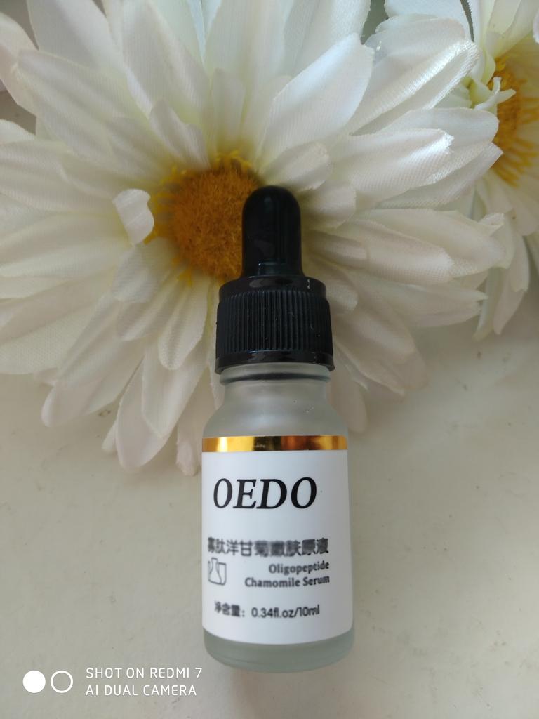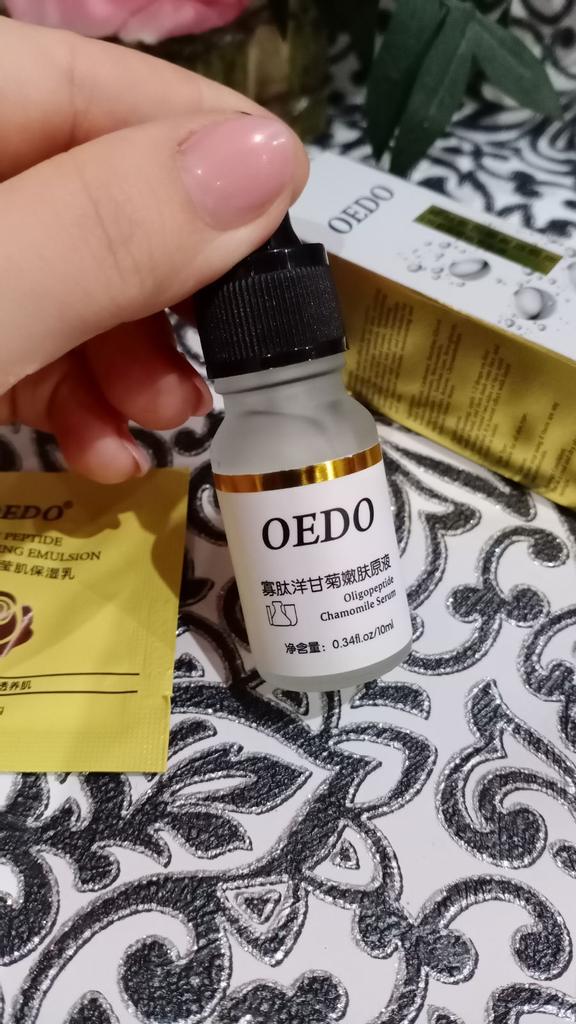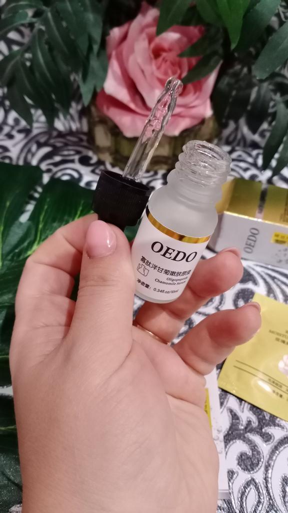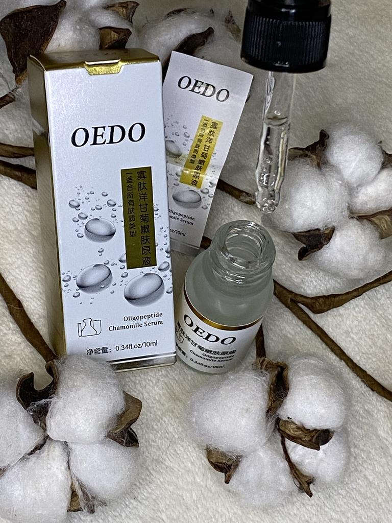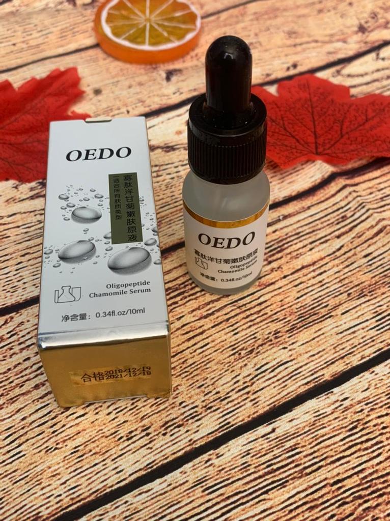 Oligopeptit Chamomile Face Serum brand: OEDO What does this product do: 🏵️ Softens 🏵️ Moisturizes 🏵️ Deeply repairs skin 🏵️ Eliminates acne and soothes skin 🏵️ Reduces wrinkles 🏵️ Slows down aging process of the skin This essence locks water inside the skin. How to use: Warm up the couple of drops between your palms and gently press your palms onto face, eye and neck for 10 seconds then massage untill it's fully absorbed by skin. Net amount is 15 ml. Absorbed by my skin so easily and quickly. It doesn't give greasy feeling. It almost odourless. I recommend it 👍 ✏️ If you buy one after seeing my review, please leave a comment. I would love to know that my review is useful.