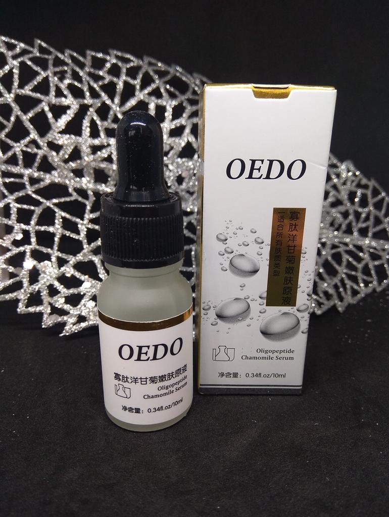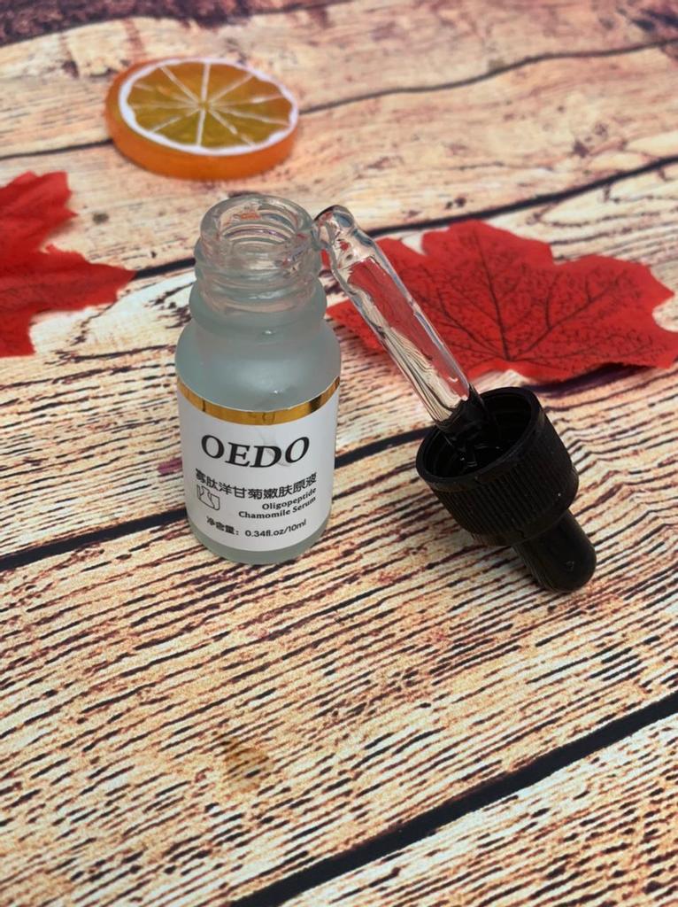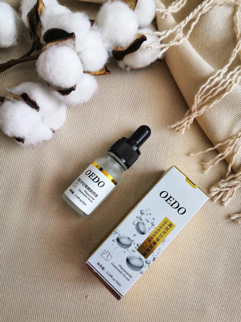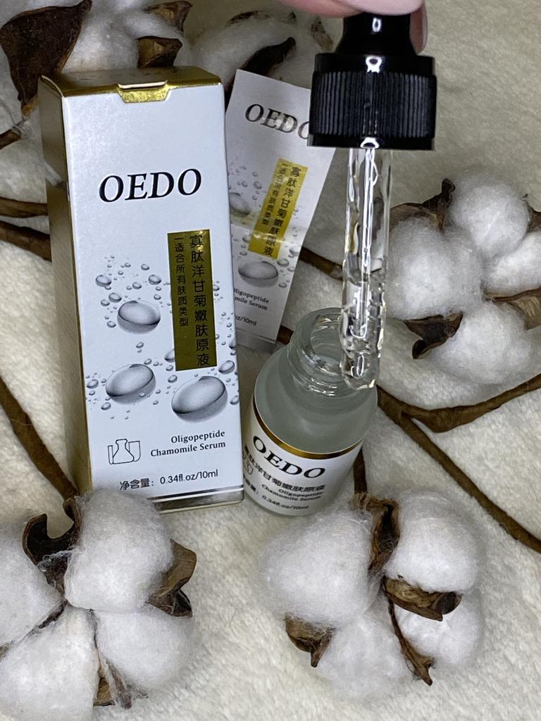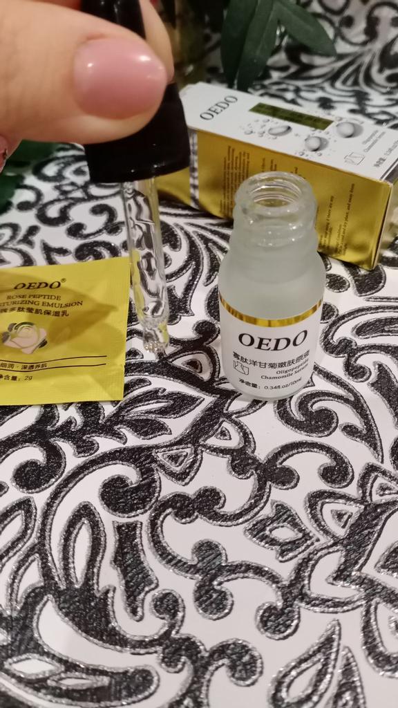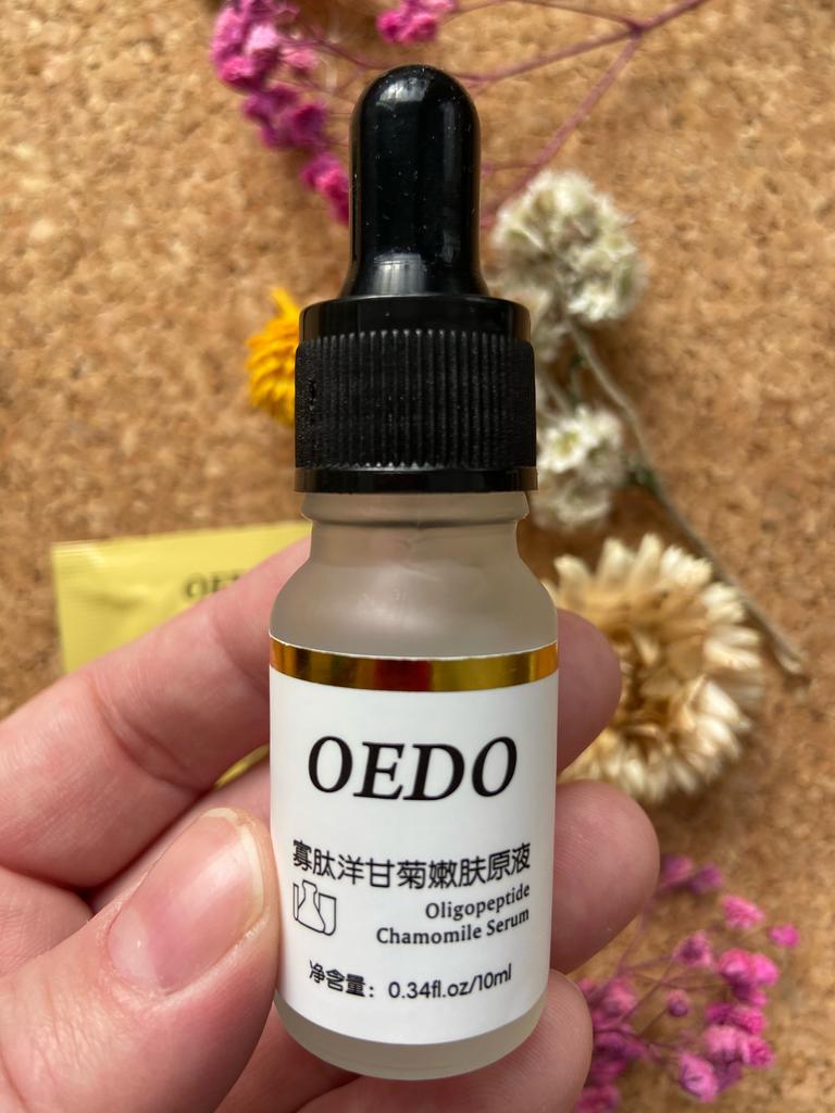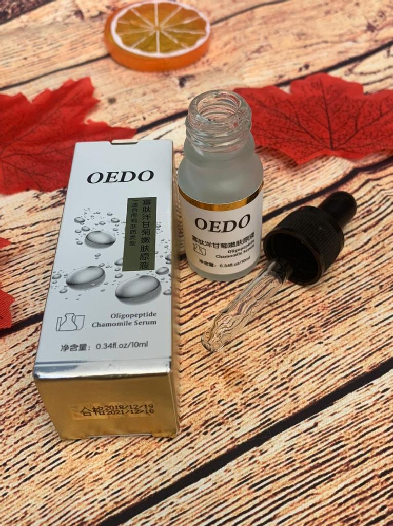 Oligopeptit Chamomile Face Serum brand: OEDO What does this product do: 🏵️ Softens 🏵️ Moisturizes 🏵️ Deeply repairs skin 🏵️ Eliminates acne and soothes skin 🏵️ Reduces wrinkles 🏵️ Slows down aging process of the skin This essence locks water inside the skin. How to use: Warm up the couple of drops between your palms and gently press your palms onto face, eye and neck for 10 seconds then massage untill it's fully absorbed by skin. Net amount is 15 ml. Absorbed by my skin so easily and quickly. It doesn't give greasy feeling. It almost odourless. I recommend it 👍 ✏️ If you buy one after seeing my review, please leave a comment. I would love to know that my review is useful.