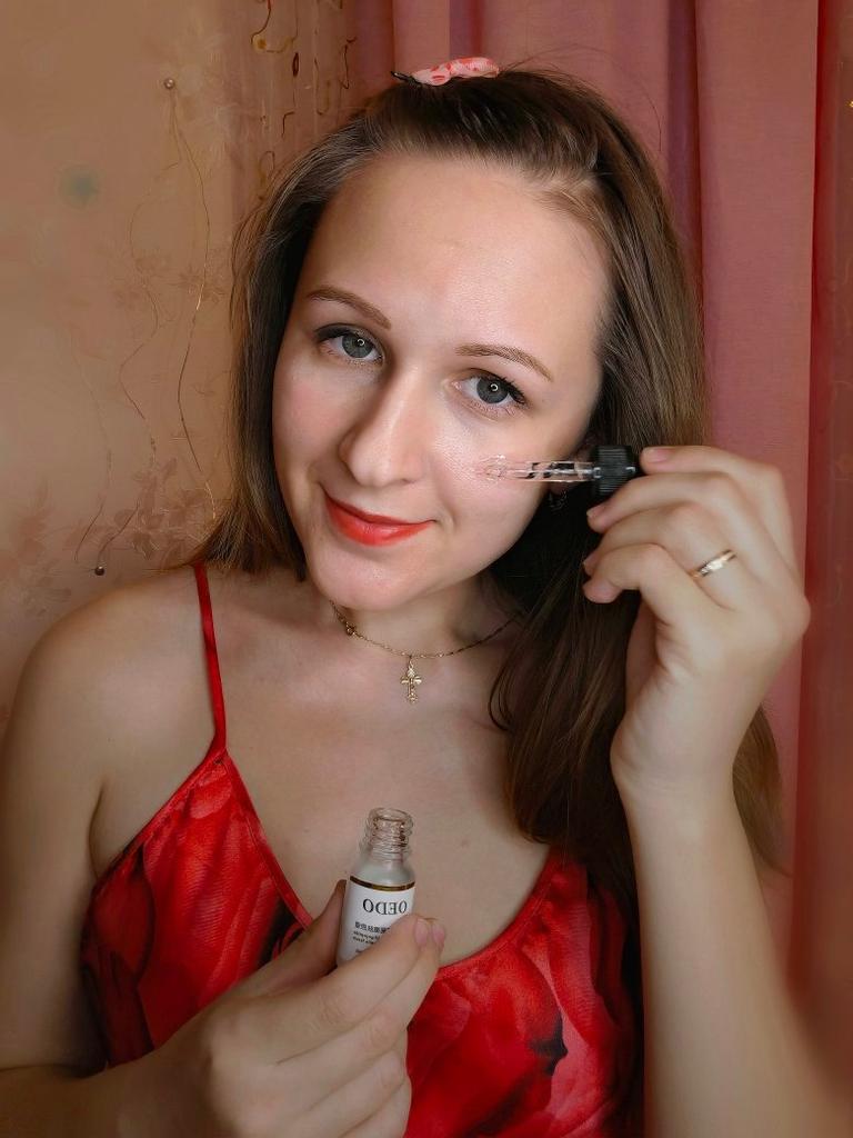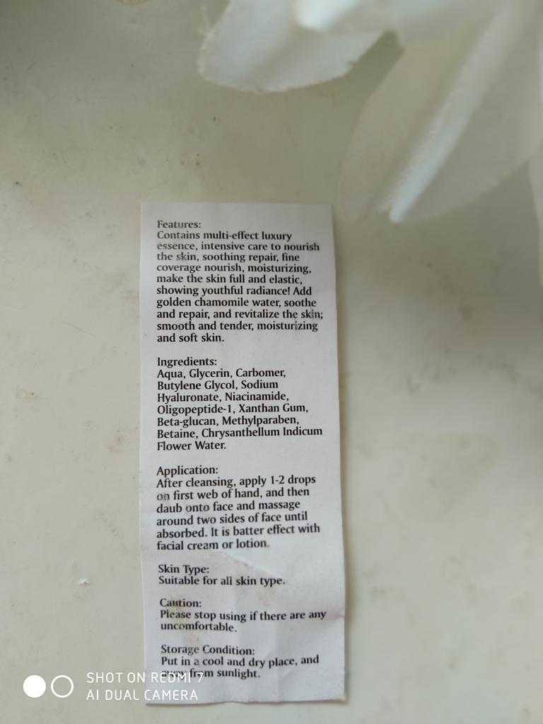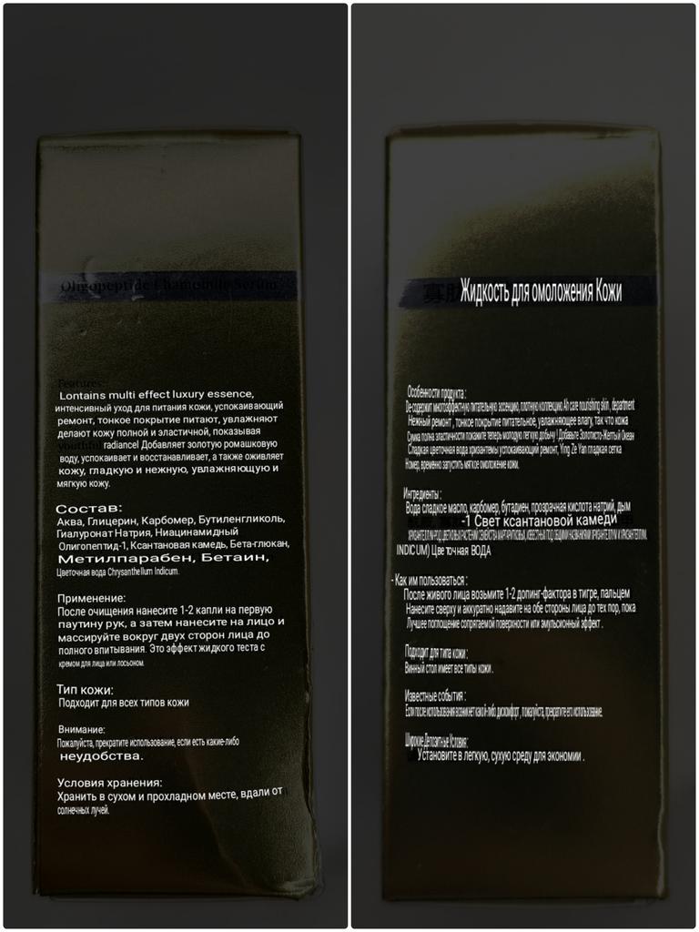 Serum with chamomile, oligopeptide and niacinamide 🌼 Good composition, good packaging, convenient bottle. The serum is transparent, odorless, non-sticky. The consumption of the product is small. Eye patches were given as a gift, thank you. Satisfied with the purchase.