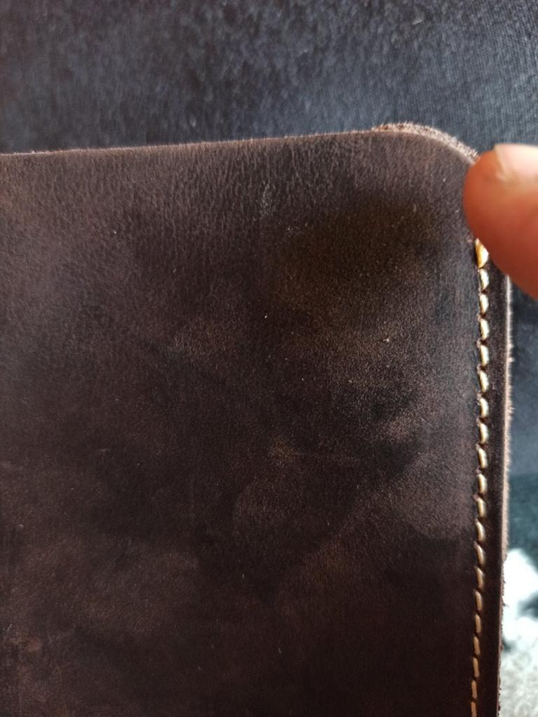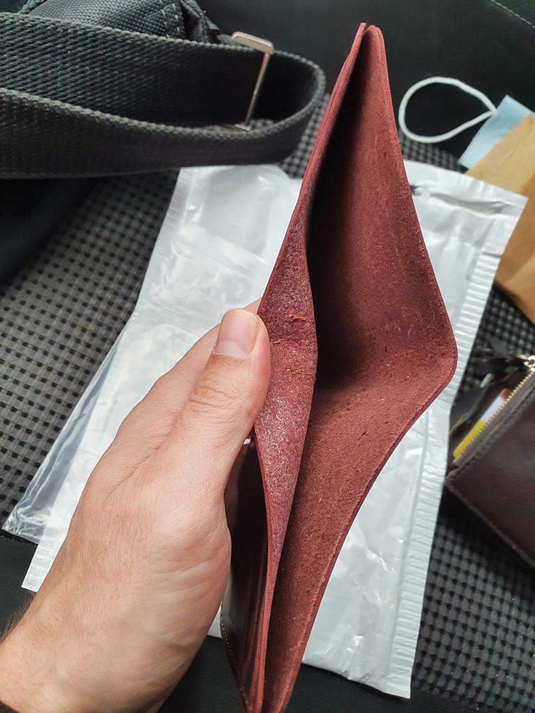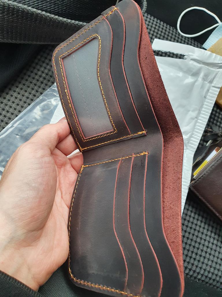 The wallet is leather, but the seams inside are crooked, the ends of the card compartments are not smoothed, which is very disappointing, useless money spent, I just threw it in the trash