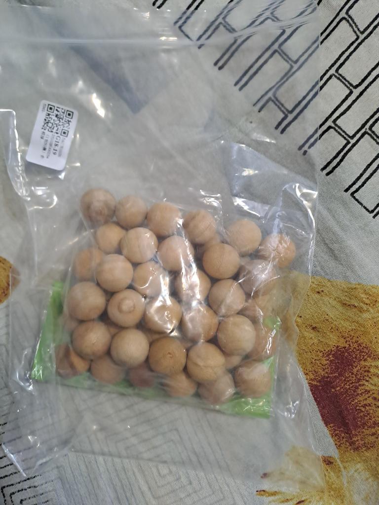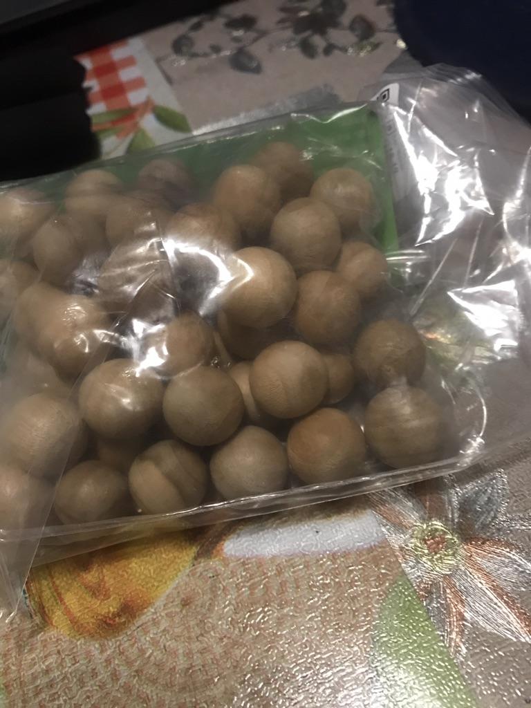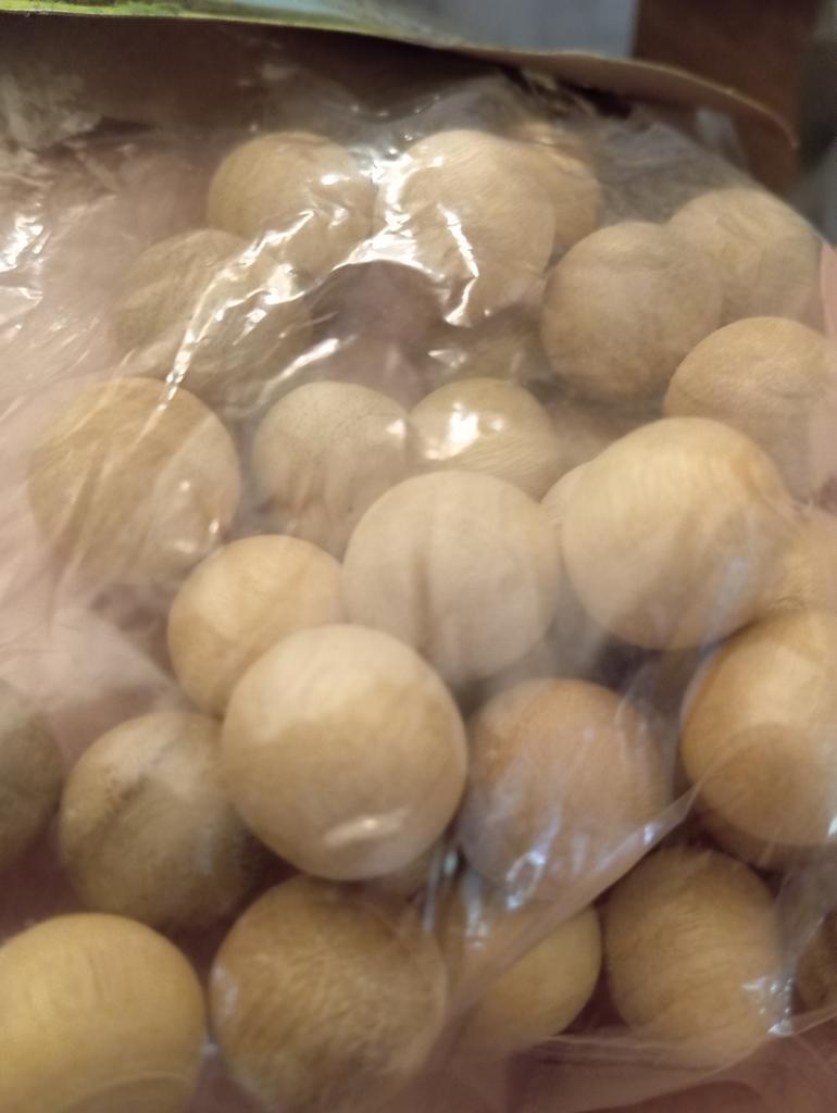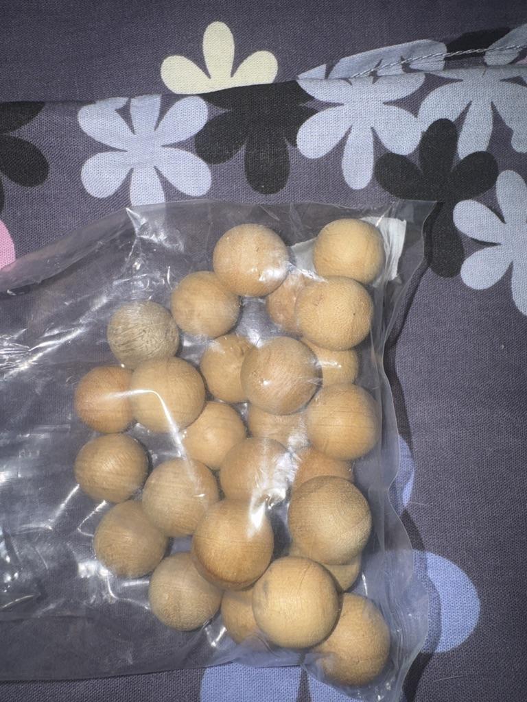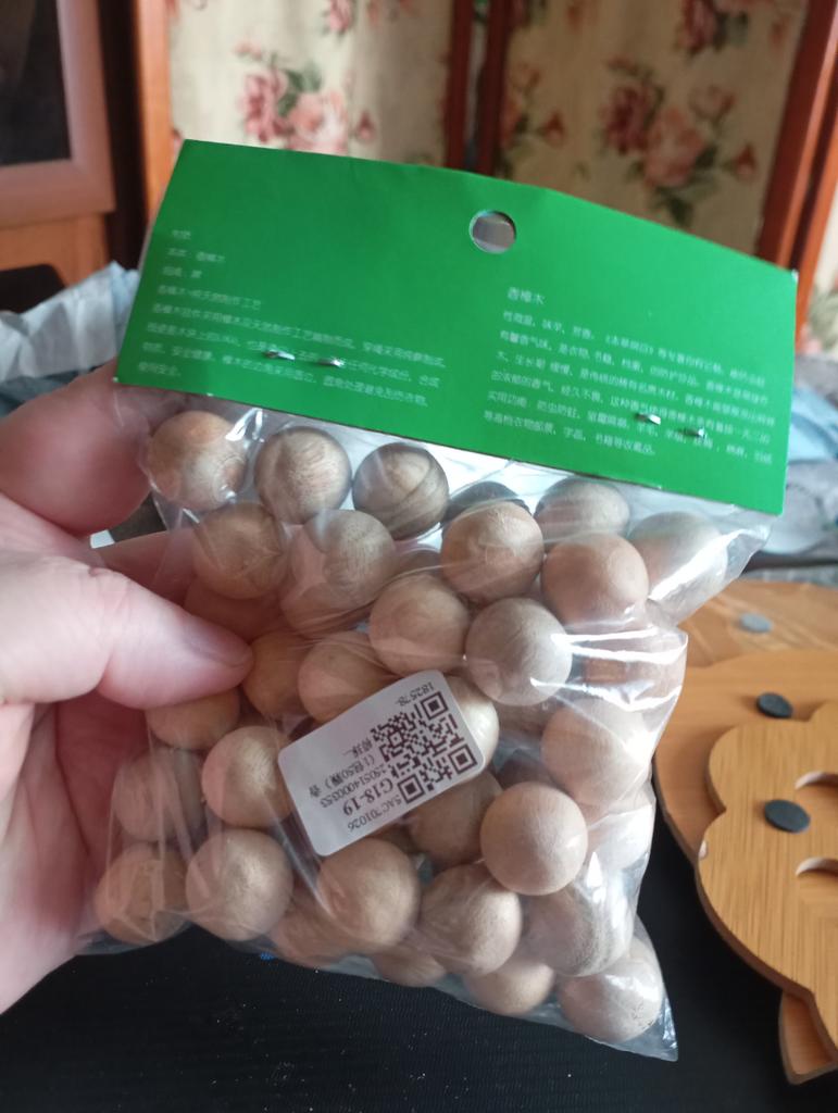 Small wooden balls, d=1.5 cm. (approximately). I hope it will drive away all the moths. Subtle pleasant smell.