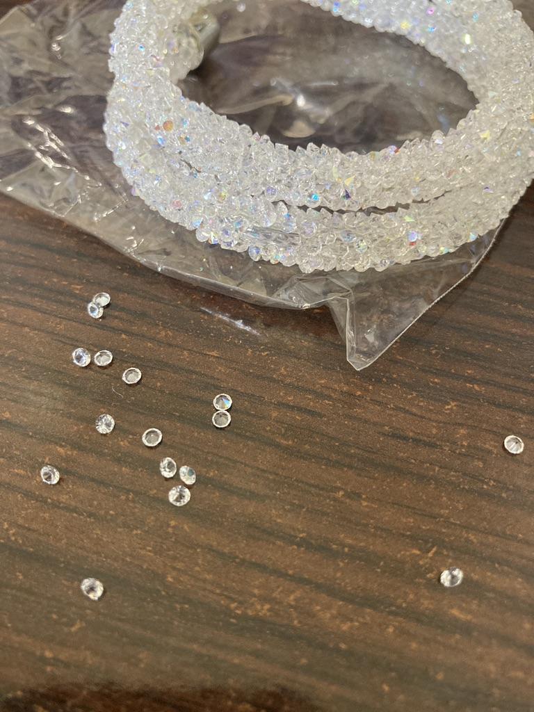 The bracelet is of strange quality, sticky, there is no sparkle in pieces. Some other threads are sticking out from the shiny layer itself, and while I was taking it out of the bag the stones were falling off. I'm shocked!!!!!!