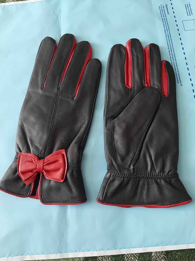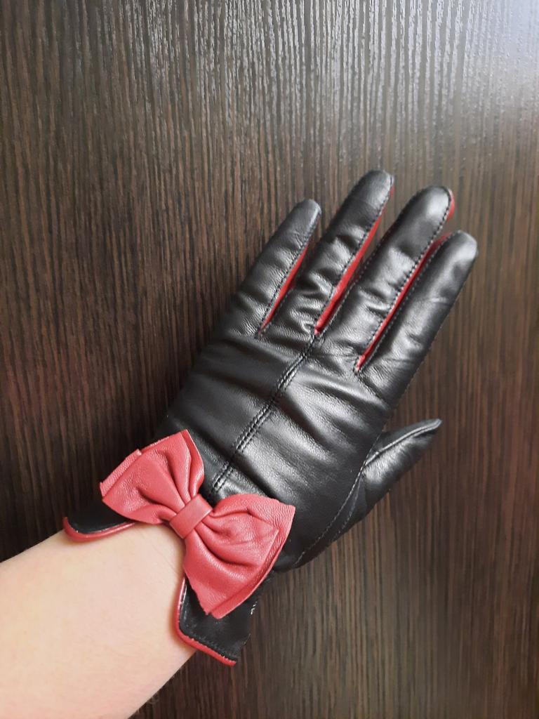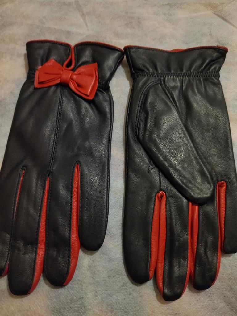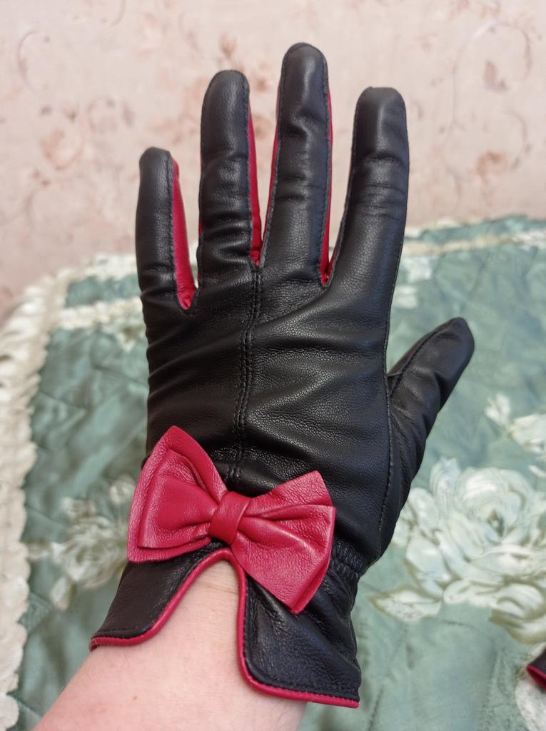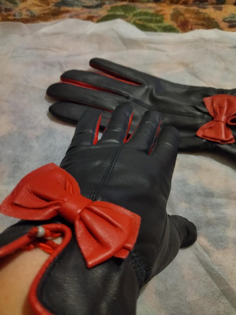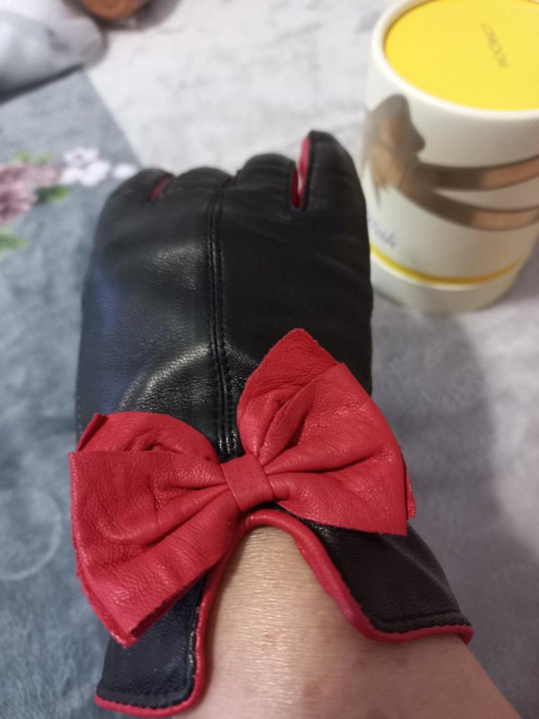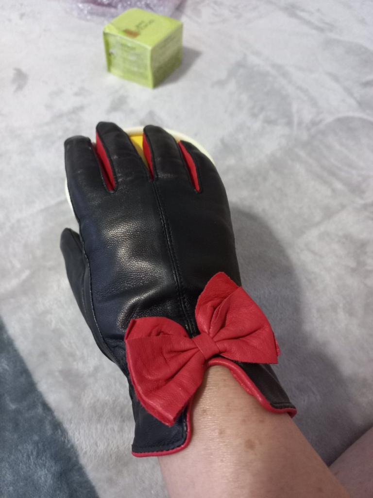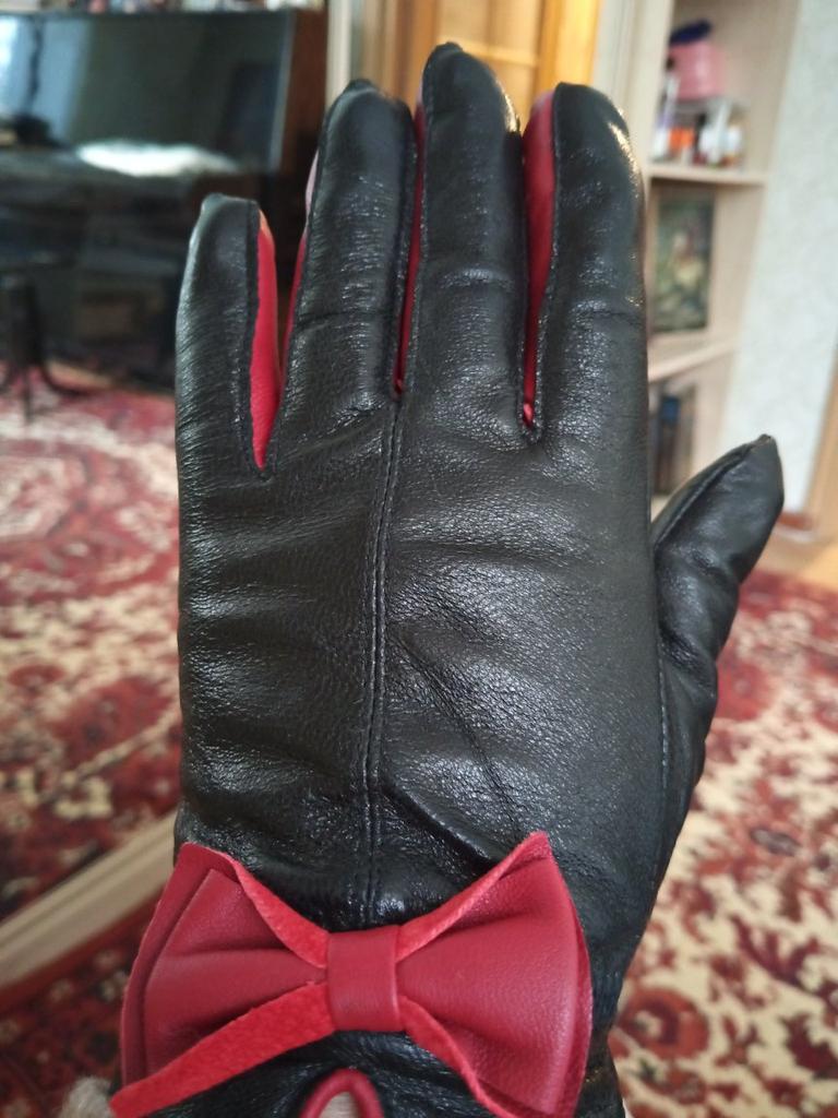 Gloves π€β€οΈ Genuine leather (they really smell like leather! There is a genuine leather label inside). Inside there is a light plush lining. Suitable for cold autumn, but in principle everything is individual π Black with red trim and bows π£π Everything is done very carefully π Size L fits wrist circumference 18cm and palm width 8cm. π The price is especially nice for the promotion of 3 productsπ€ Recommend βββββ Happy shopping everyone! πΉ