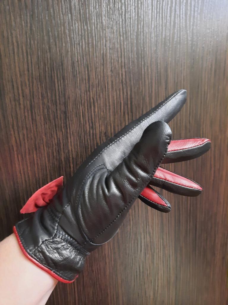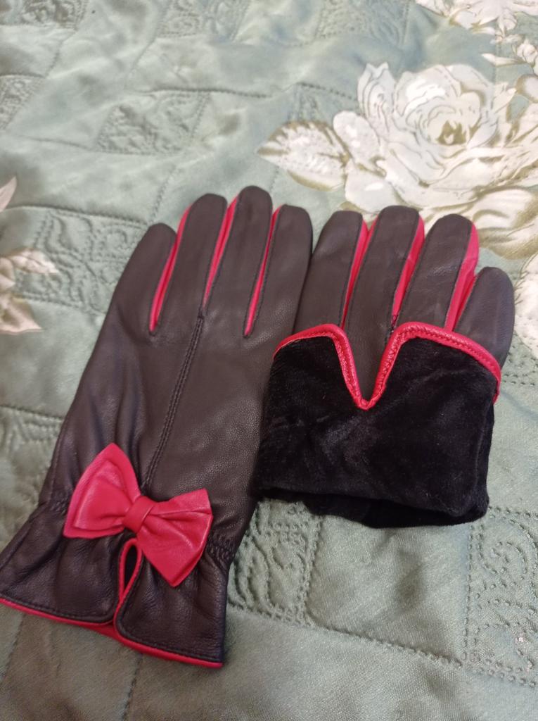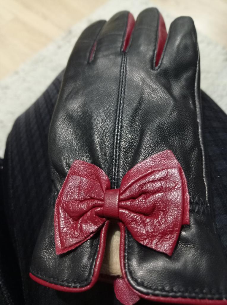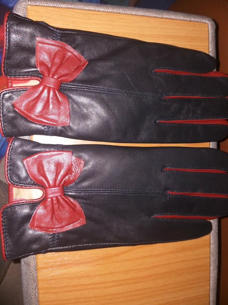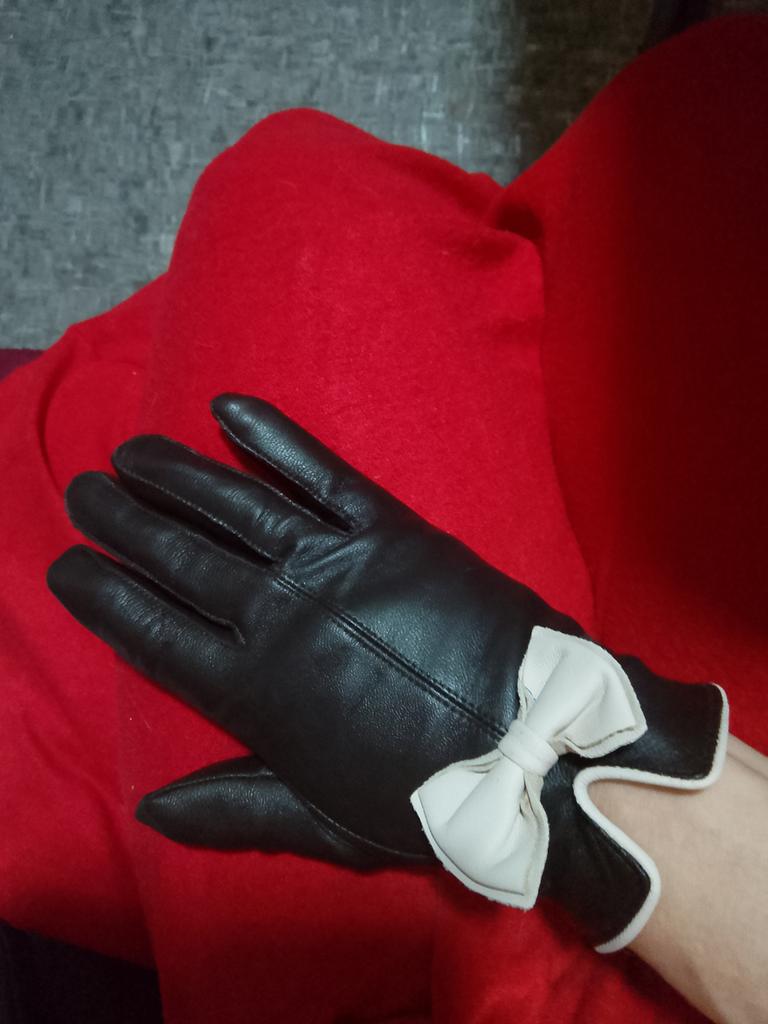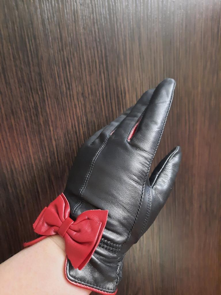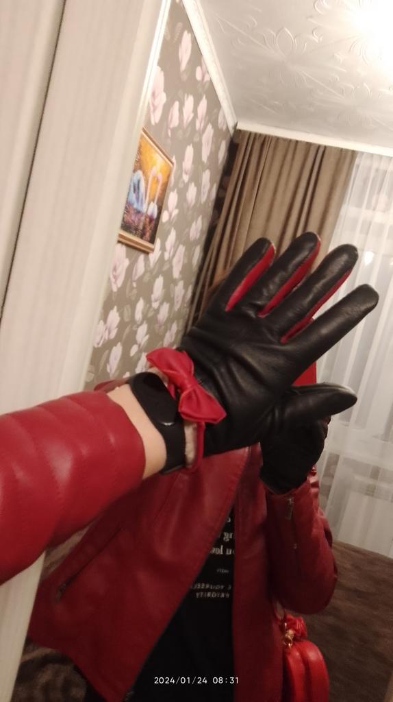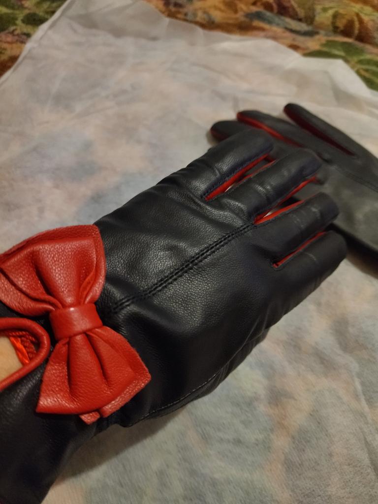 Gloves π€β€οΈ Genuine leather (they really smell like leather! There is a genuine leather label inside). Inside there is a light plush lining. Suitable for cold autumn, but in principle everything is individual π Black with red trim and bows π£π Everything is done very carefully π Size L fits wrist circumference 18cm and palm width 8cm. π The price is especially nice for the promotion of 3 productsπ€ Recommend βββββ Happy shopping everyone! πΉ