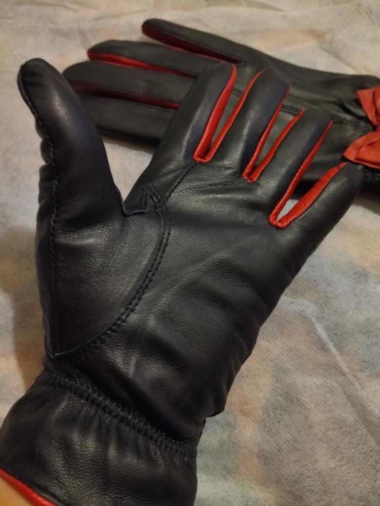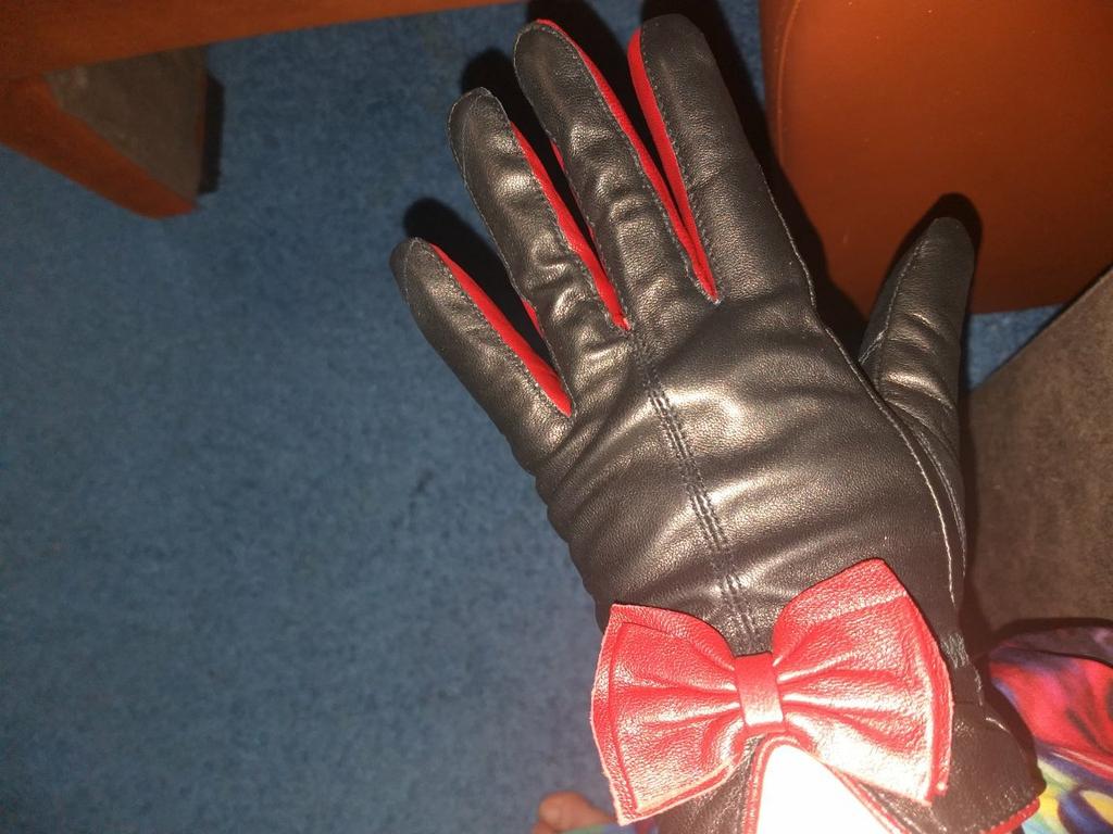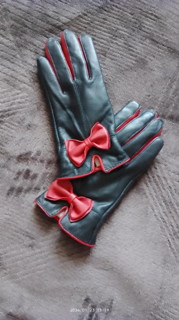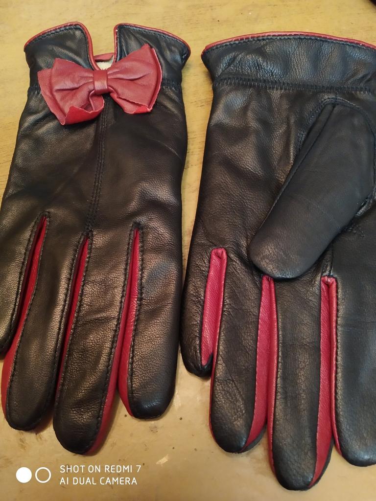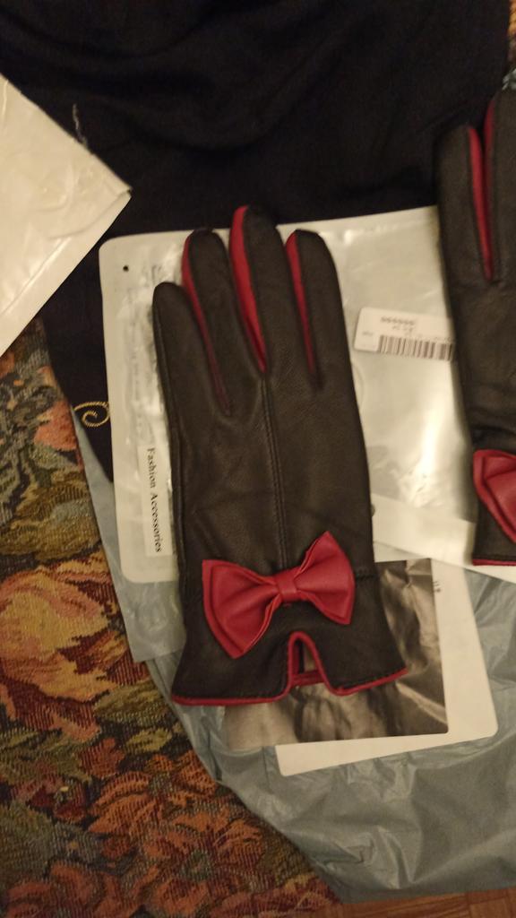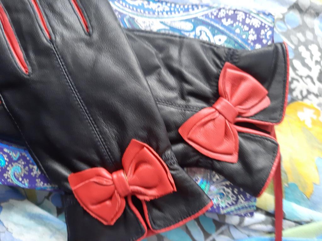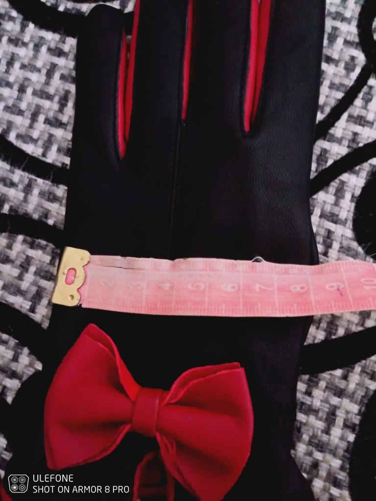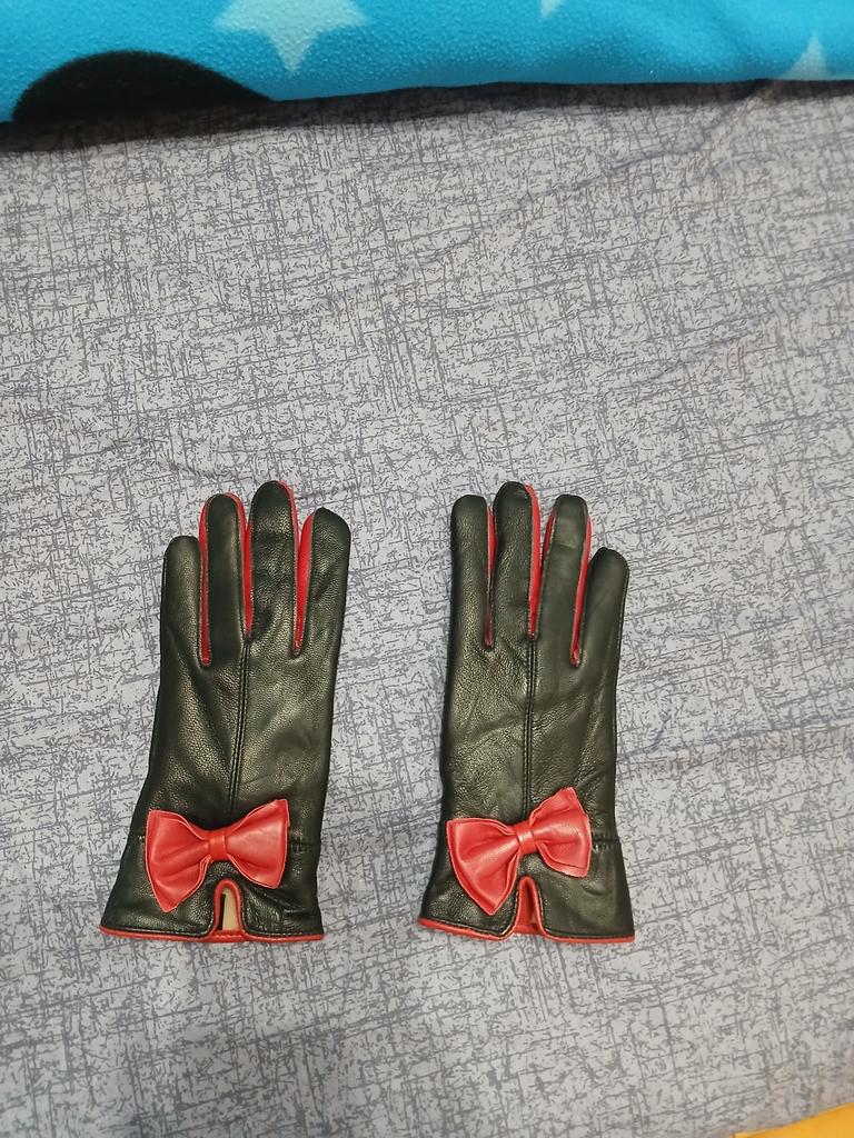 Gloves π€β€οΈ Genuine leather (they really smell like leather! There is a genuine leather label inside). Inside there is a light plush lining. Suitable for cold autumn, but in principle everything is individual π Black with red trim and bows π£π Everything is done very carefully π Size L fits wrist circumference 18cm and palm width 8cm. π The price is especially nice for the promotion of 3 productsπ€ Recommend βββββ Happy shopping everyone! πΉ