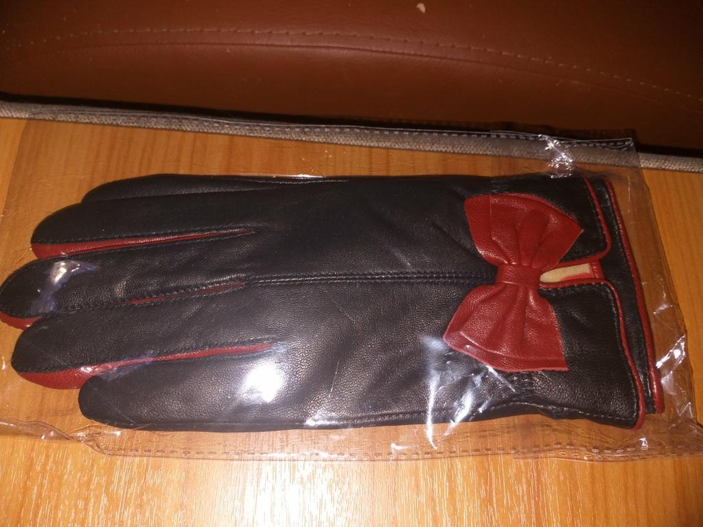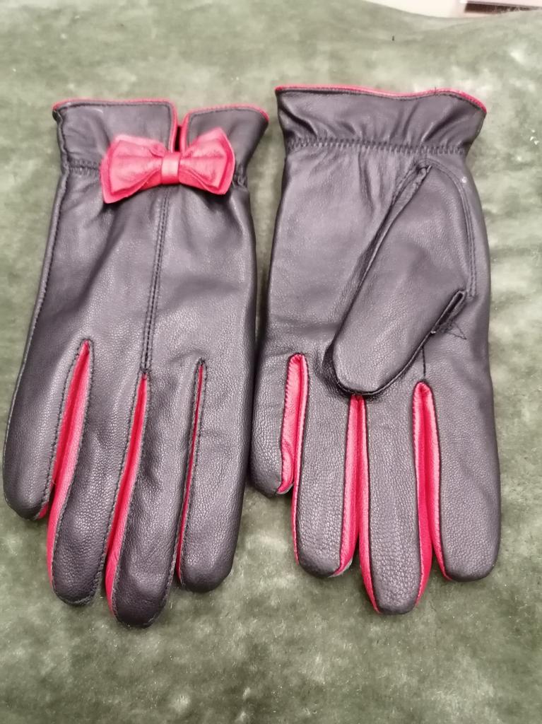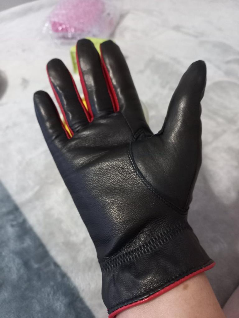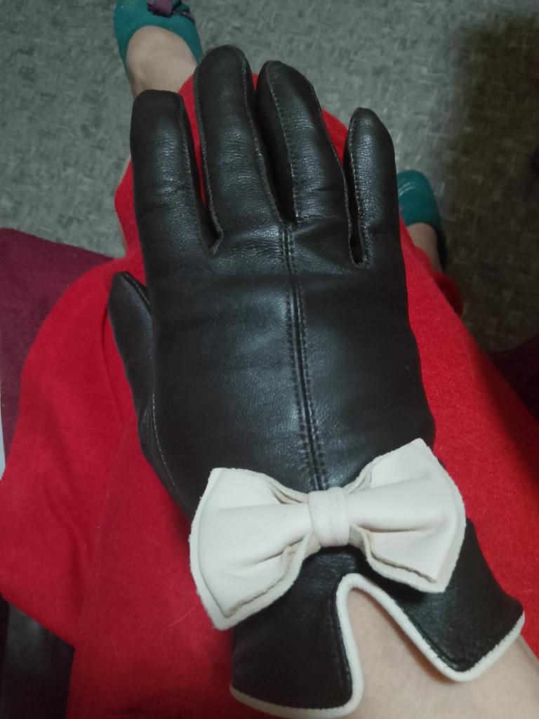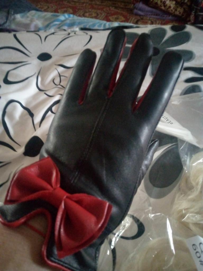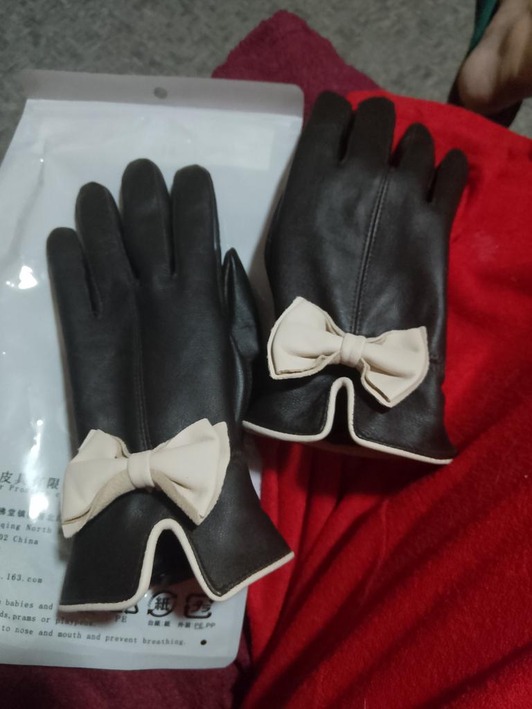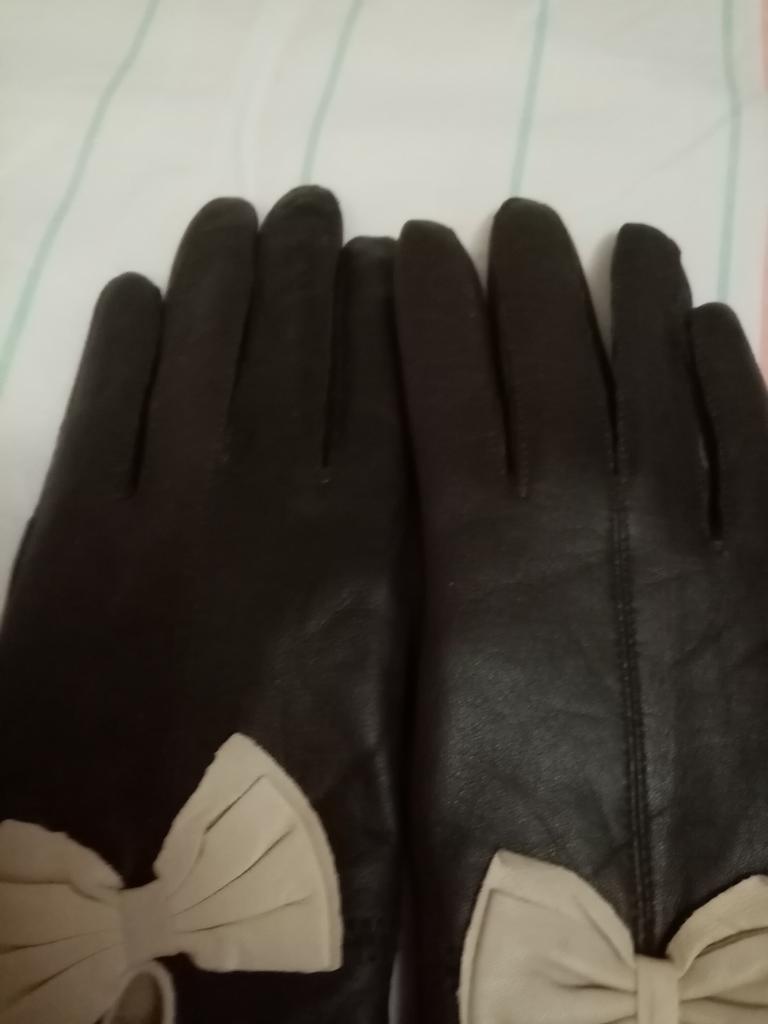 Gloves π€β€οΈ Genuine leather (they really smell like leather! There is a genuine leather label inside). Inside there is a light plush lining. Suitable for cold autumn, but in principle everything is individual π Black with red trim and bows π£π Everything is done very carefully π Size L fits wrist circumference 18cm and palm width 8cm. π The price is especially nice for the promotion of 3 productsπ€ Recommend βββββ Happy shopping everyone! πΉ