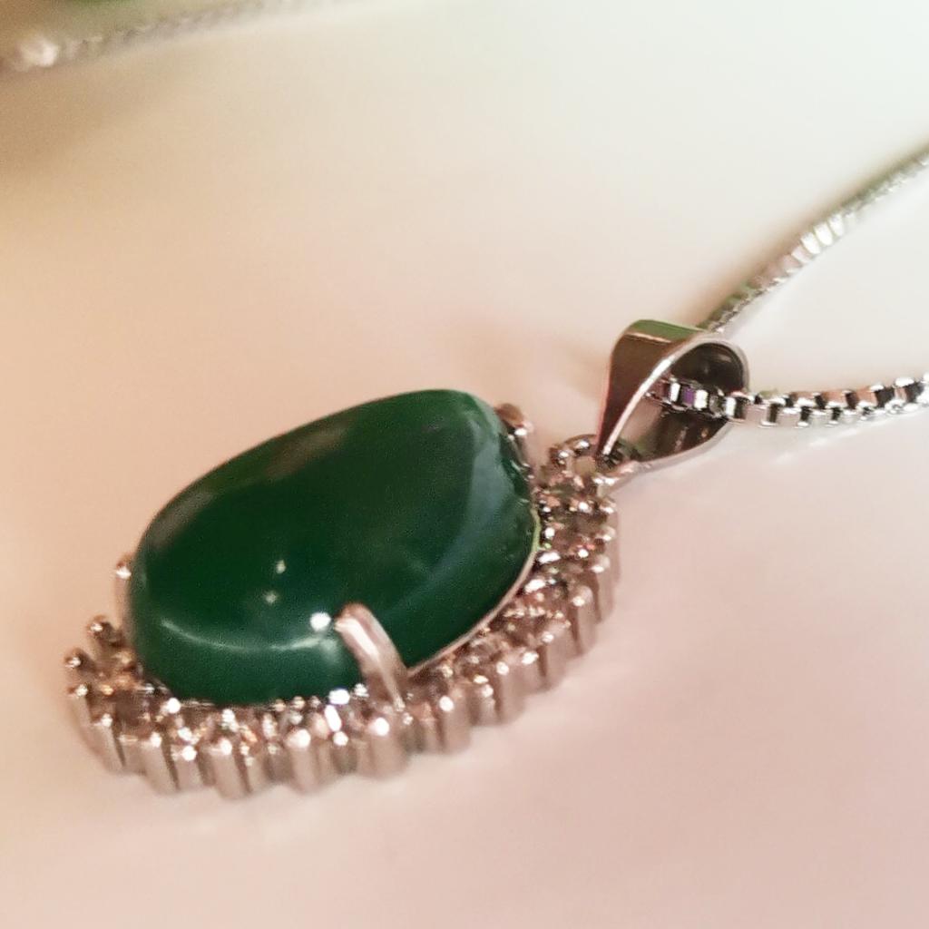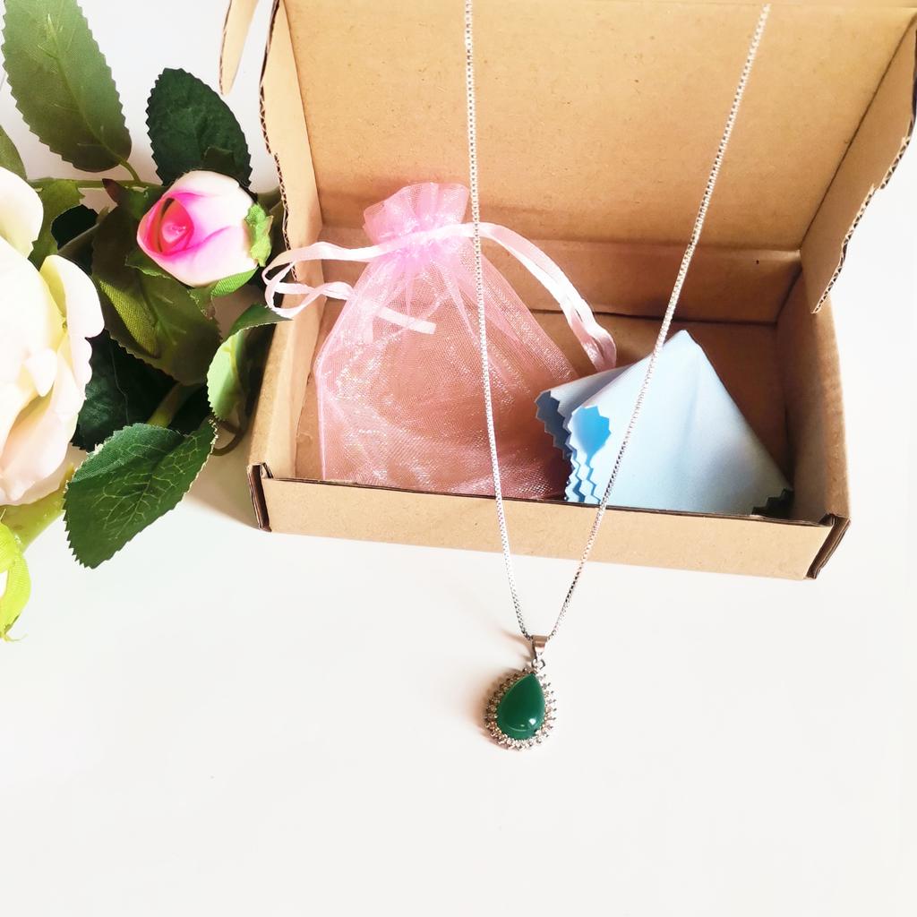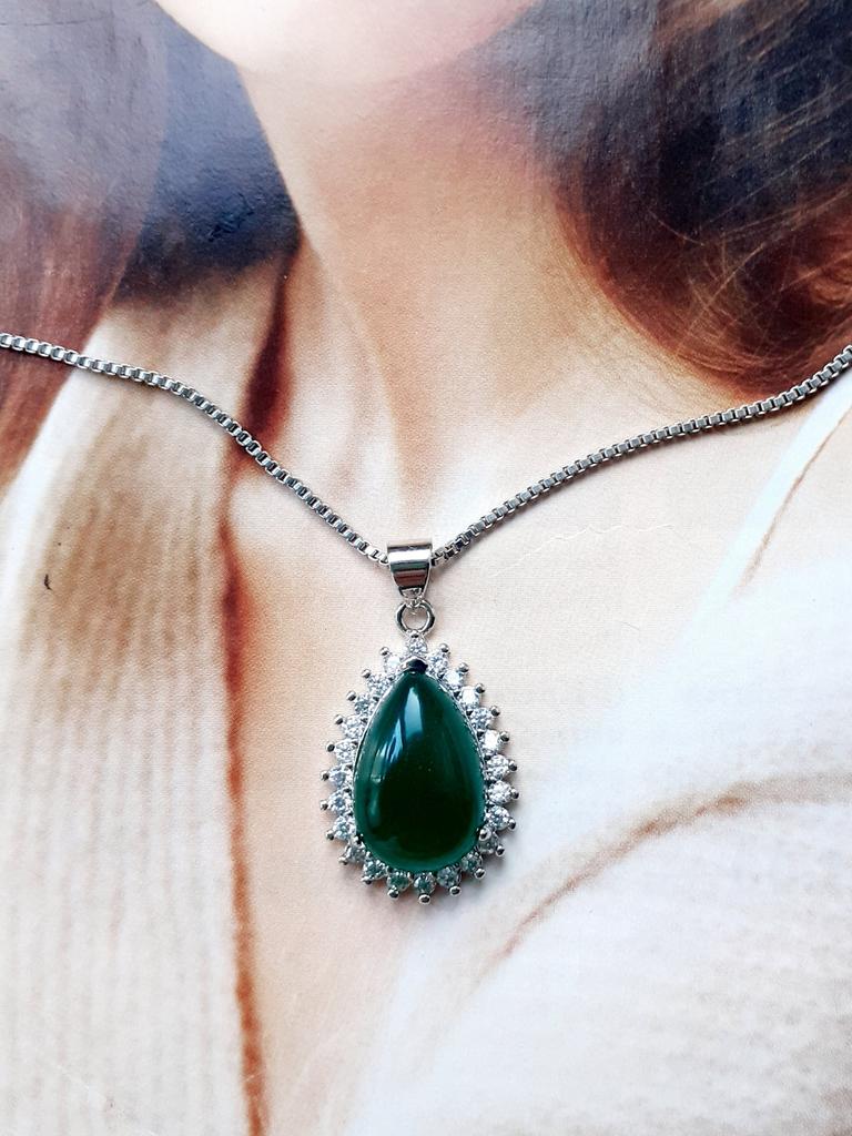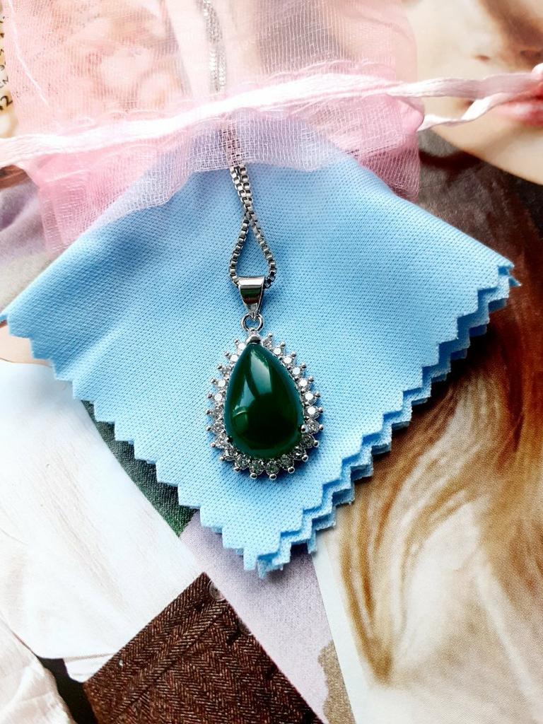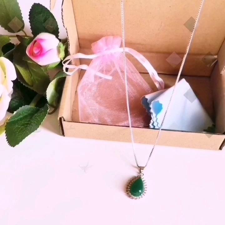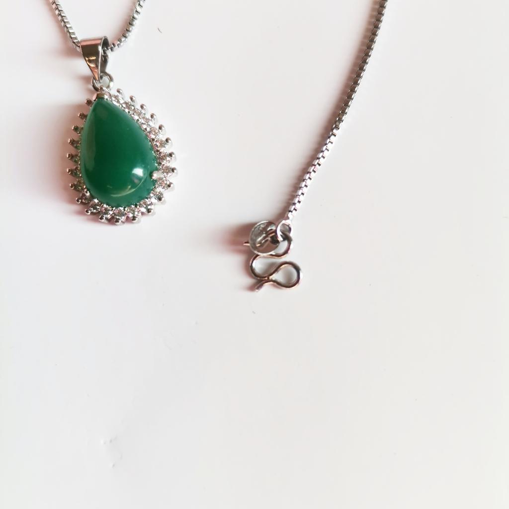 NECKLACE A necklace with an elegant and refined style. I am always satisfied with the articles of this brand. Stylish models, low prices and attention to detail. 😍 Arrived in Italy with tracking in 24 days. Super fast shipping. Packing: carton box The necklace comes with an organza fabric pouch. Perfect for a gift, you will make a great impression. In the package the seller also put a gift: a small cleaning cloth. Necklace material: silver plated copper. At the pendant, the drop-cut green stone measuring 19 x 14 mm. All around there are small white zircons to give greater brightness. The chain is 45 cm long. Hook closure, unusual but functional. The crystals are extremely bright and carefully set. No defects, no glue stains. Recommended purchase 👌