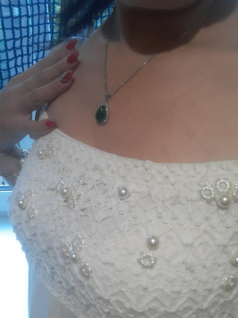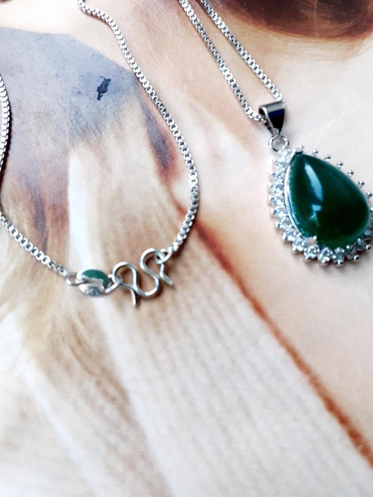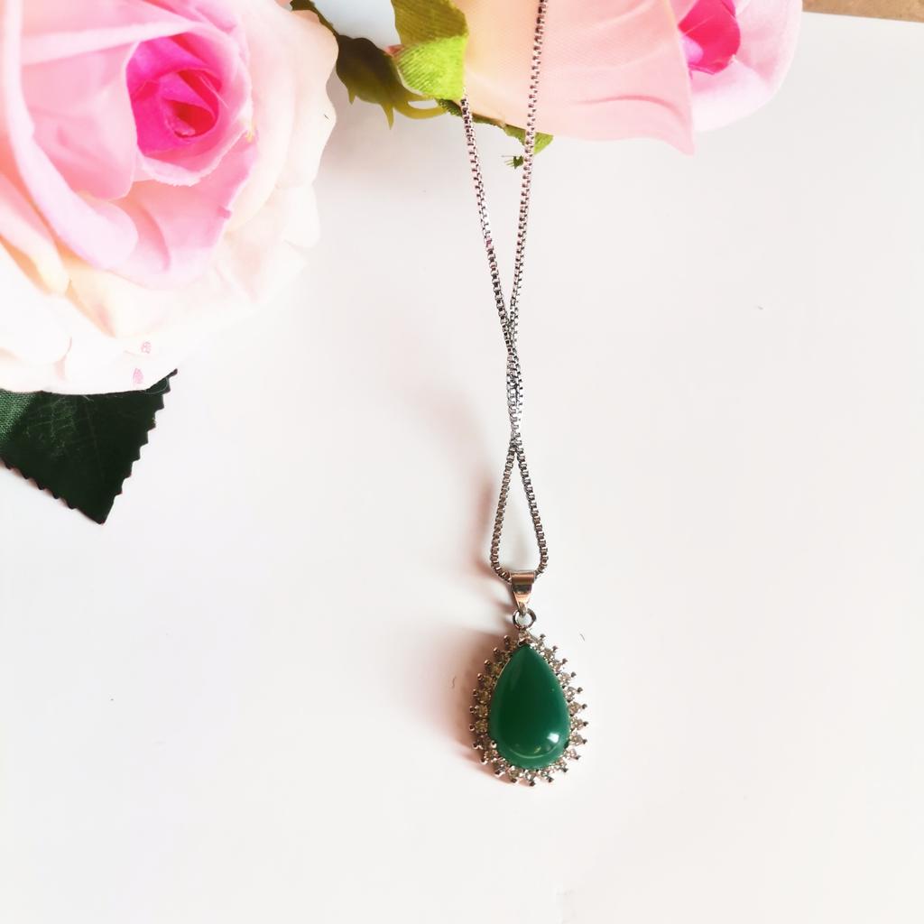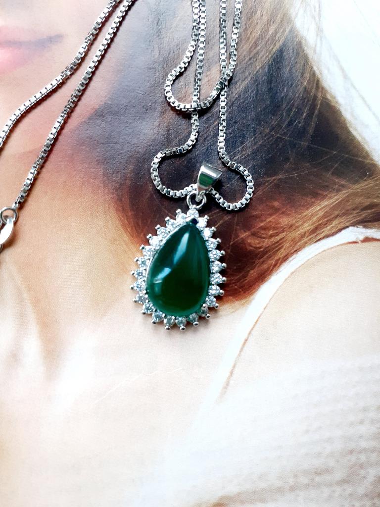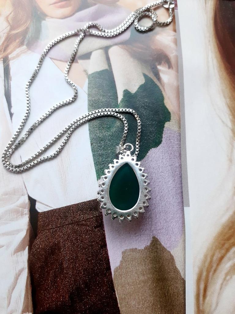 NECKLACE A necklace with an elegant and refined style. I am always satisfied with the articles of this brand. Stylish models, low prices and attention to detail. 😍 Arrived in Italy with tracking in 24 days. Super fast shipping. Packing: carton box The necklace comes with an organza fabric pouch. Perfect for a gift, you will make a great impression. In the package the seller also put a gift: a small cleaning cloth. Necklace material: silver plated copper. At the pendant, the drop-cut green stone measuring 19 x 14 mm. All around there are small white zircons to give greater brightness. The chain is 45 cm long. Hook closure, unusual but functional. The crystals are extremely bright and carefully set. No defects, no glue stains. Recommended purchase 👌