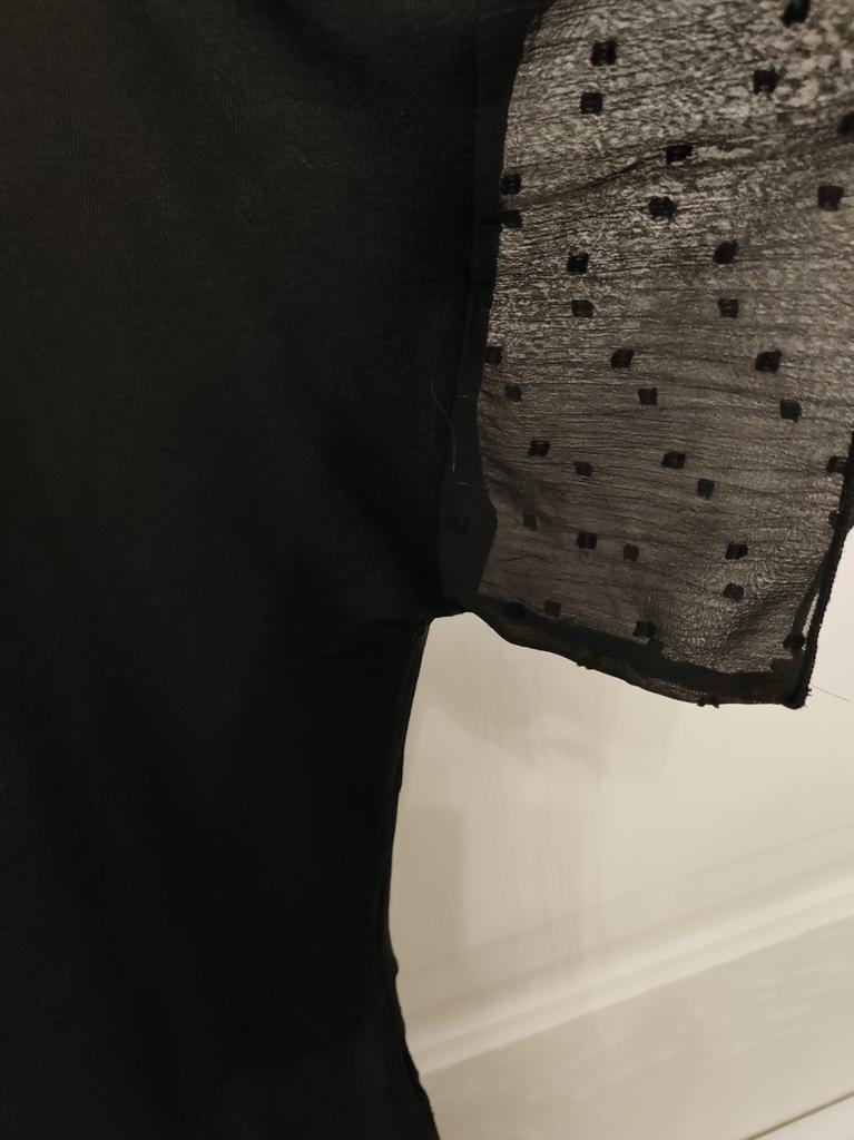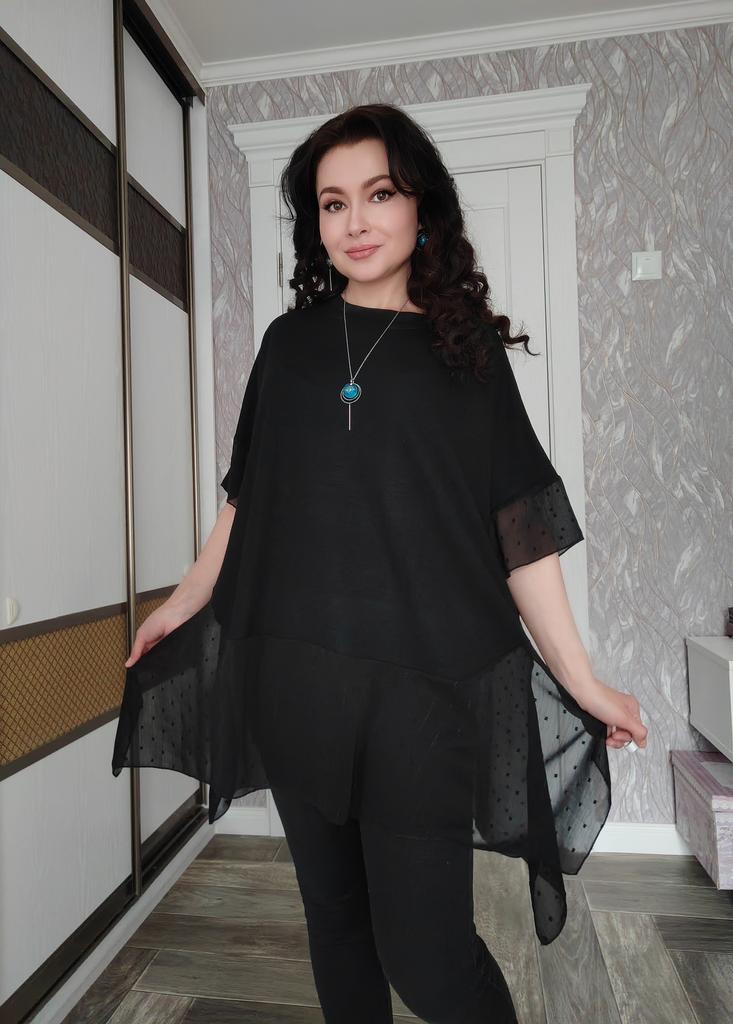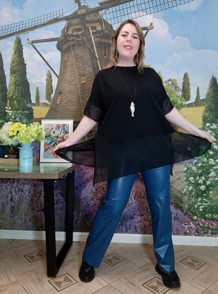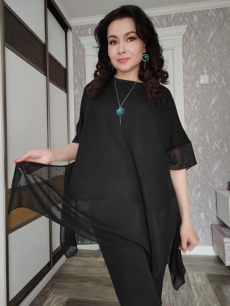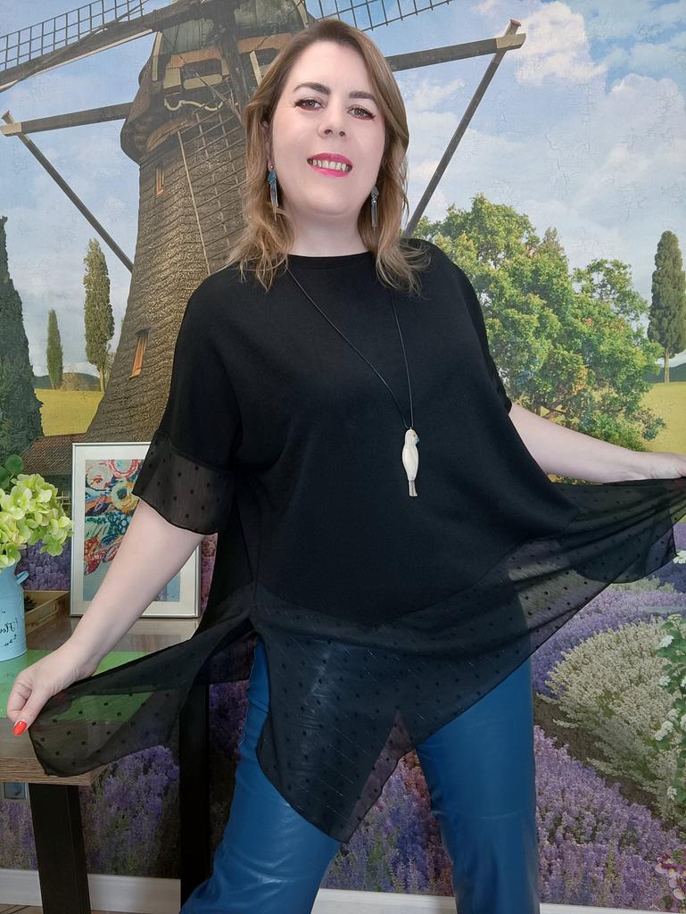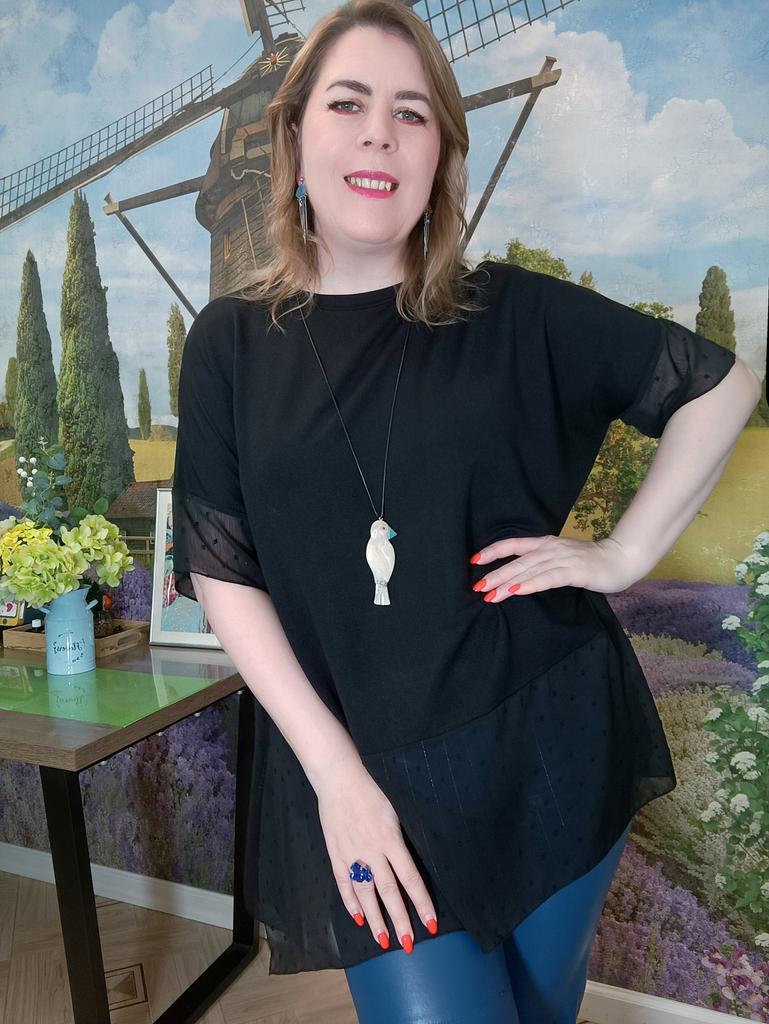 Black Blouse with Tulle Bottom – Elegance and Unique Details! ⭐⭐⭐⭐⭐ Design and Style: This blouse is a true style gem. The design combines a covered black fabric top with a ruffled bottom and semi-transparent tulle sleeves with a "plumetis" (small polka dot) pattern. This detail makes it much more original than a classic black top, perfect for those who want a sophisticated look without sacrificing comfort.. Material and Comfort: The fabric is light and drapes softly on the body, without clinging. The tulle is soft and doesn't scratch, a fundamental detail for all-day comfort. It's the type of garment that makes you feel put-together immediately: just pair it with a pair of jeans (as in the photos) or elegant trousers for an impeccable result.. One Size Fits All: Being a one-size-fits-all, the fit is intentionally loose and "boxy". From the photos, you can see how the cut is flowing, which makes it suitable for different body types (from S to XL). The short sleeves with the sheer detail add a touch of lightness to the overall silhouette.. Final Judgment: Excellent value for money on Joom. It's a versatile garment suitable for both formal occasions and casual outings. Arrived within the expected timeframe and well-packaged. An purchase I would absolutely make again! ✨🖤
