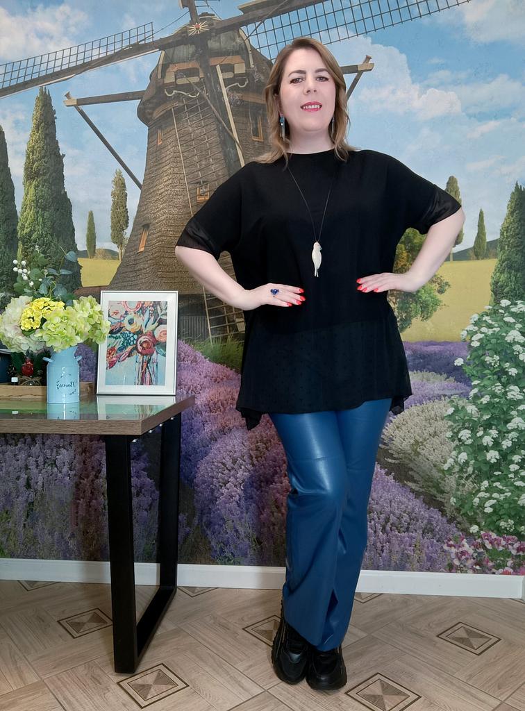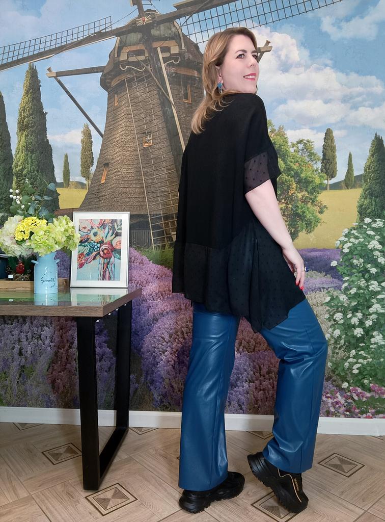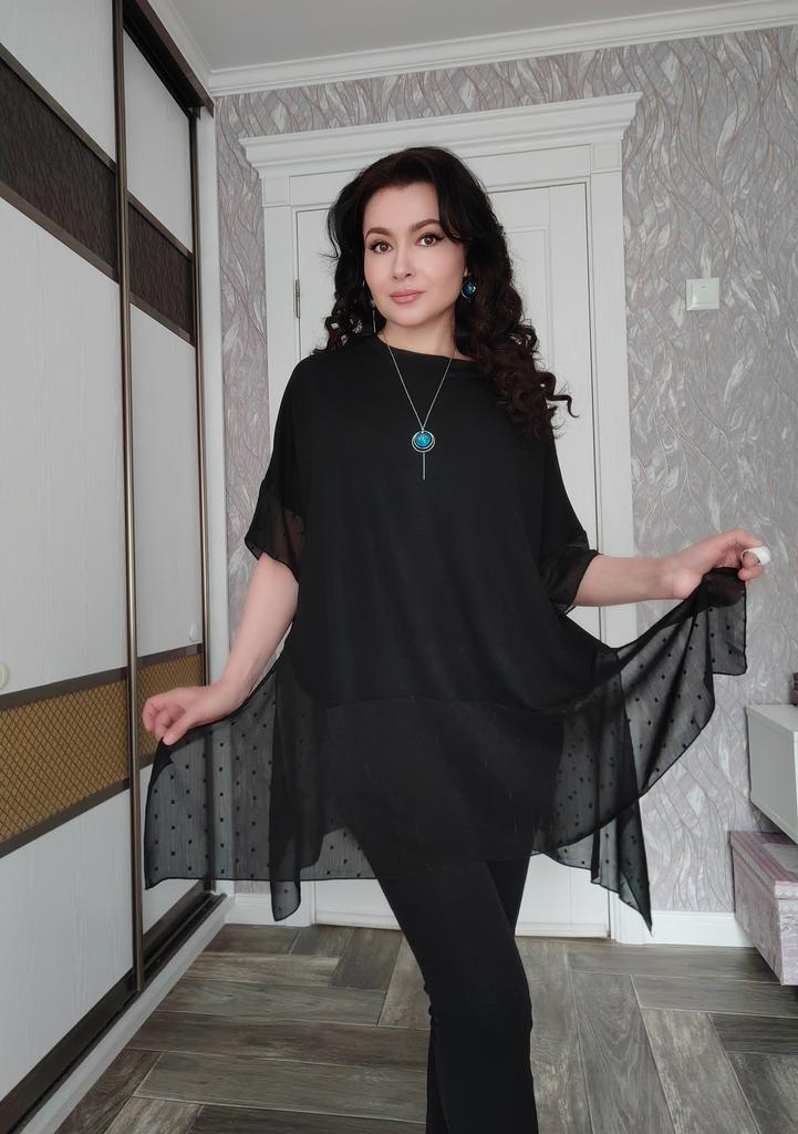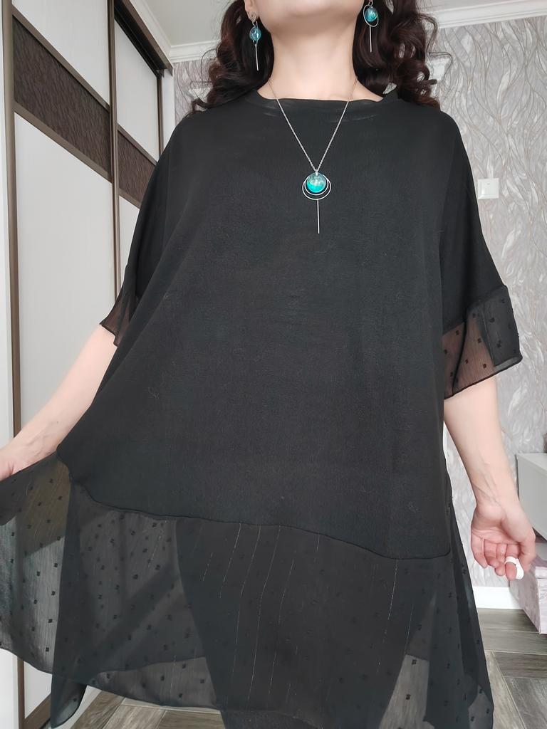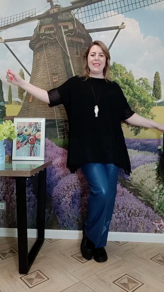 Black Blouse with Tulle Bottom – Elegance and Unique Details! ⭐⭐⭐⭐⭐ Design and Style: This blouse is a true style gem. The design combines a covered black fabric top with a ruffled bottom and semi-transparent tulle sleeves with a "plumetis" (small polka dot) pattern. This detail makes it much more original than a classic black top, perfect for those who want a sophisticated look without sacrificing comfort.. Material and Comfort: The fabric is light and drapes softly on the body, without clinging. The tulle is soft and doesn't scratch, a fundamental detail for all-day comfort. It's the type of garment that makes you feel put-together immediately: just pair it with a pair of jeans (as in the photos) or elegant trousers for an impeccable result.. One Size Fits All: Being a one-size-fits-all, the fit is intentionally loose and "boxy". From the photos, you can see how the cut is flowing, which makes it suitable for different body types (from S to XL). The short sleeves with the sheer detail add a touch of lightness to the overall silhouette.. Final Judgment: Excellent value for money on Joom. It's a versatile garment suitable for both formal occasions and casual outings. Arrived within the expected timeframe and well-packaged. An purchase I would absolutely make again! ✨🖤