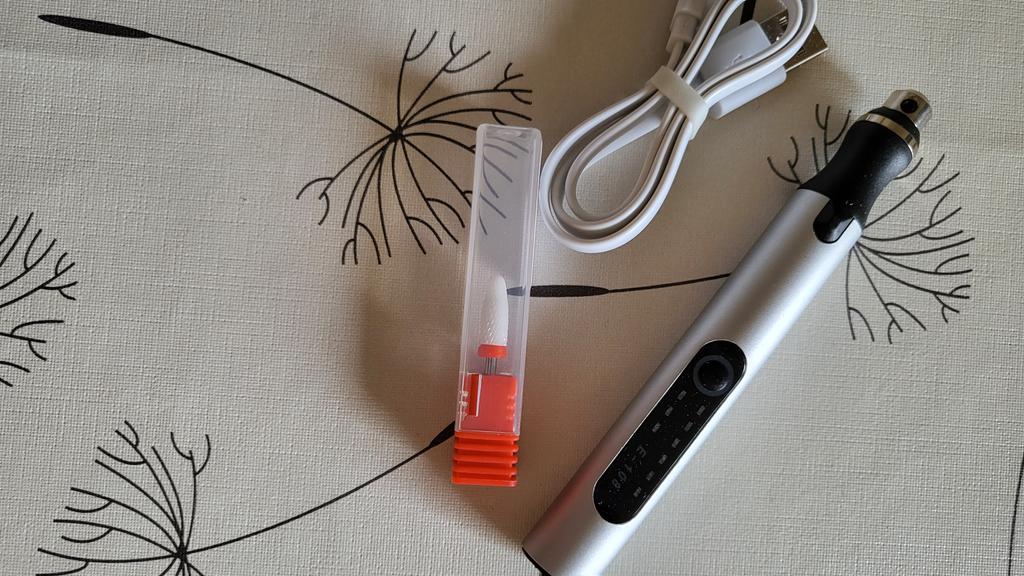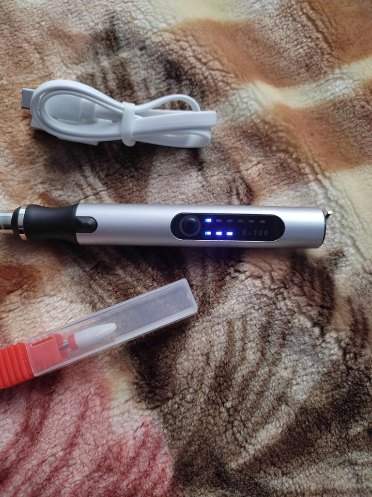 The quality of the manicure machine is good. Charges quickly. Charging lasts about an hour in working order. Where there is a charging pin, fix the bit on the device. Switch the speed by pressing the start button, 1 time - 5000 rpm, 2-10000, 3-15000. There are disadvantages - a very short charging cord, one bit is very small for such a large box, it would be nice to report five pieces, there is a place for this in the box. It is true that the cord can be replaced with Yuisbishny. I hope it helped those who hesitate to buy or not. The device is good, compact, about the size of a marker. They are a pleasure to work with.