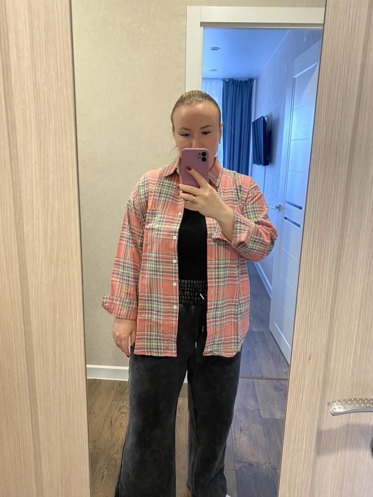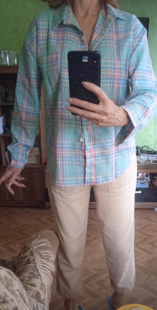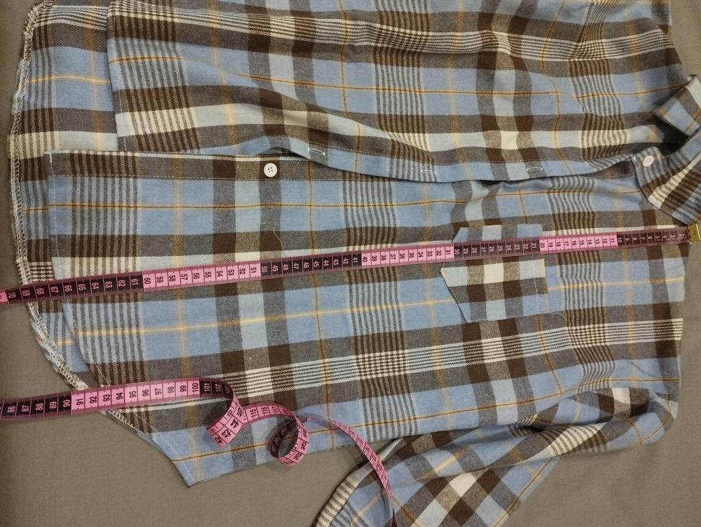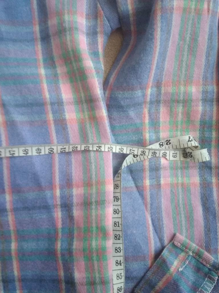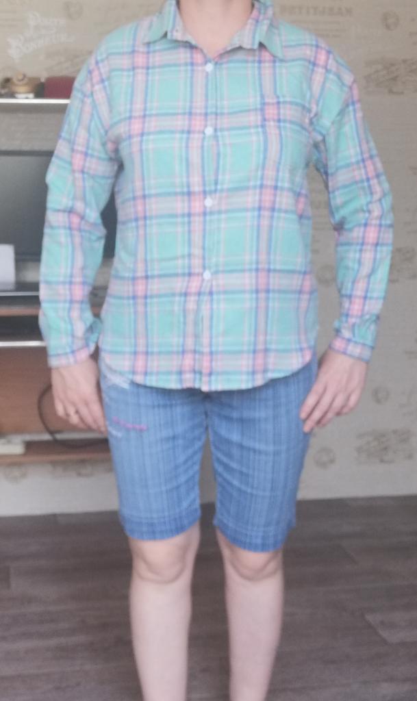 fitted bust 106. hips 110 cm. Shirt made of thin flannel. Adds volume to the figure. Sewn qualitatively, the fabric is soft and pleasant. The color matches the photo. For home or walks