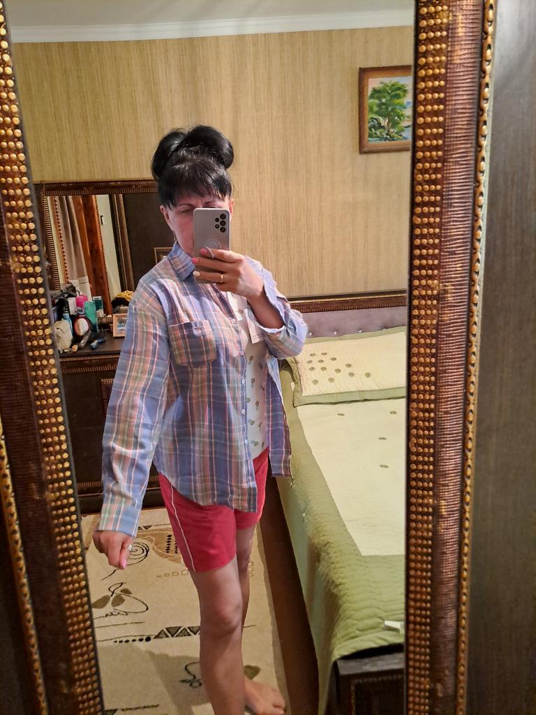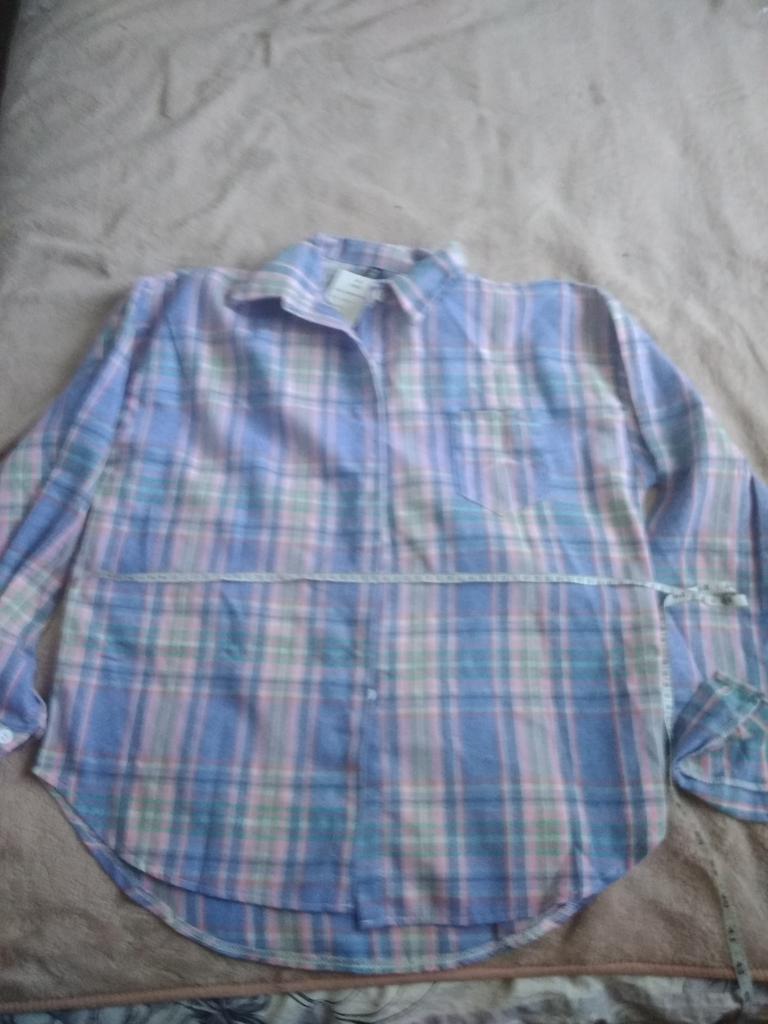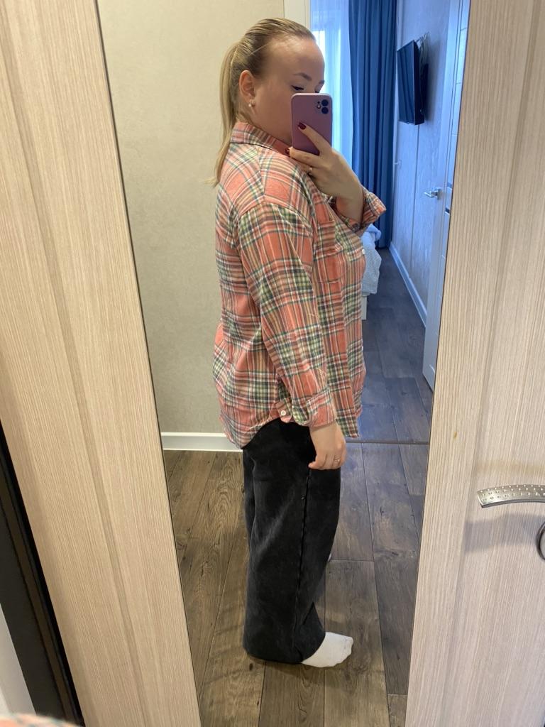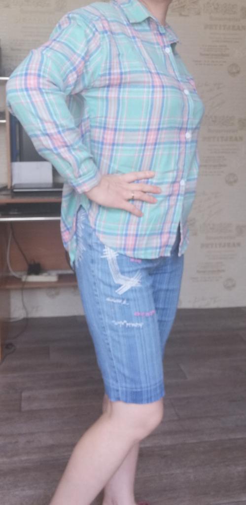 fitted bust 106. hips 110 cm. Shirt made of thin flannel. Adds volume to the figure. Sewn qualitatively, the fabric is soft and pleasant. The color matches the photo. For home or walks