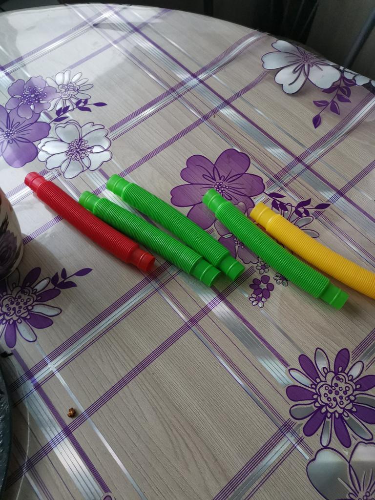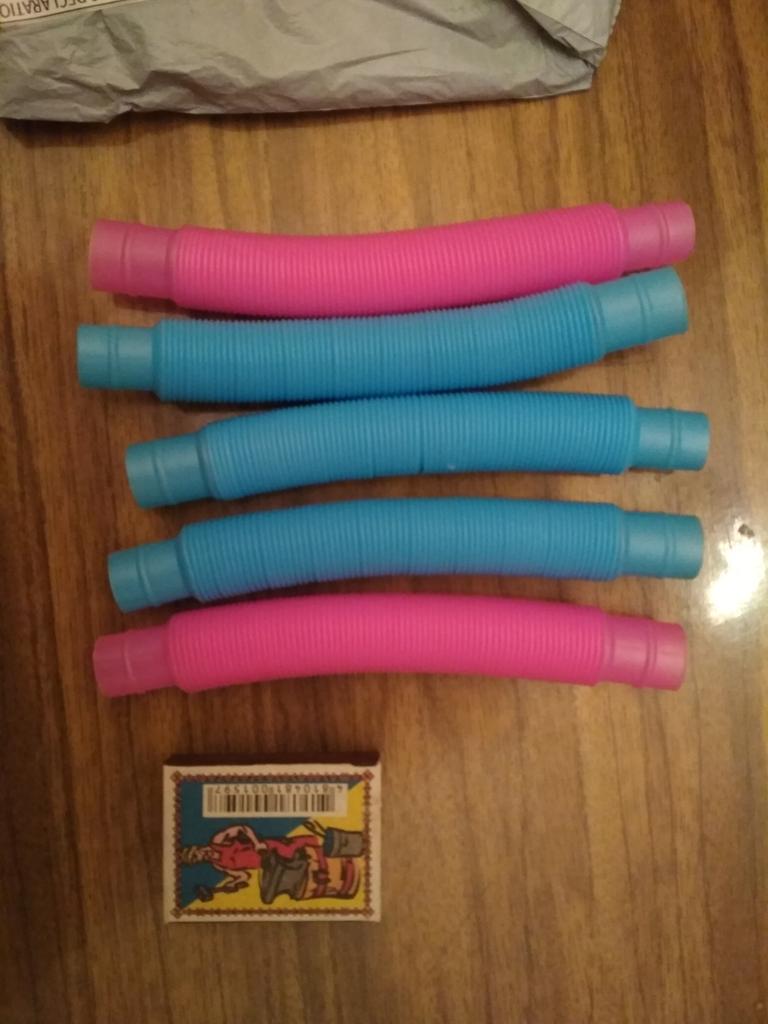 Very long delivery, about two months. The tubes came in 5 pieces, two colors, pink 3 and blue 2.
