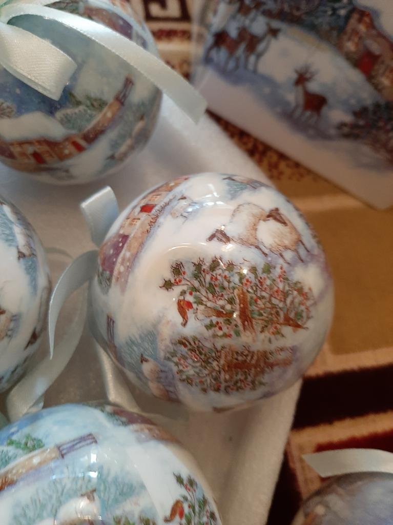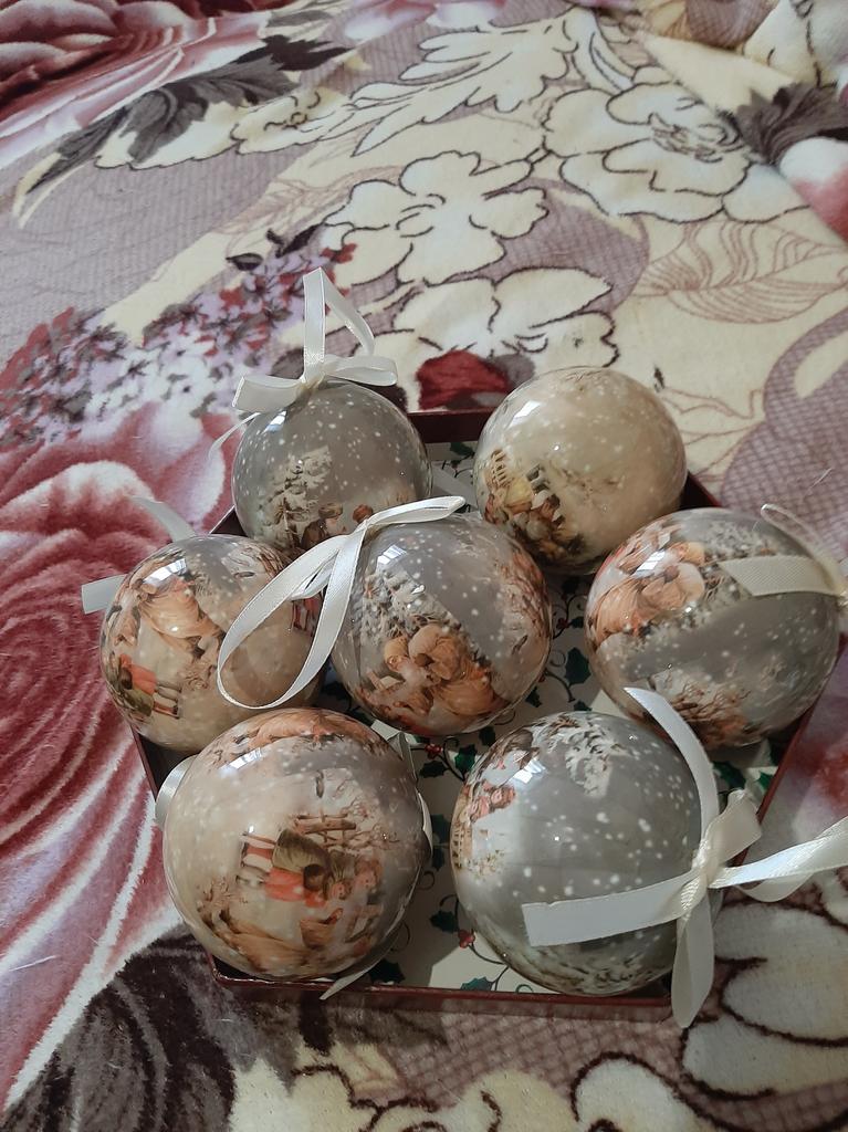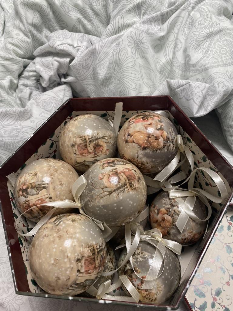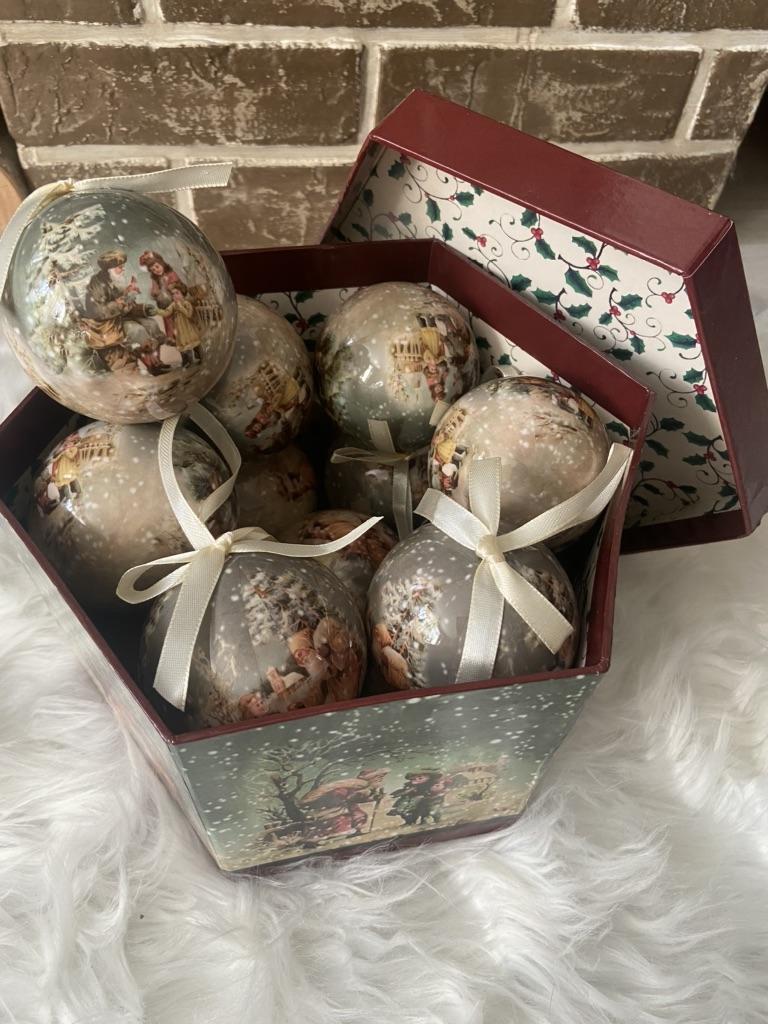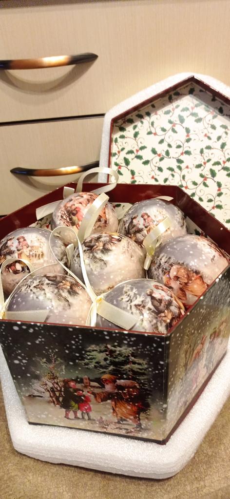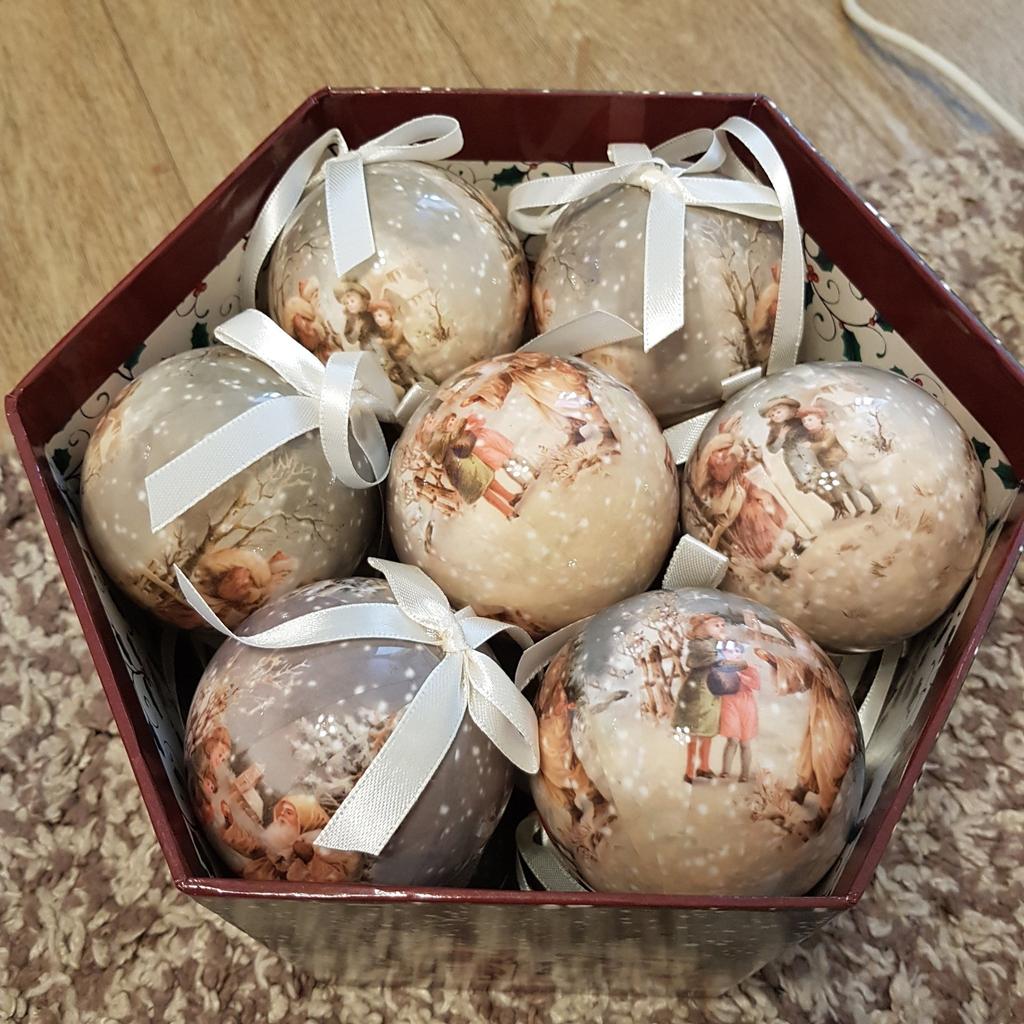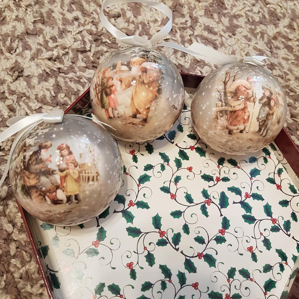 Theae are gorgeous traditional looking baubles. It comes with a really secure package and its own box which is quite good for storage. They're very light and not as breakable which is good if you have a cat.