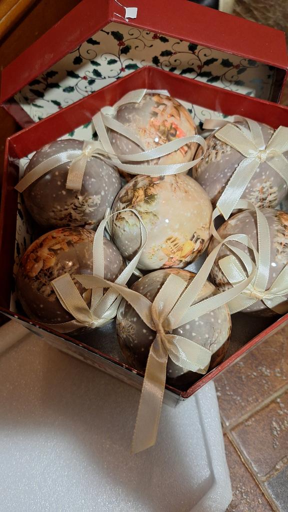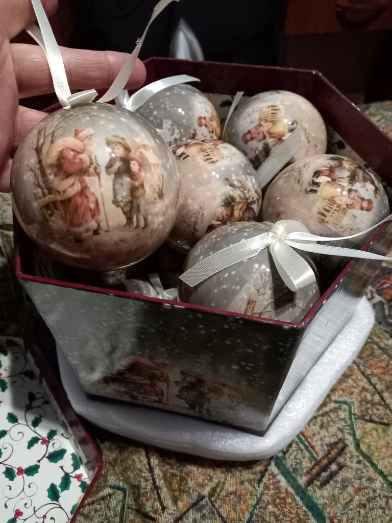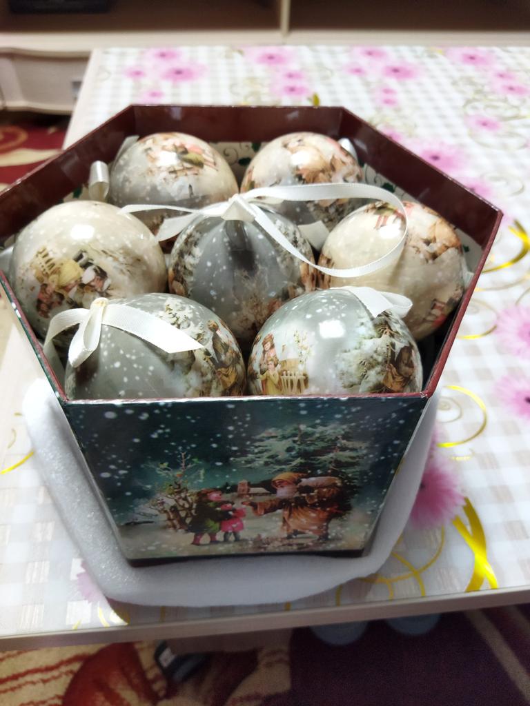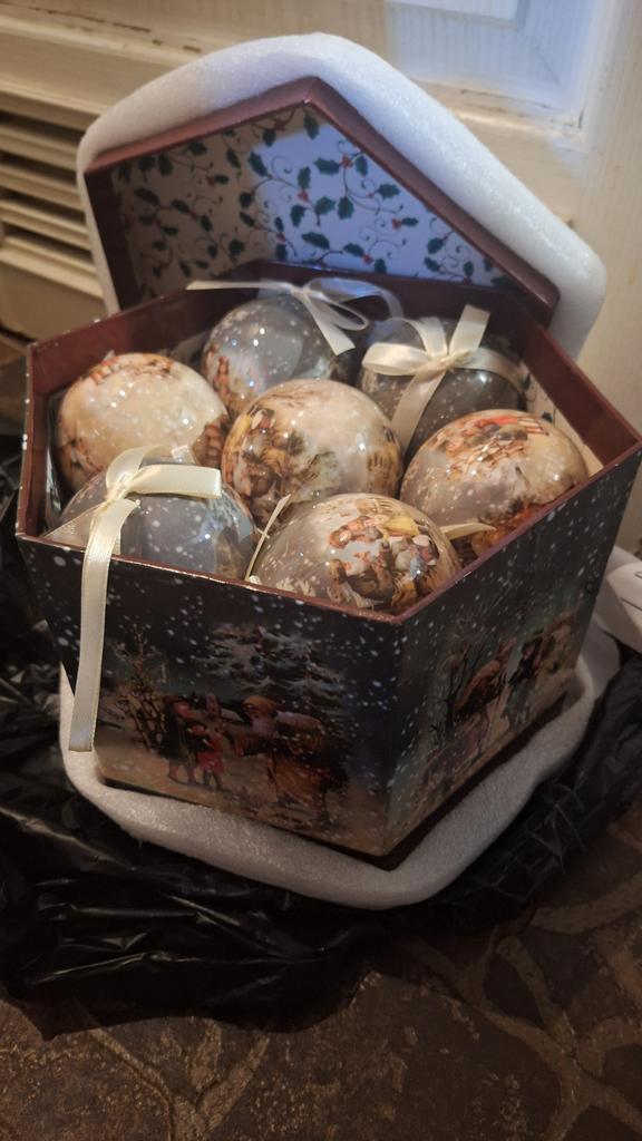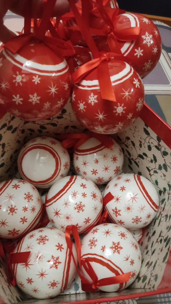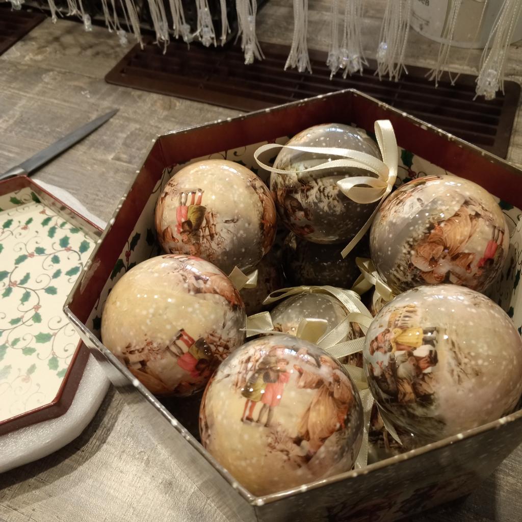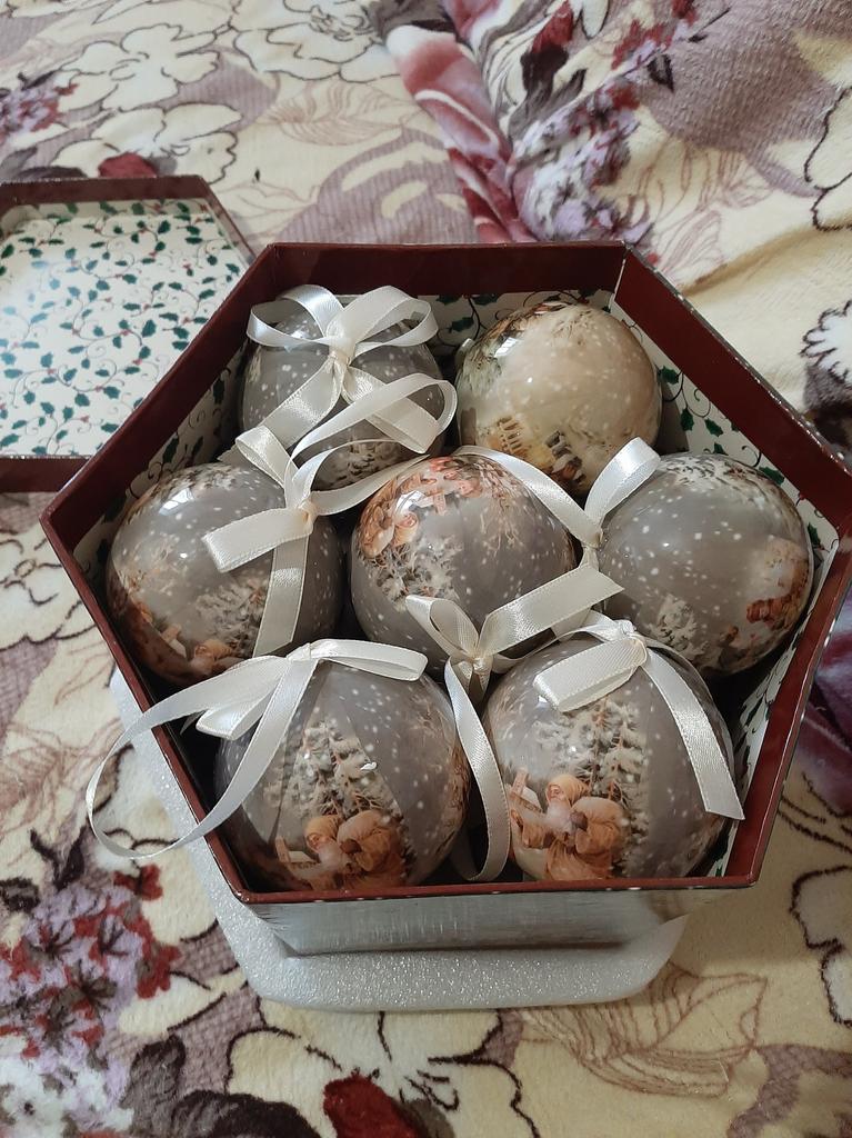 Theae are gorgeous traditional looking baubles. It comes with a really secure package and its own box which is quite good for storage. They're very light and not as breakable which is good if you have a cat.
