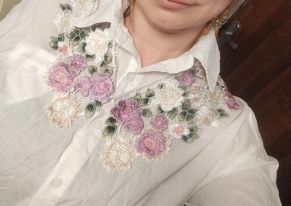 I bought a collar to freshen up a dark dress. The collar is beautiful, embroidered with silk, there is a tie and holes along the edge of the collar for adjustment.