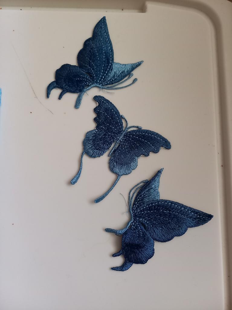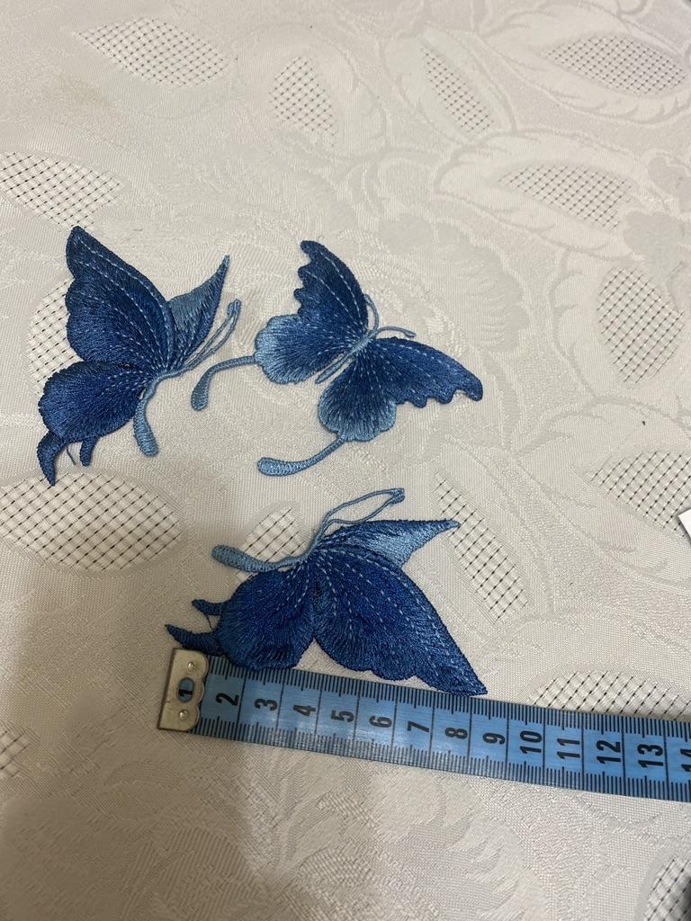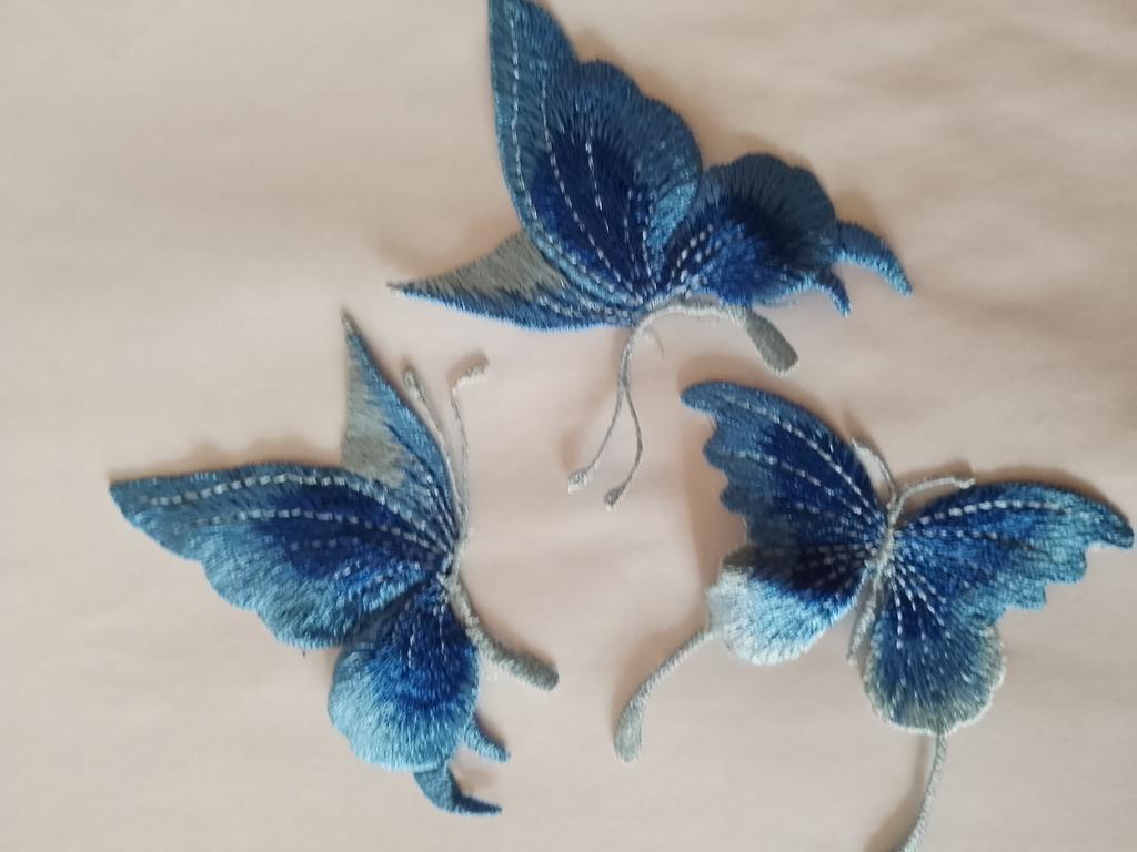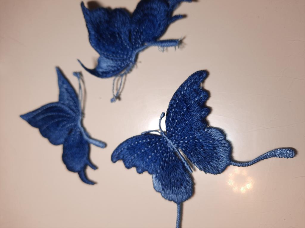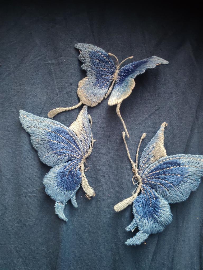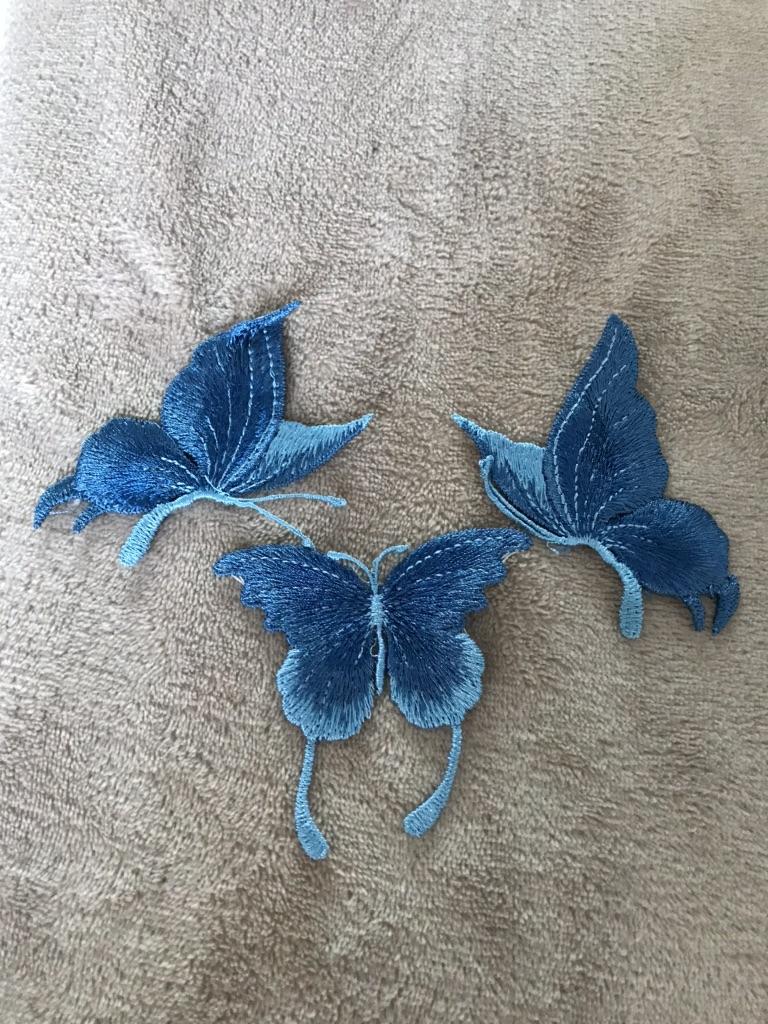 Embroidery, butterflies, excellent quality, blue 2 flying in one direction. Sewn on.