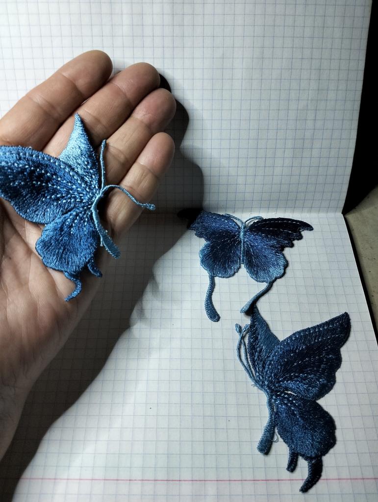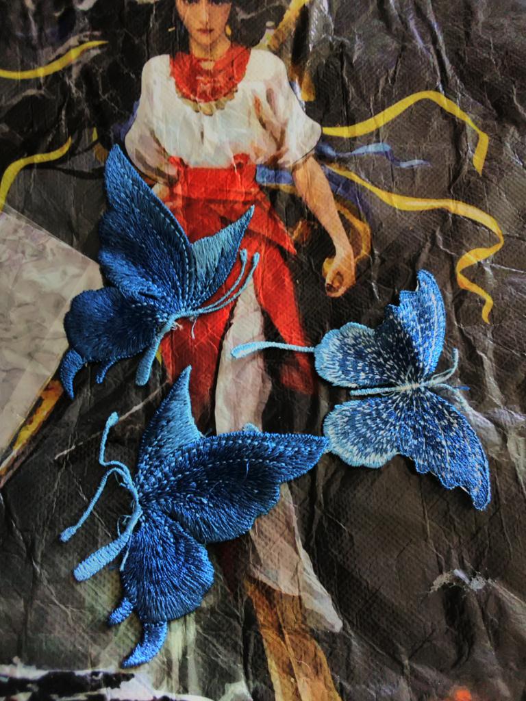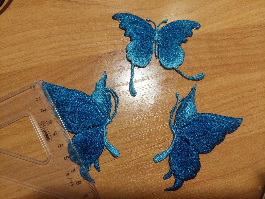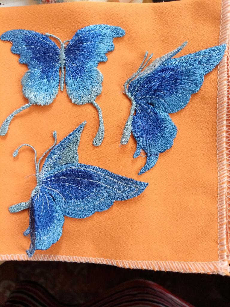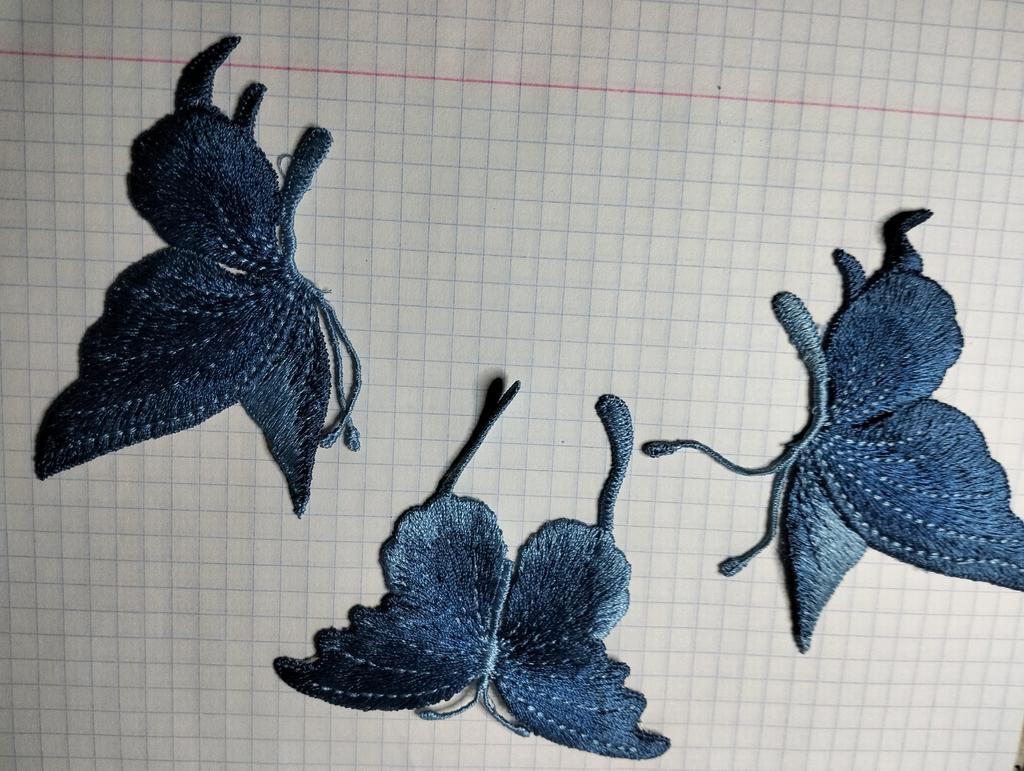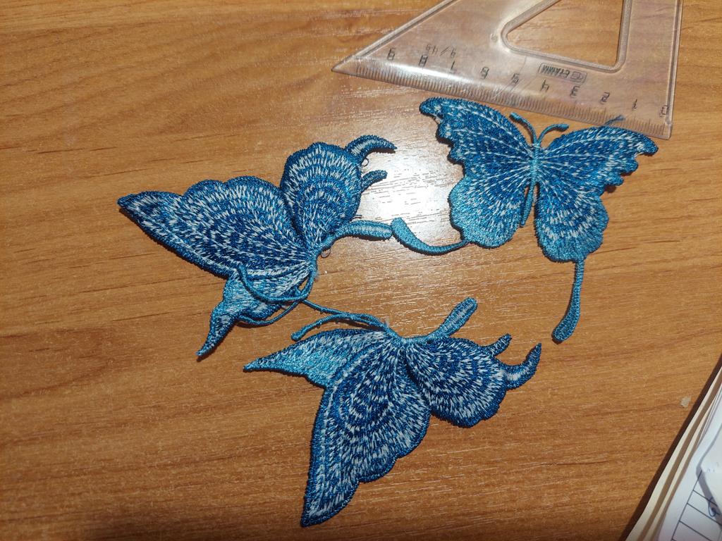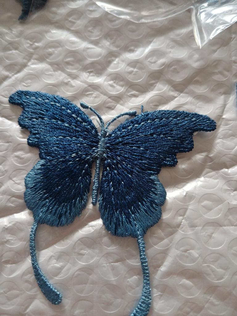 Embroidery, butterflies, excellent quality, blue 2 flying in one direction. Sewn on.