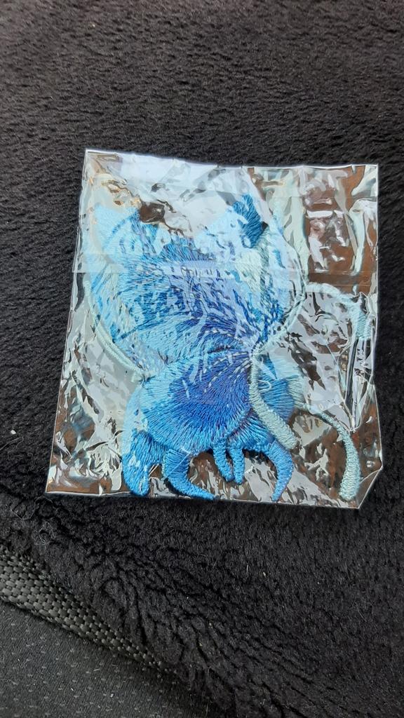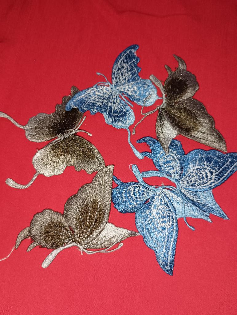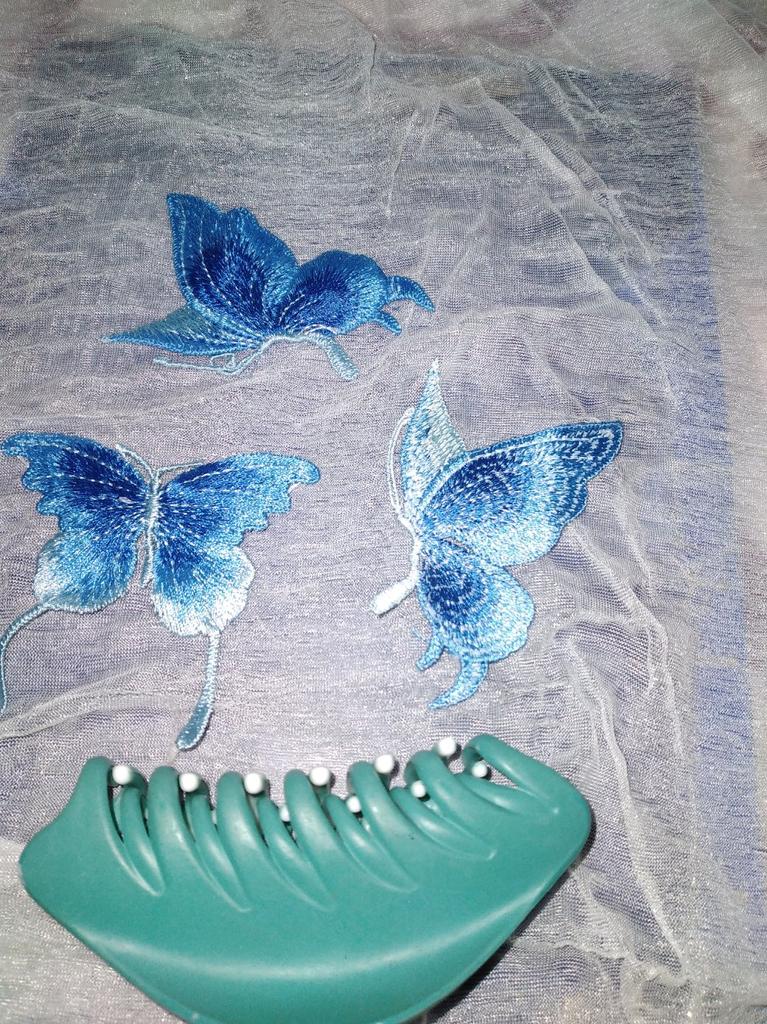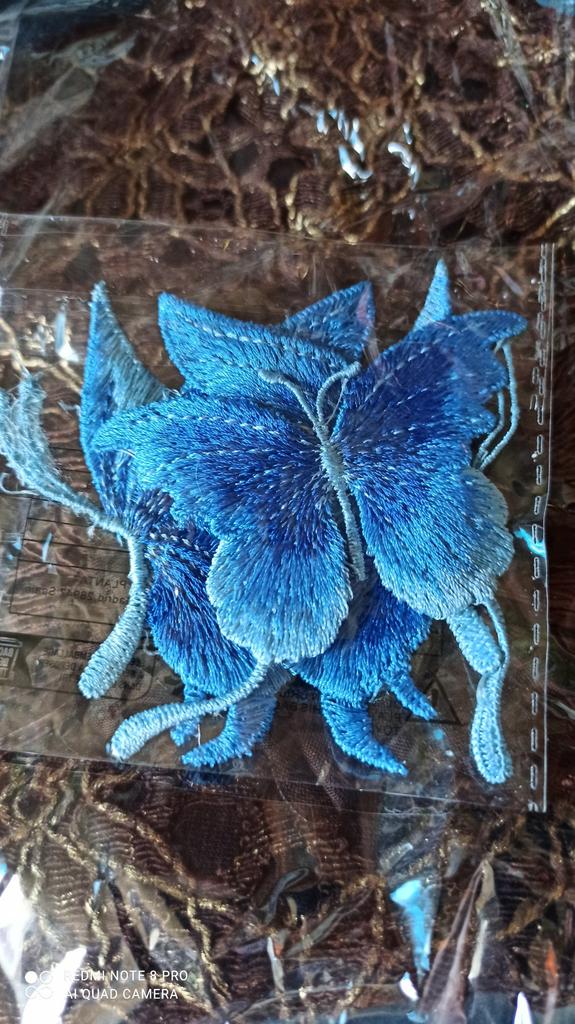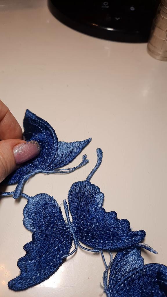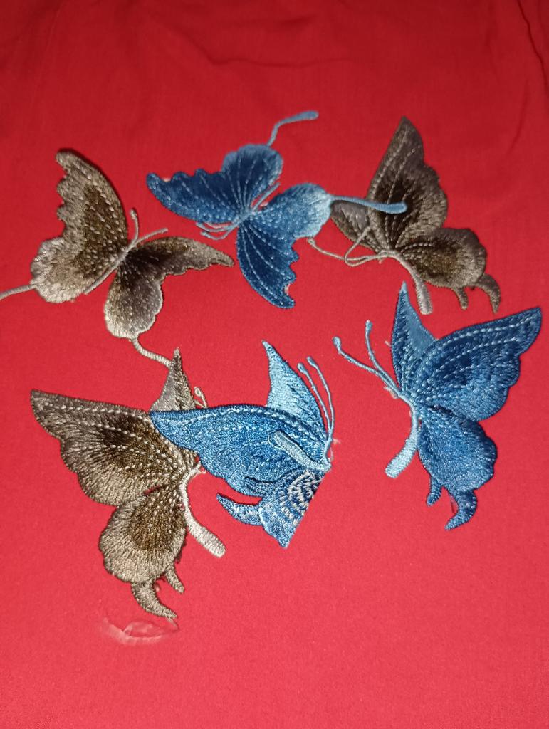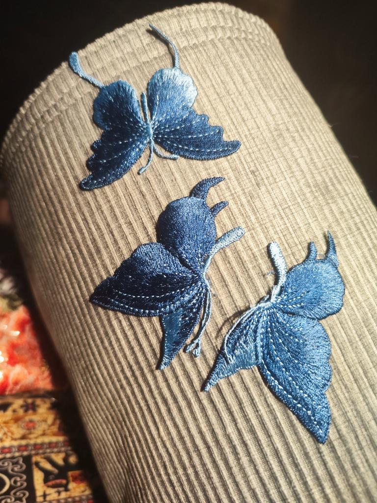 Embroidery, butterflies, excellent quality, blue 2 flying in one direction. Sewn on.