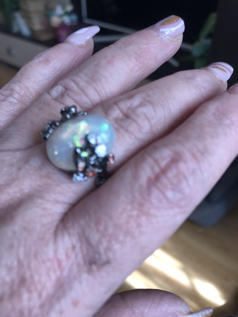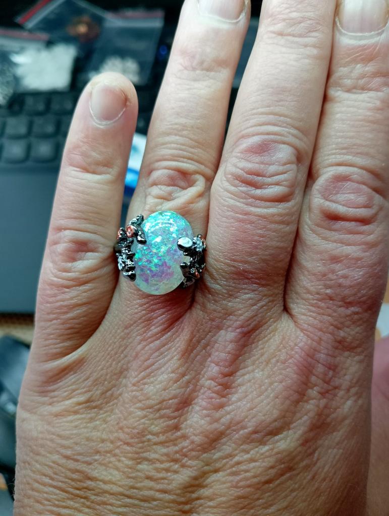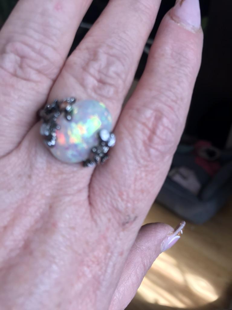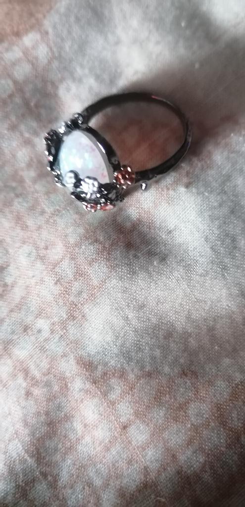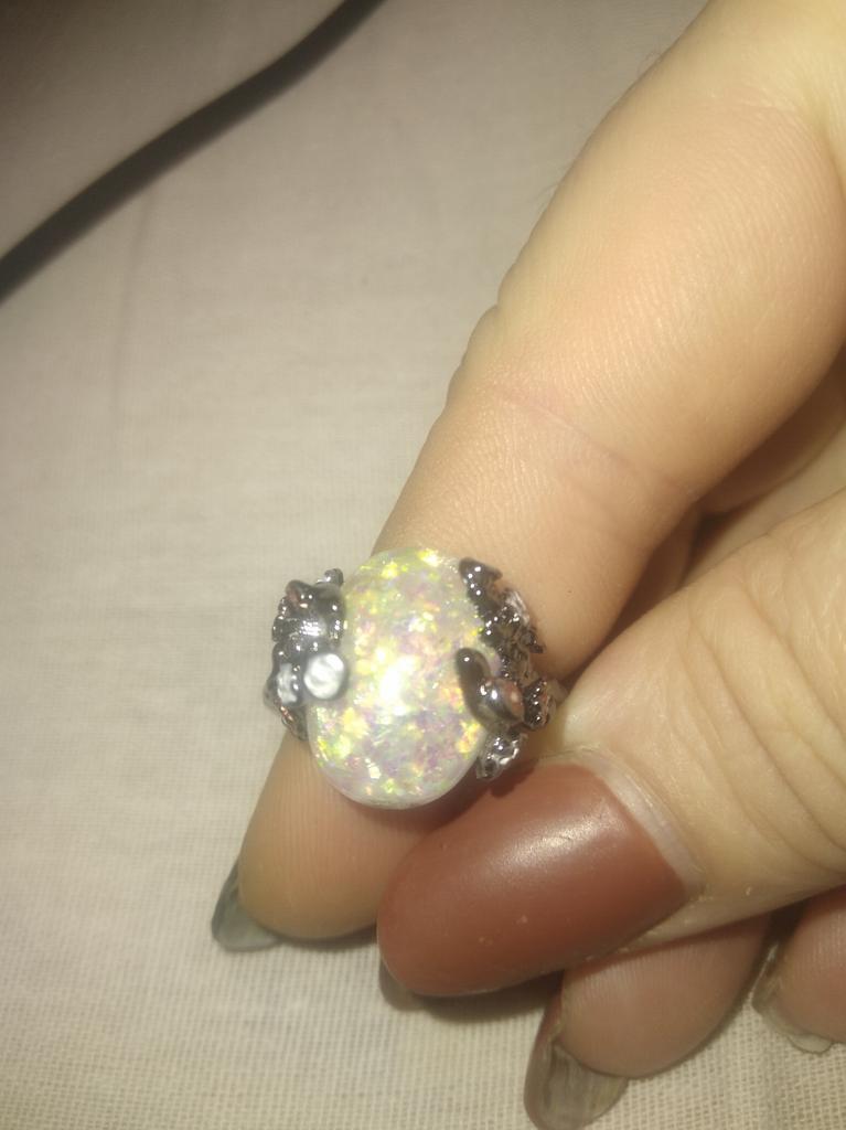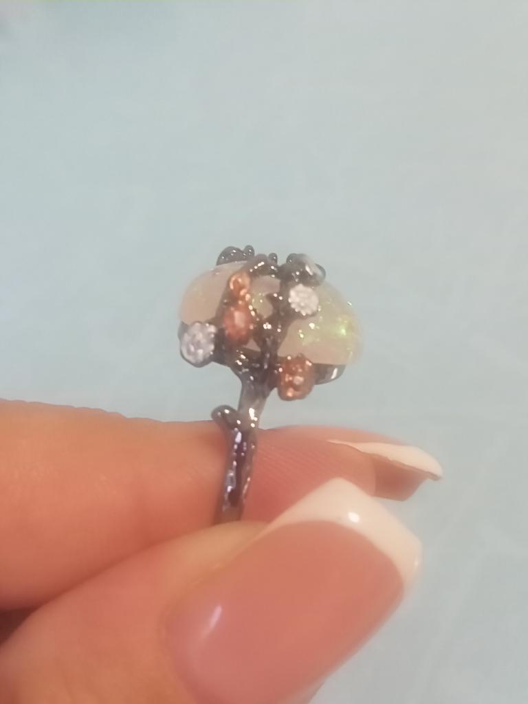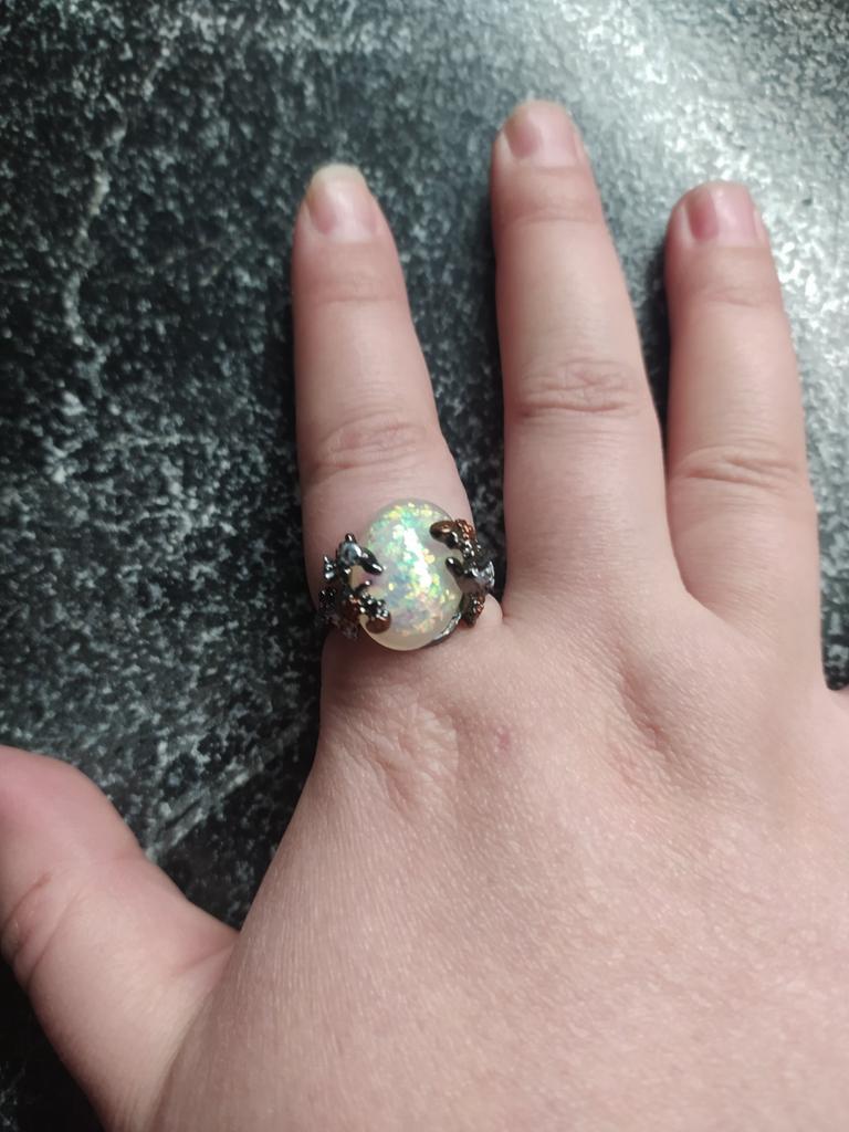 The ring is beautiful, the stone is like an opal, but one flower is broken, it's a pity. It was packed well. It looks like it was already broken.
