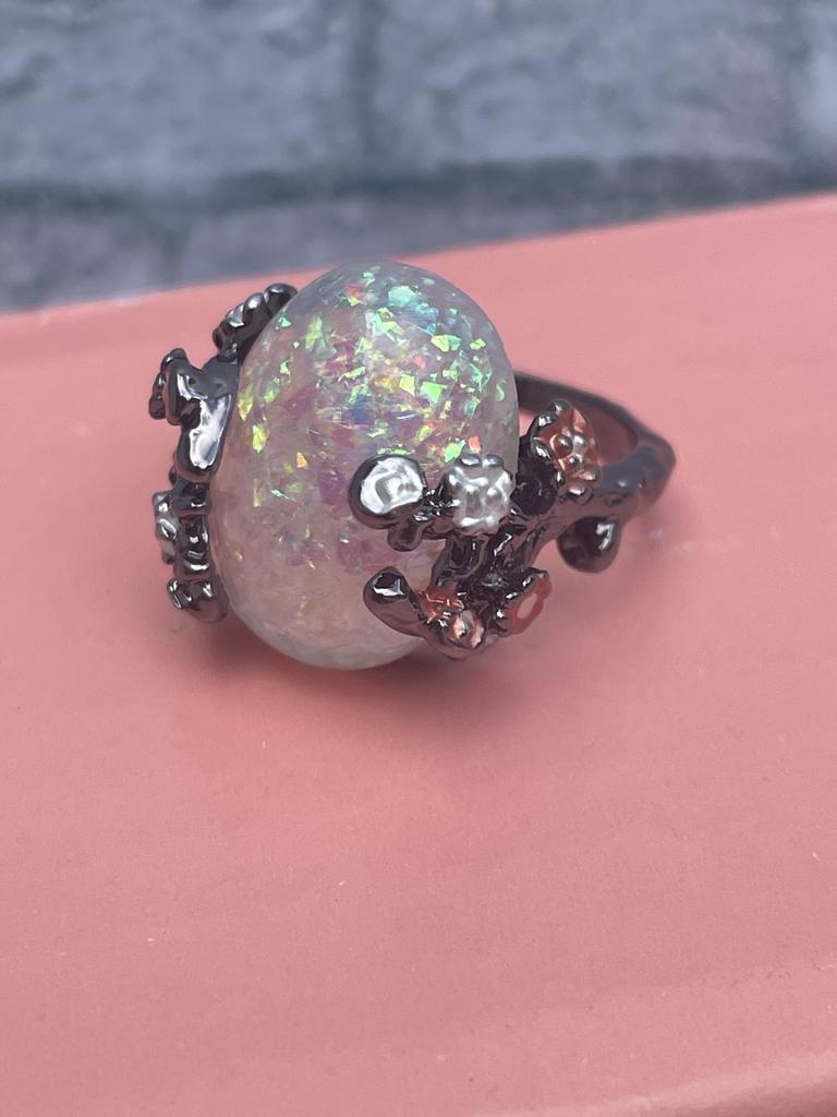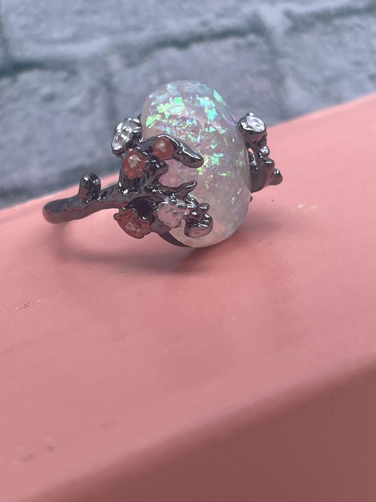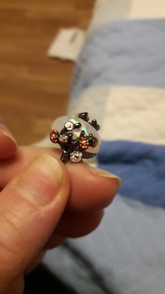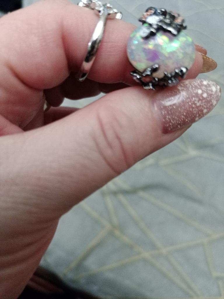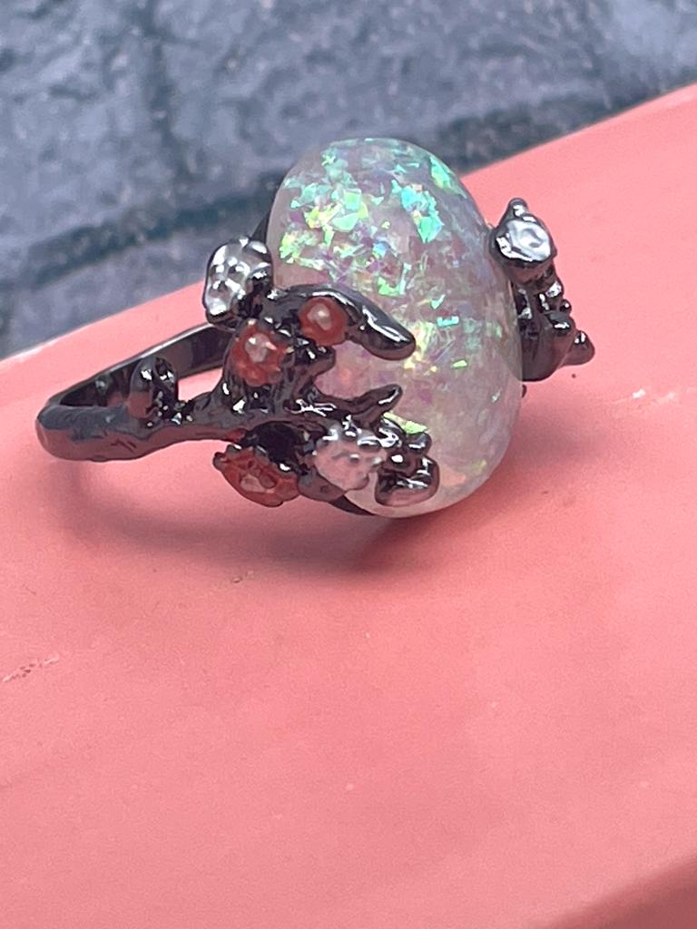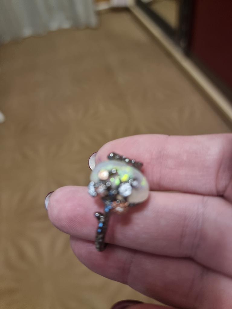 The ring is beautiful, the stone is like an opal, but one flower is broken, it's a pity. It was packed well. It looks like it was already broken.
