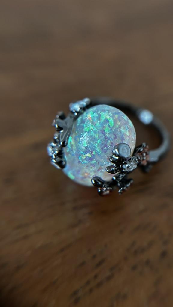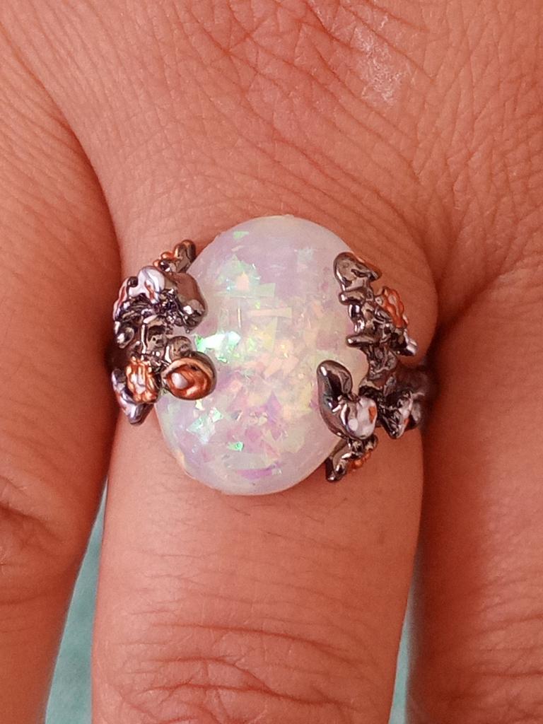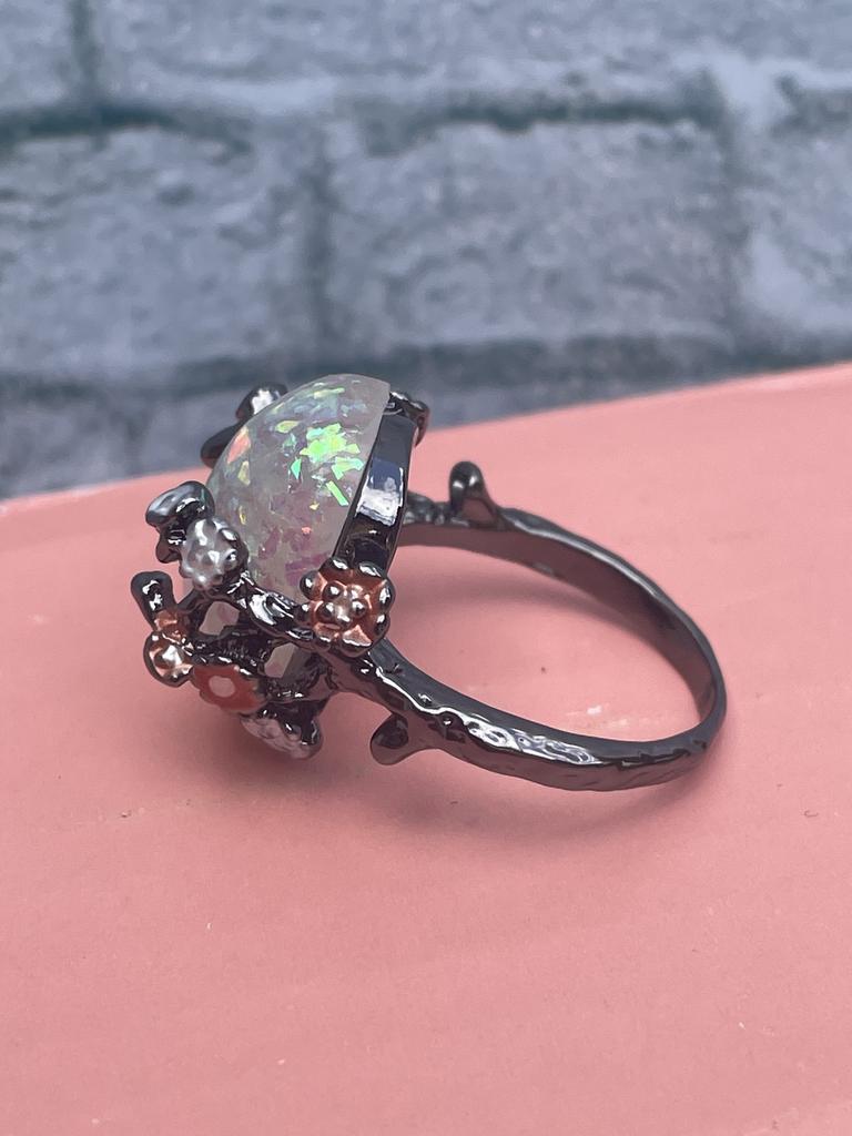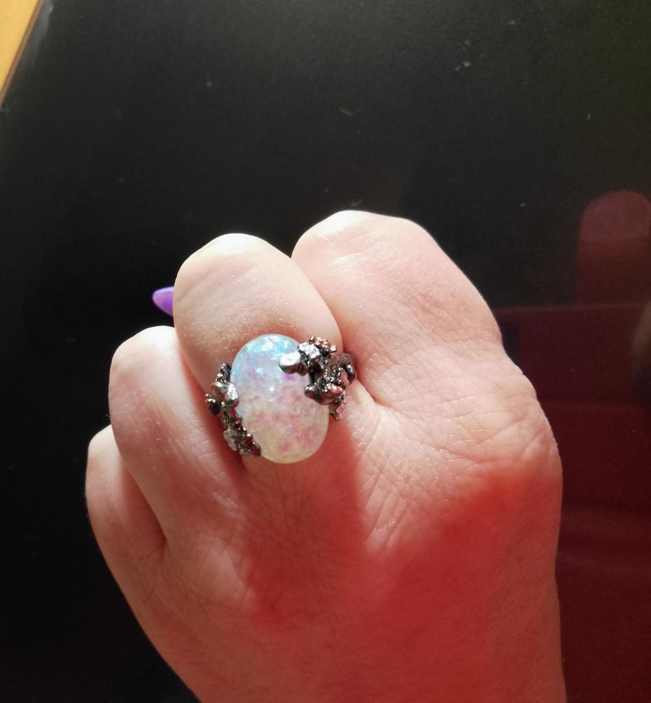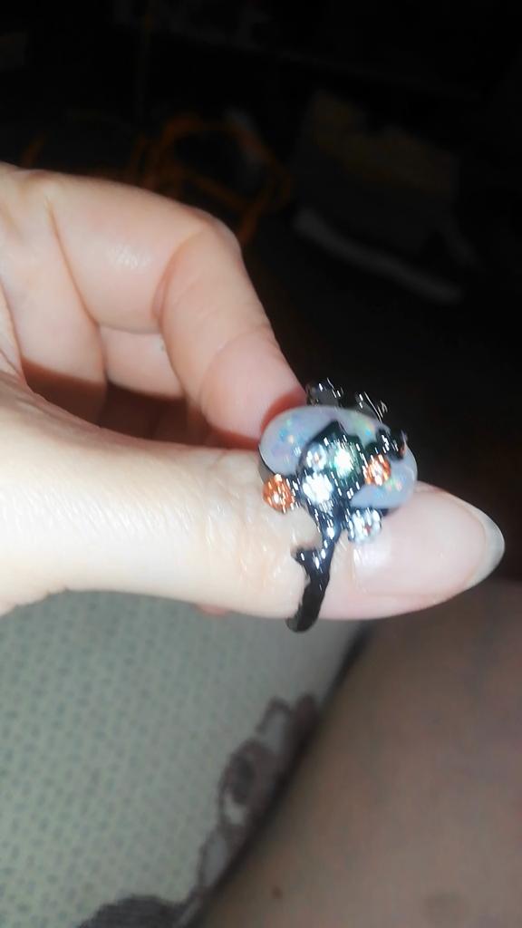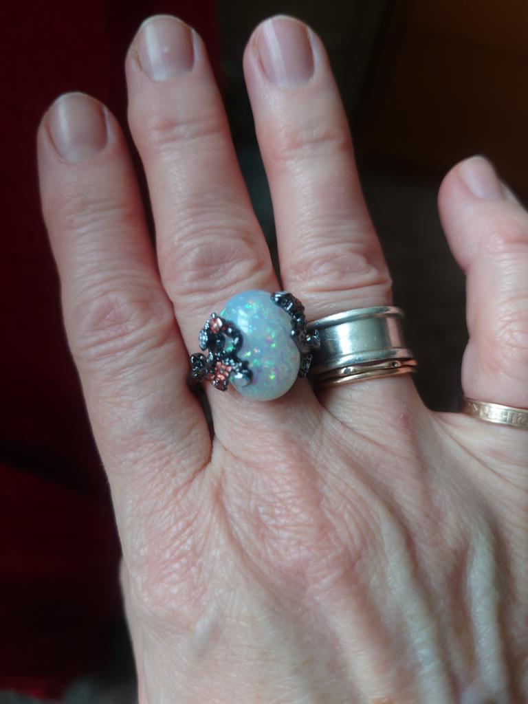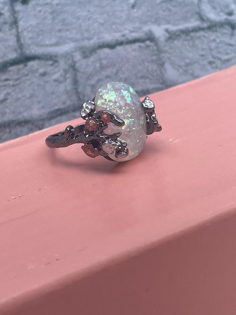 The ring is beautiful, the stone is like an opal, but one flower is broken, it's a pity. It was packed well. It looks like it was already broken.