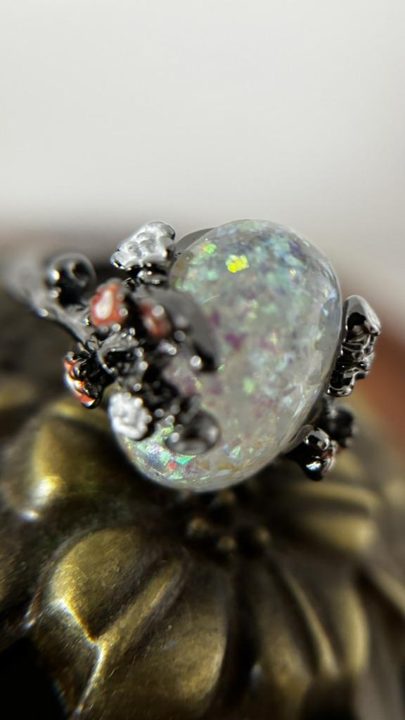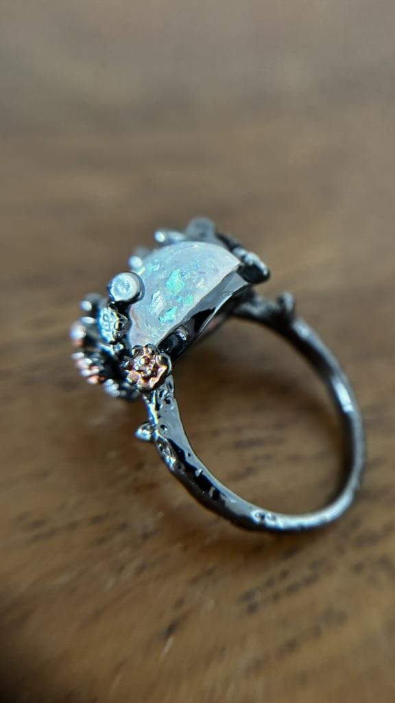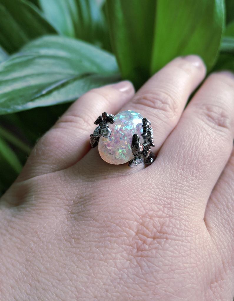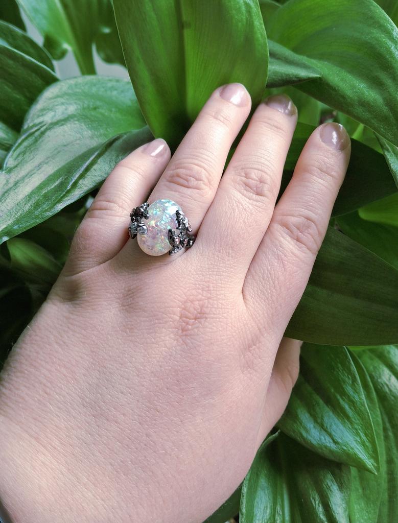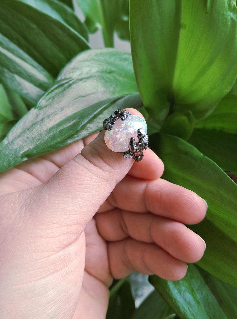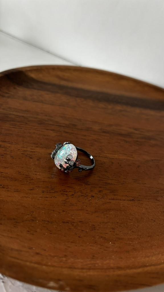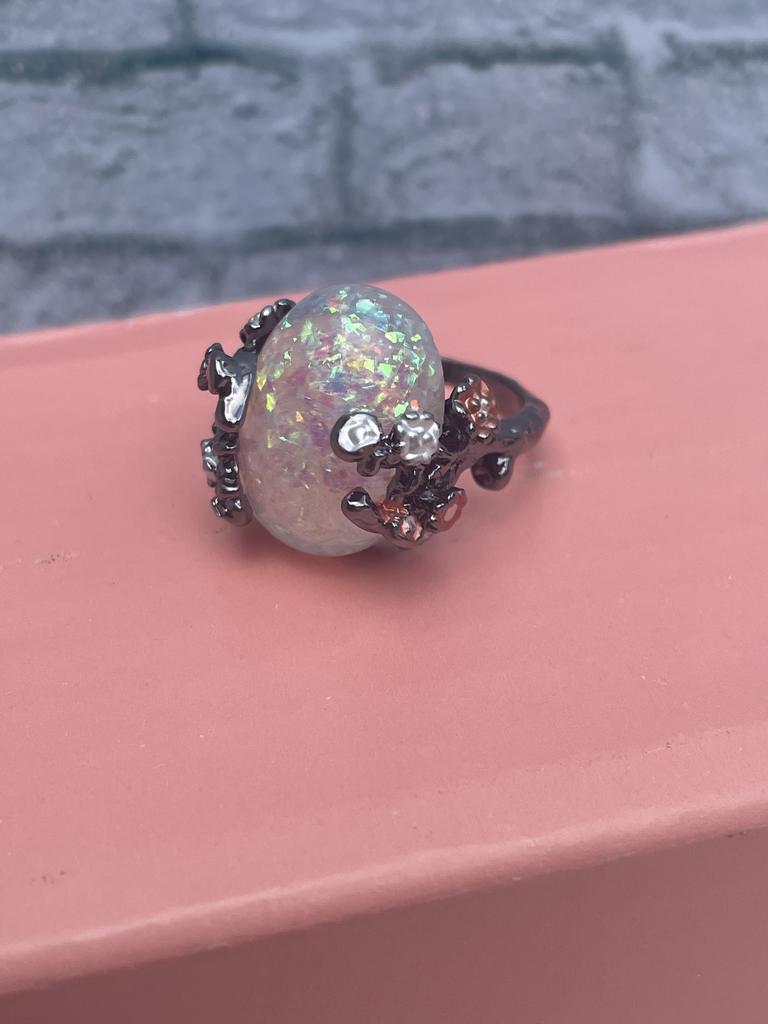 The ring is beautiful, the stone is like an opal, but one flower is broken, it's a pity. It was packed well. It looks like it was already broken.