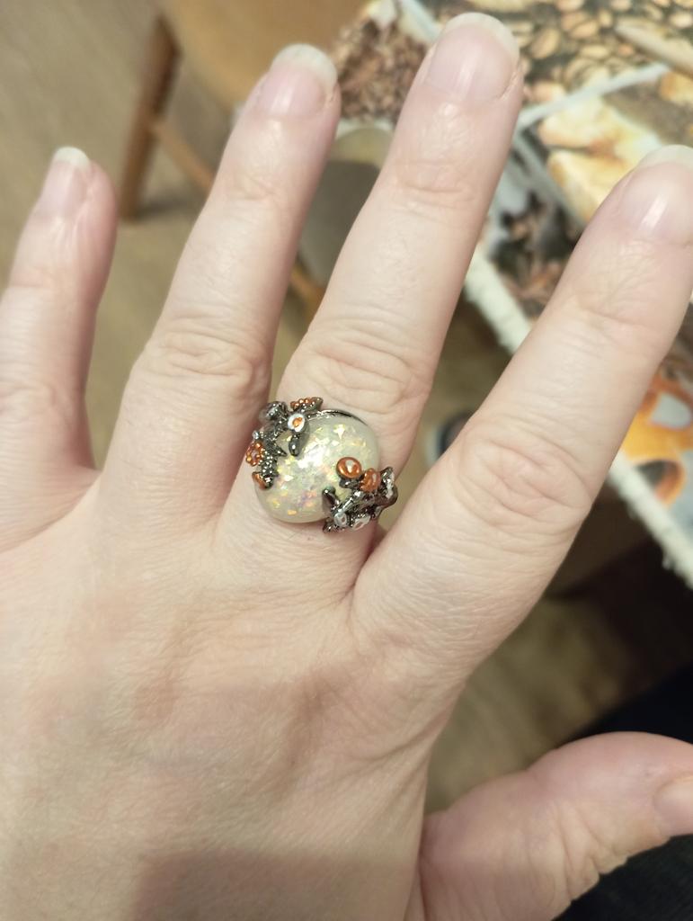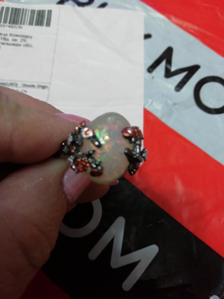 Ring with a stone, shining from the inside. Chose size 8. My finger size is 18. A little big. The ring is interesting: a shimmering stone is framed by flowers and branches. Made neat. Jewelry lovers will like it.