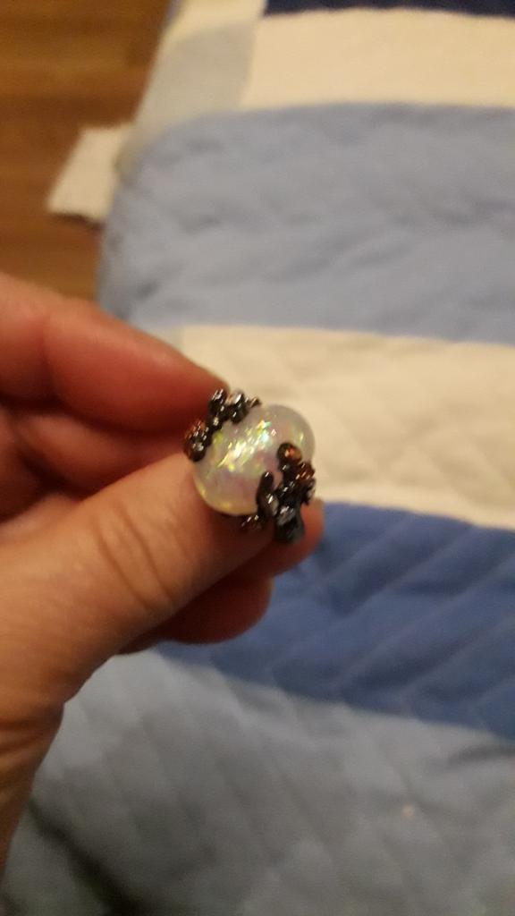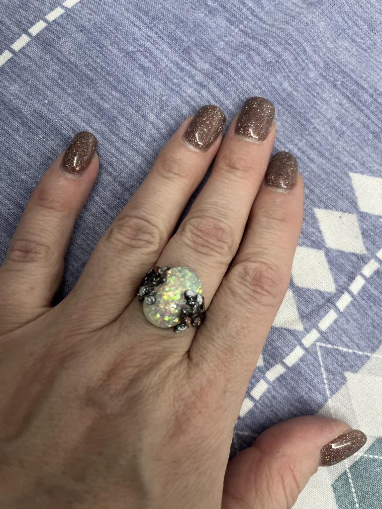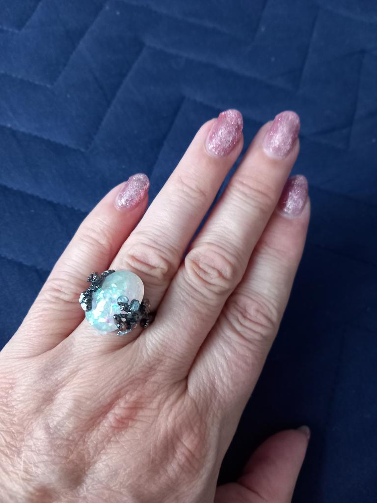 Pebble made of epoxy resin with glitter, the ring itself is cool, it will do for a change.
